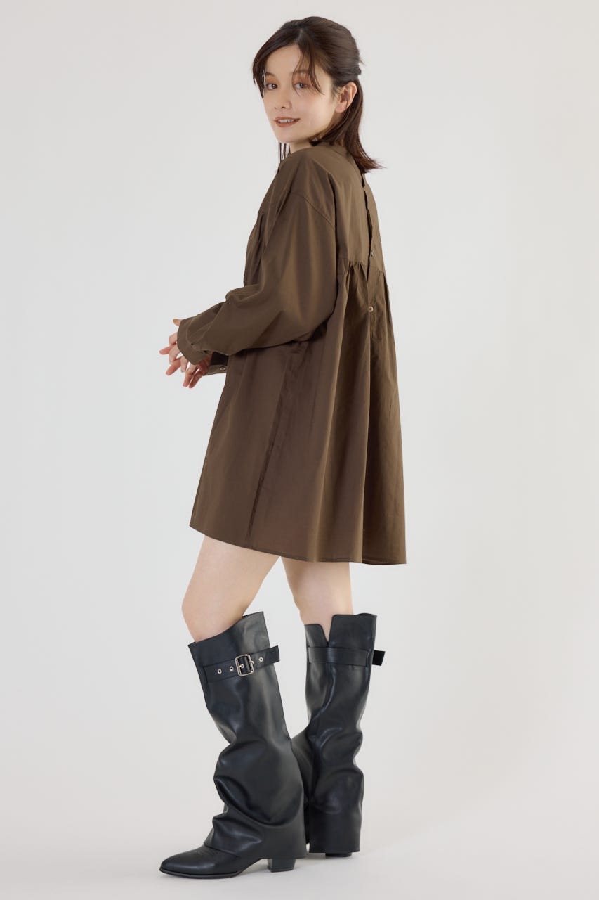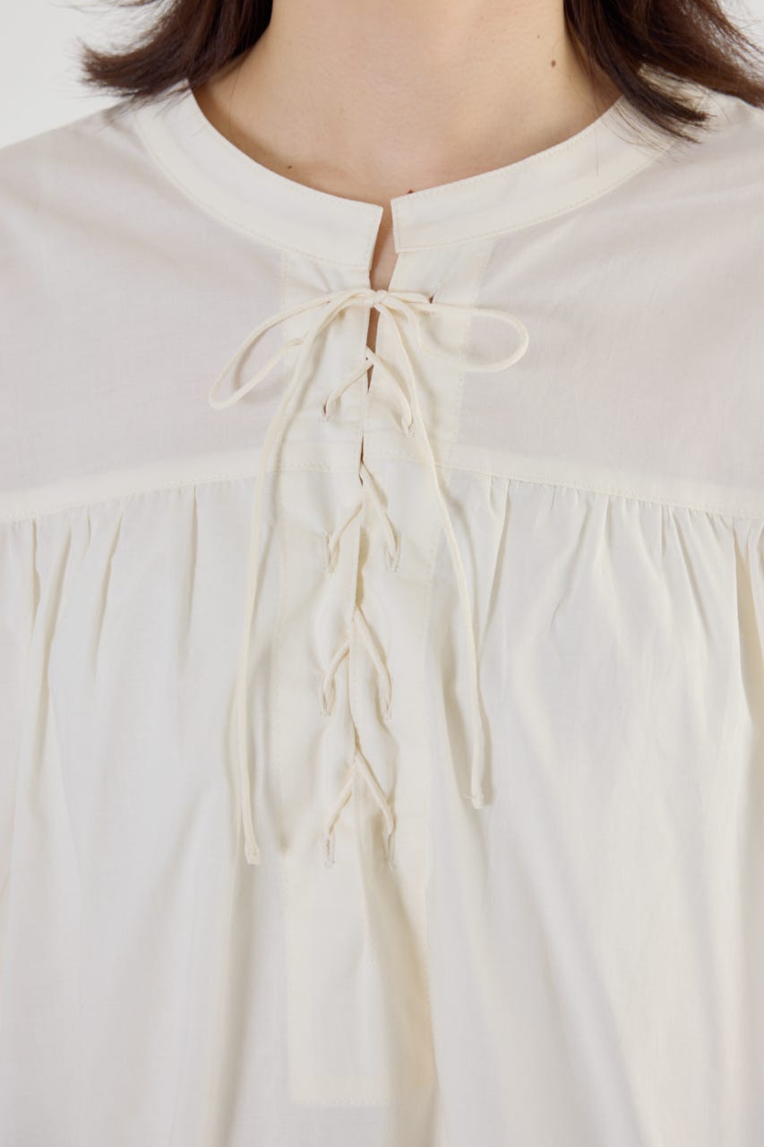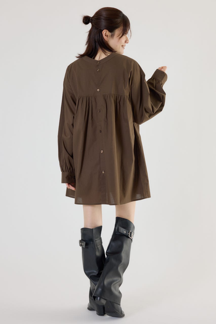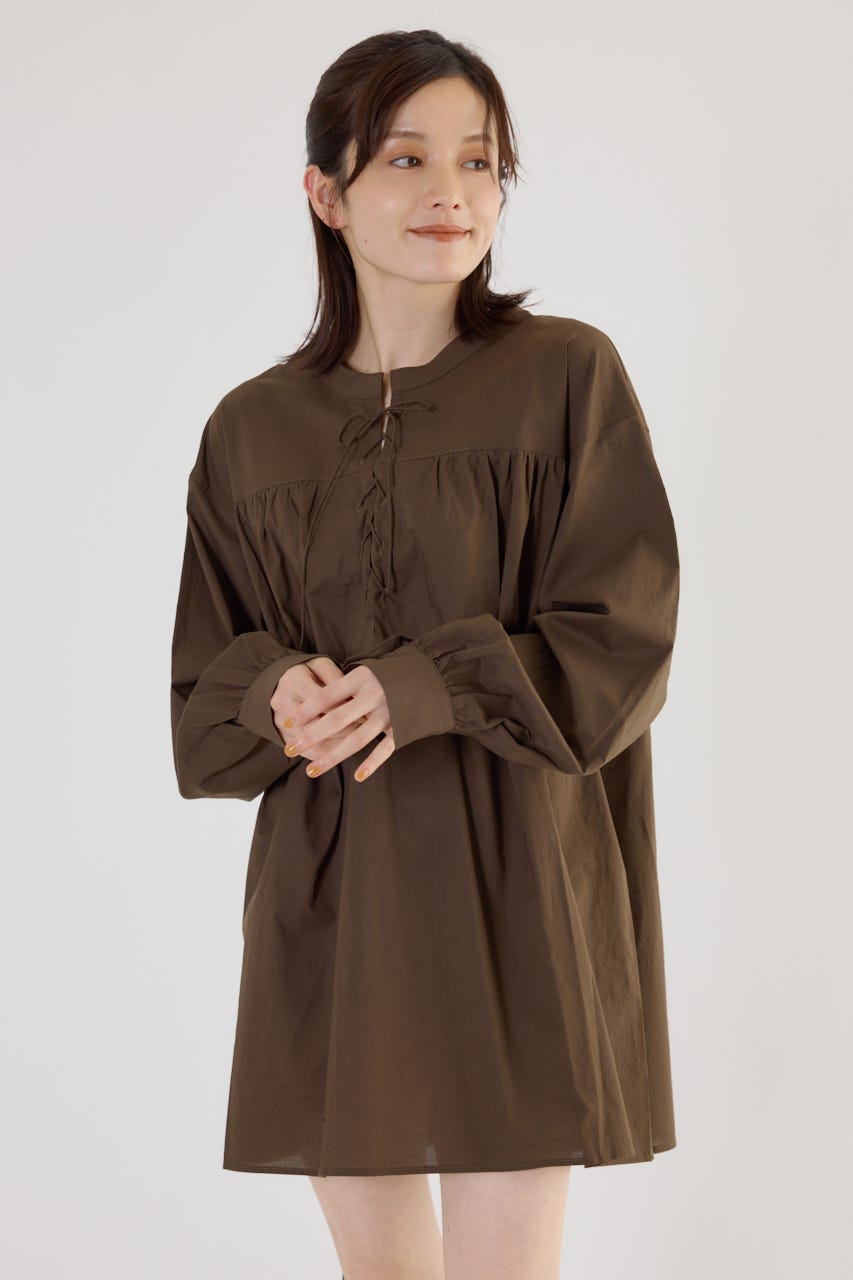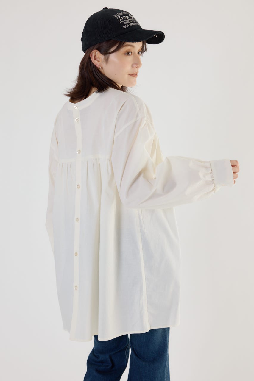身頃はギャザーでゆったりシルエット、袖口はギャザーを入れたボリュームスリーブです。