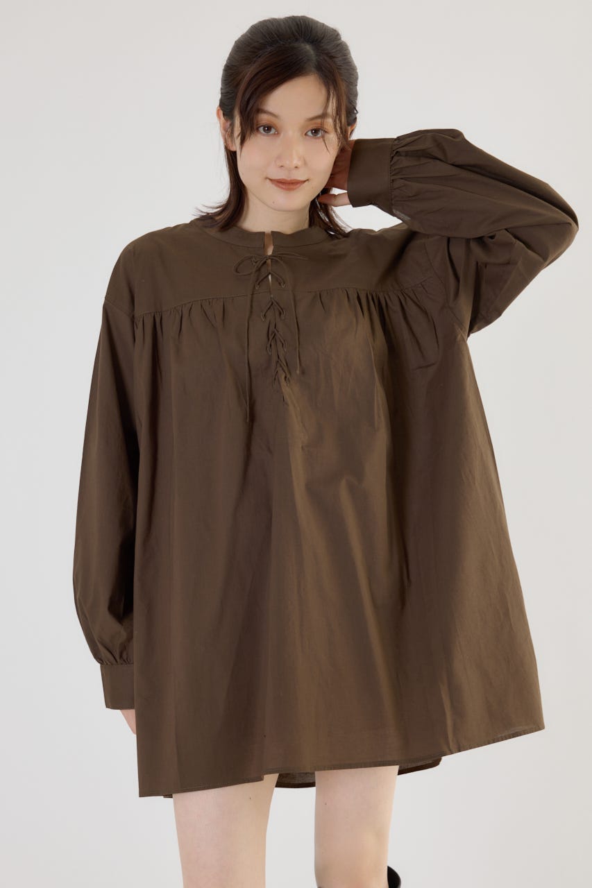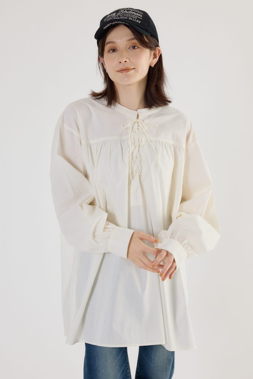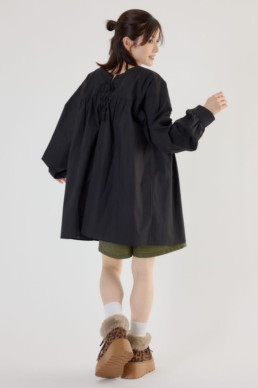 前後2WAYでレースアップを前でブラウスとしても、前開きのほうを前にして着用すれば羽織としても着れる万能アイテム。