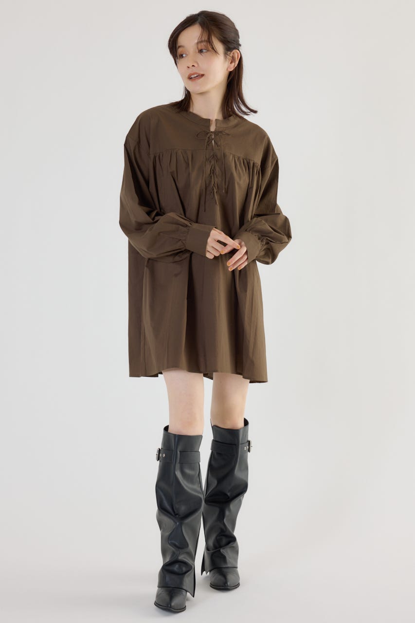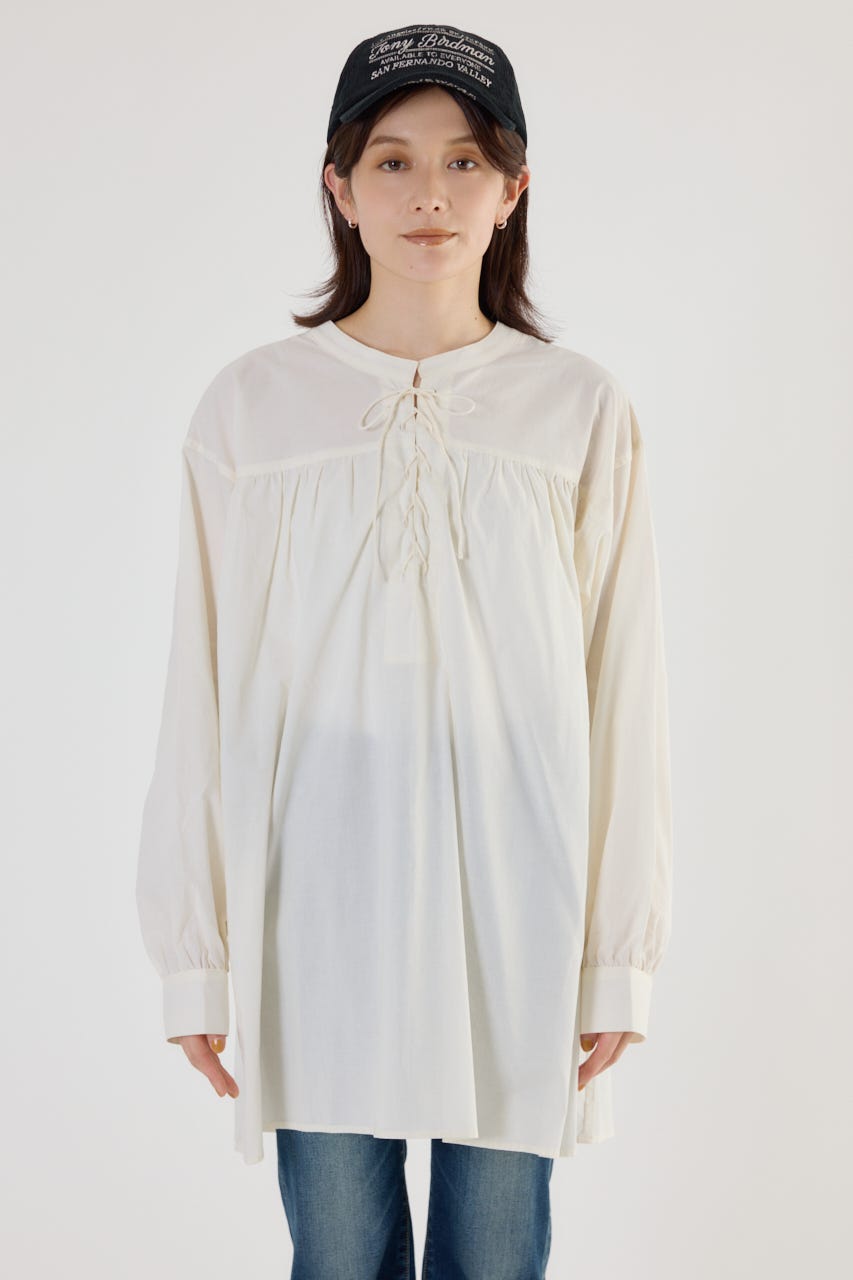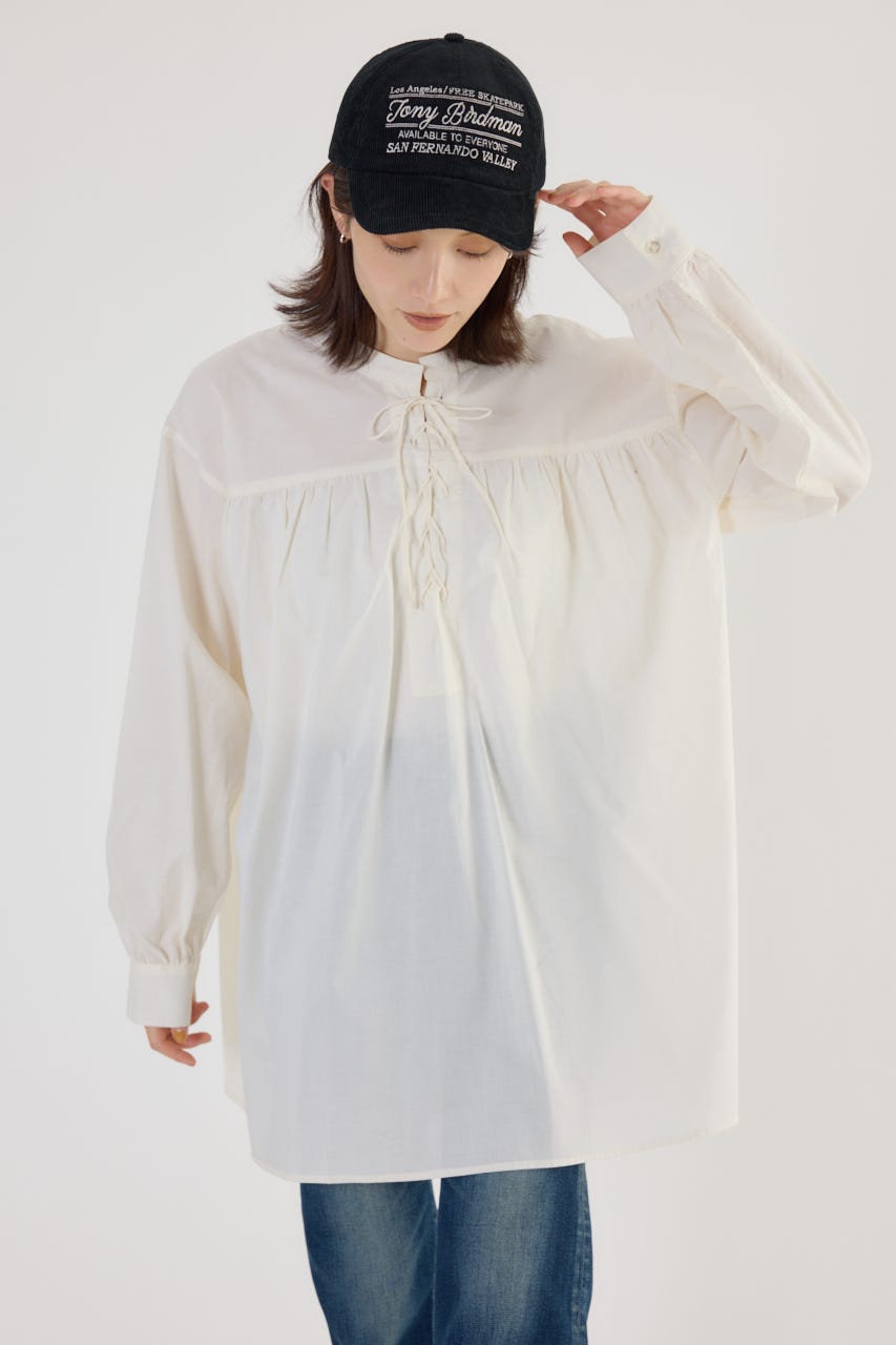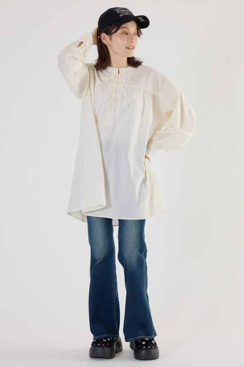 前後2WAYでレースアップを前でブラウスとしても、前開きのほうを前にして着用すれば羽織としても着れる万能アイテム。