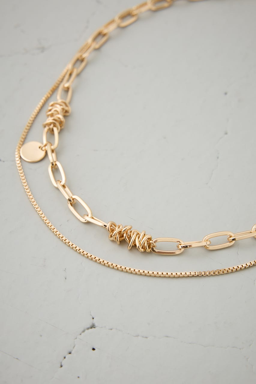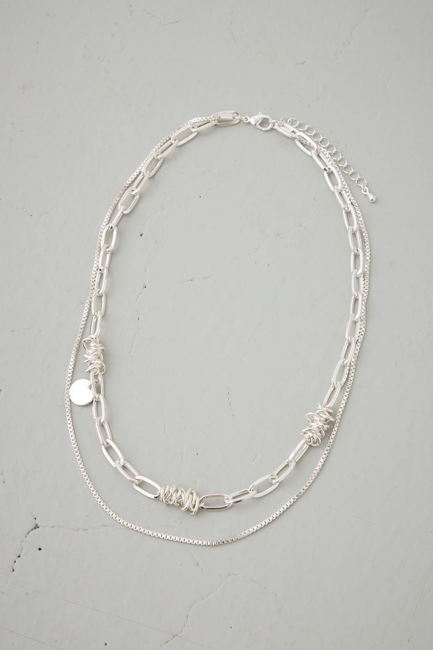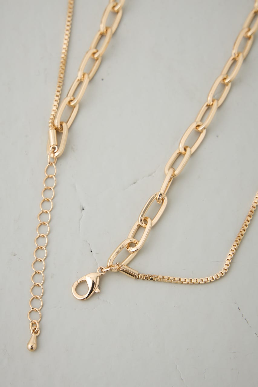 大ぶりのオーバルチェーンと、繊細なボックスチェーンを組み合わせた2連ネックレス。