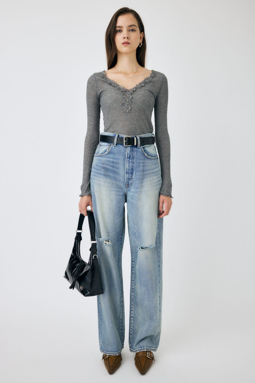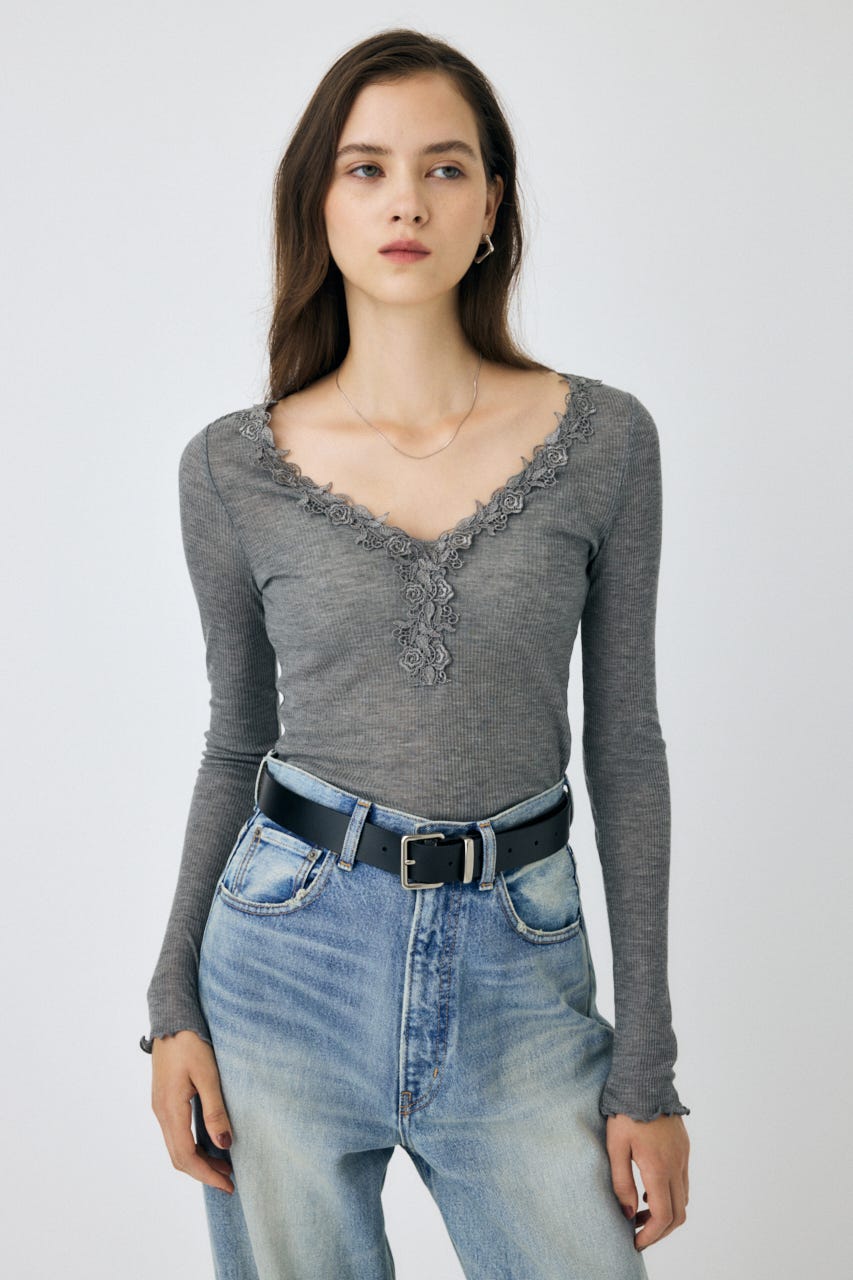 深めに開いたVネックには繊細なレーステープをあしらい、シンプルながらも華やかな印象に仕上げています。