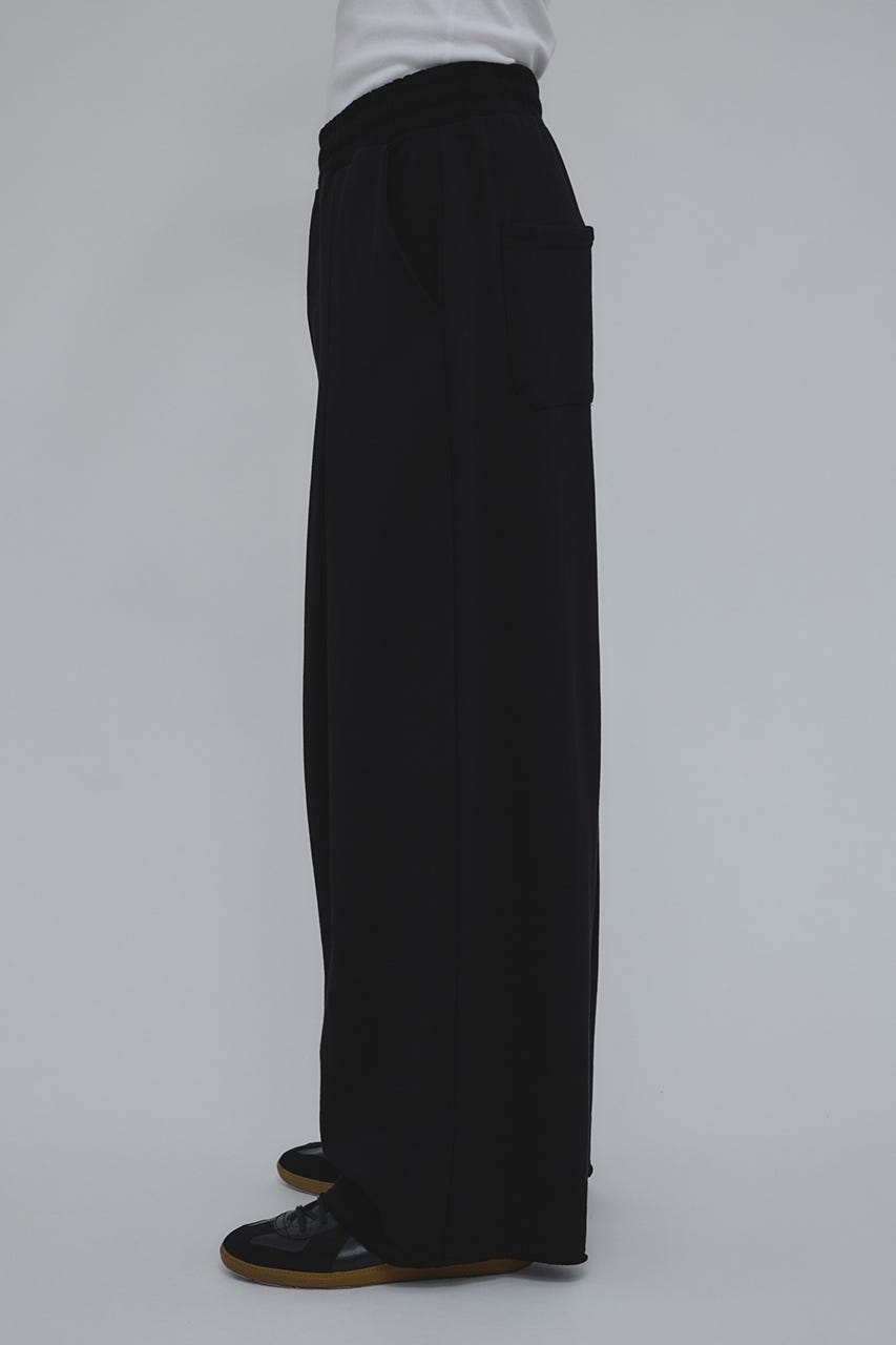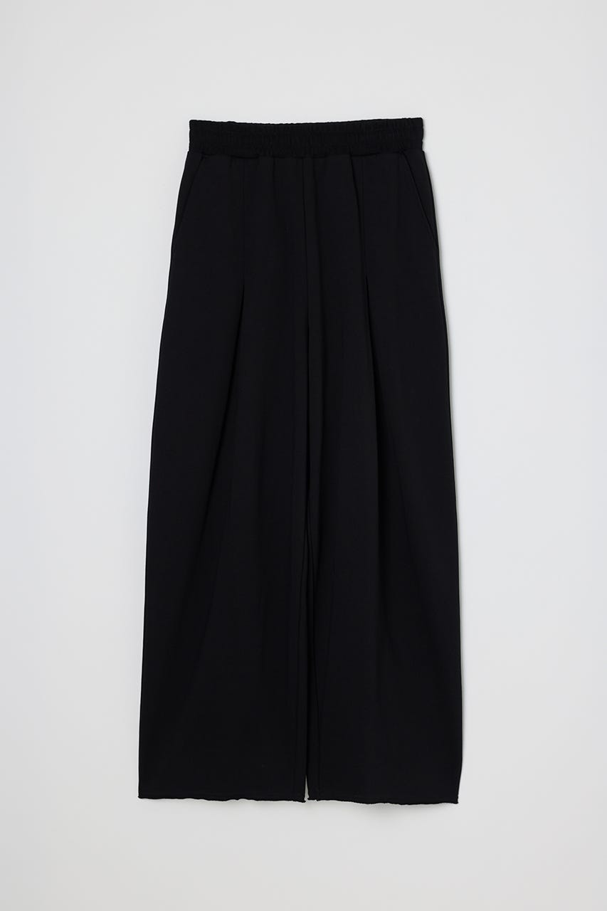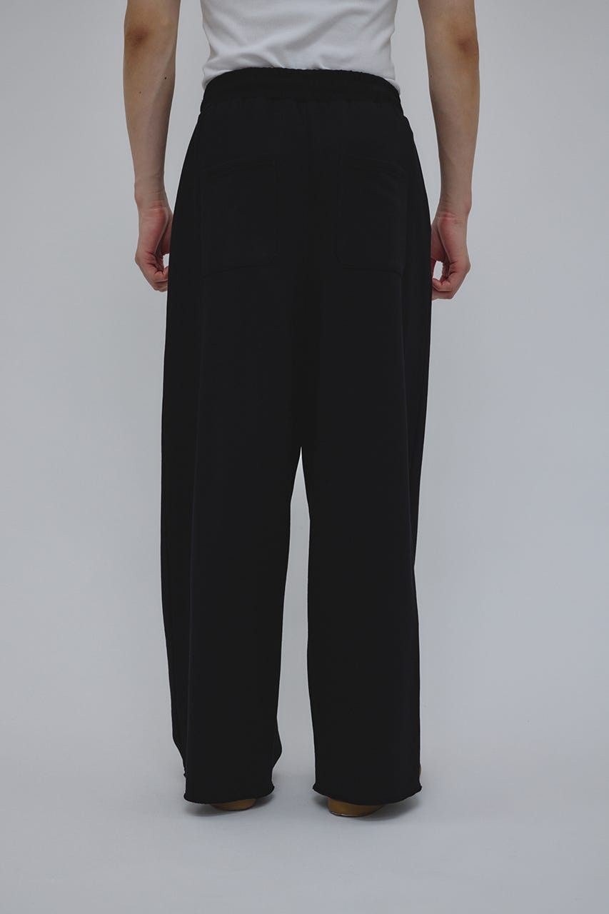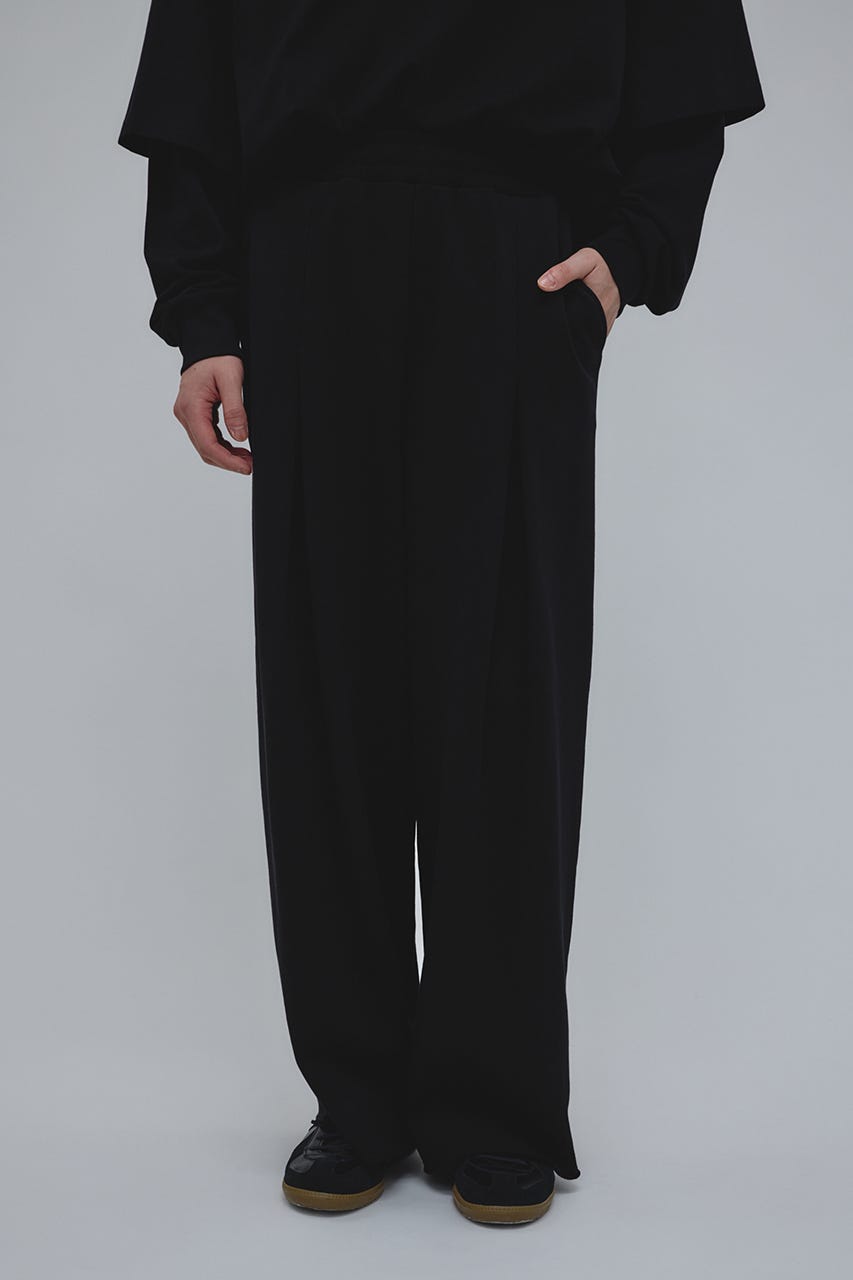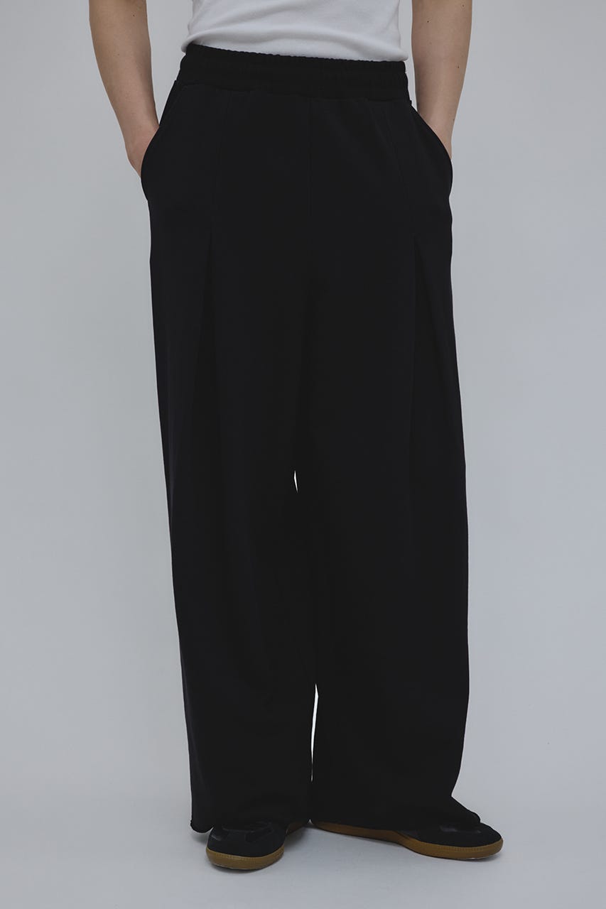 フロントに大きく施したタックとワイドなシルエットでドレープ感を前面に出したスウェットパンツ。