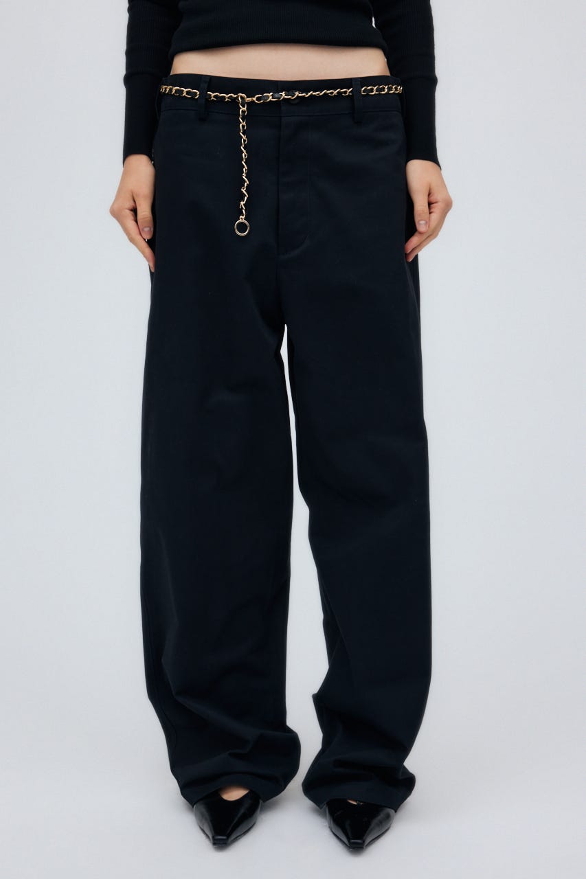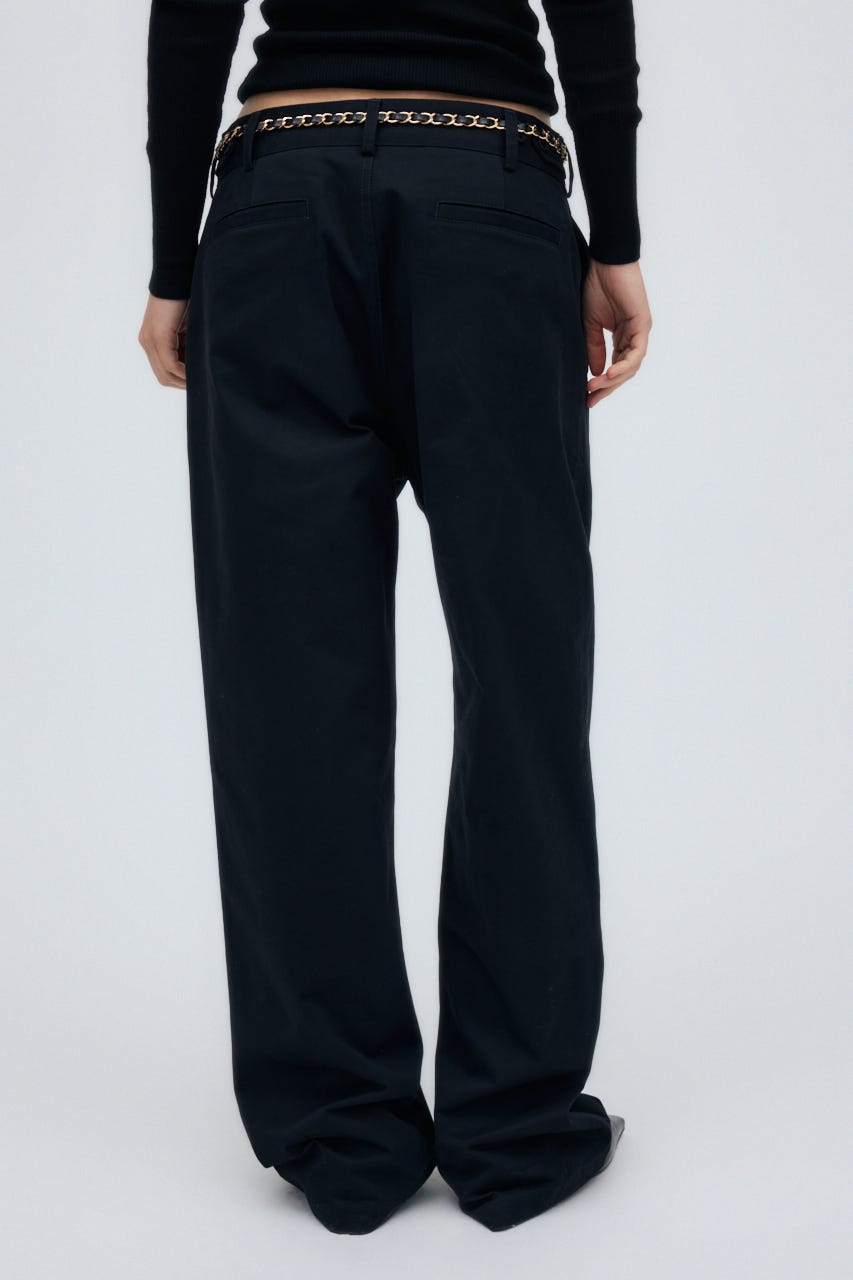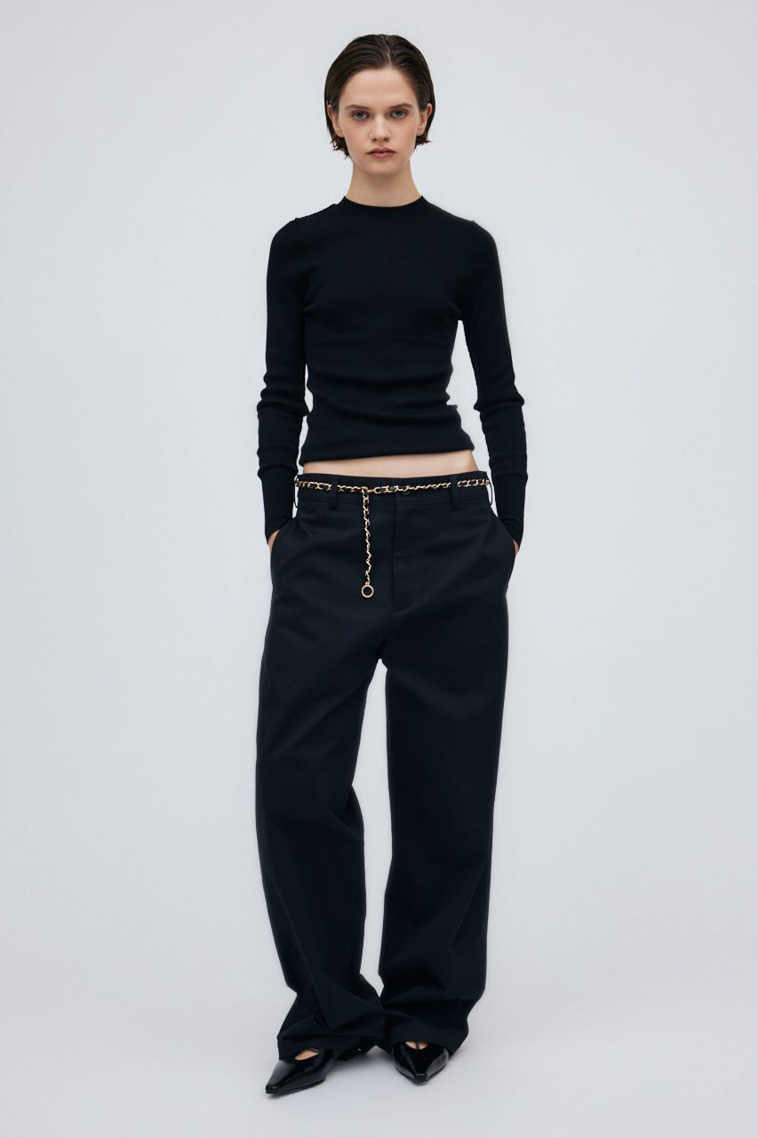 ゆとりのあるサイジングを程よく腰に落として、肌見せしたりとレディーライクな着こなしも楽しんで。