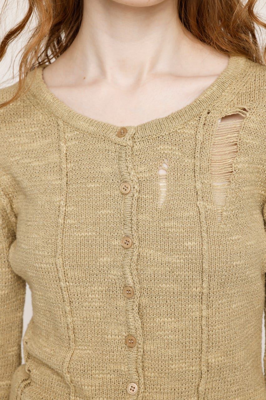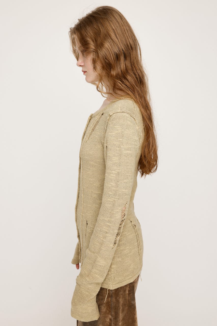 ■POINT:ヴィンテージ感あふれるランダムに入ったダメージと、裾のほつれ感がアクセントのクラッシュニット。