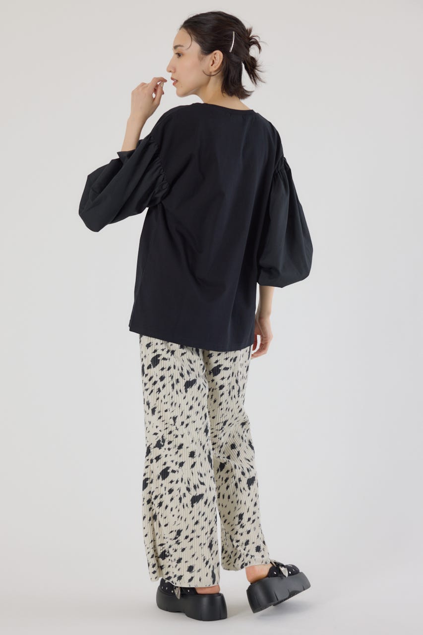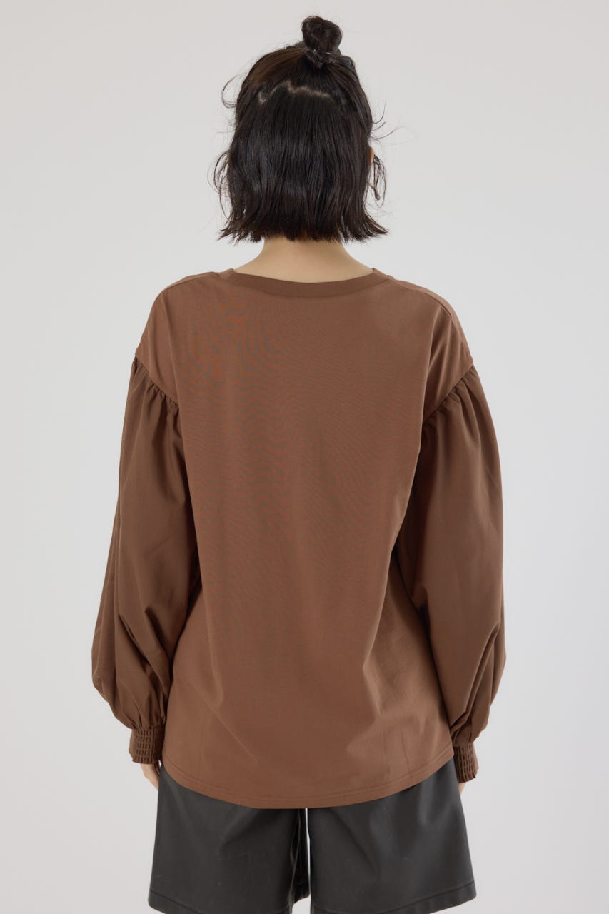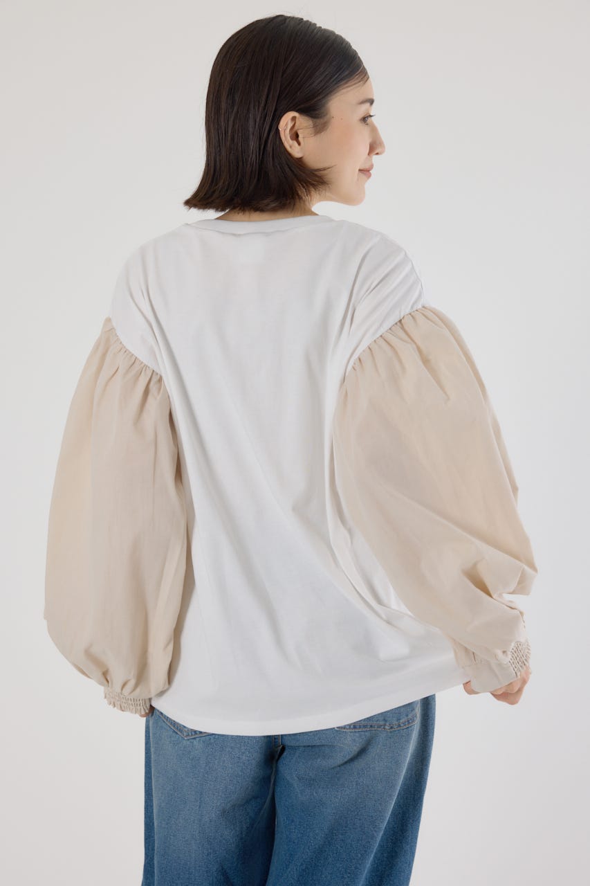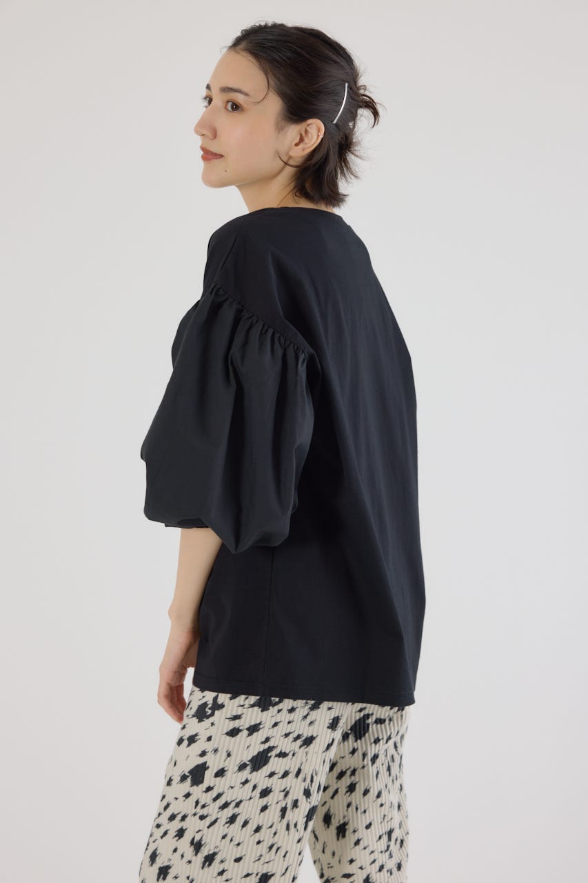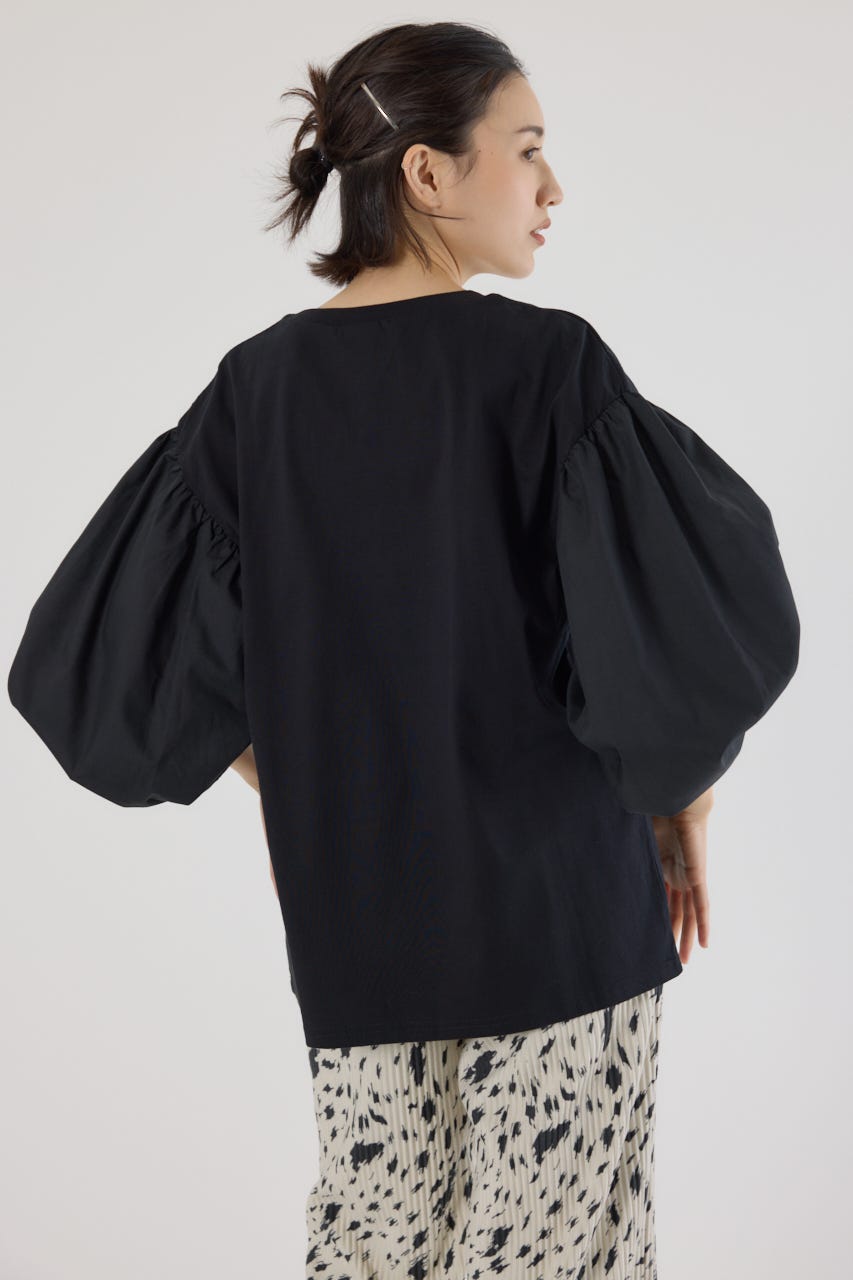 袖の布帛ドッキングのバルーンスリーブがかわいいトップス。