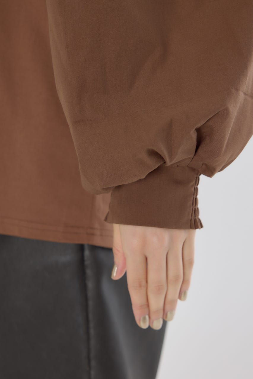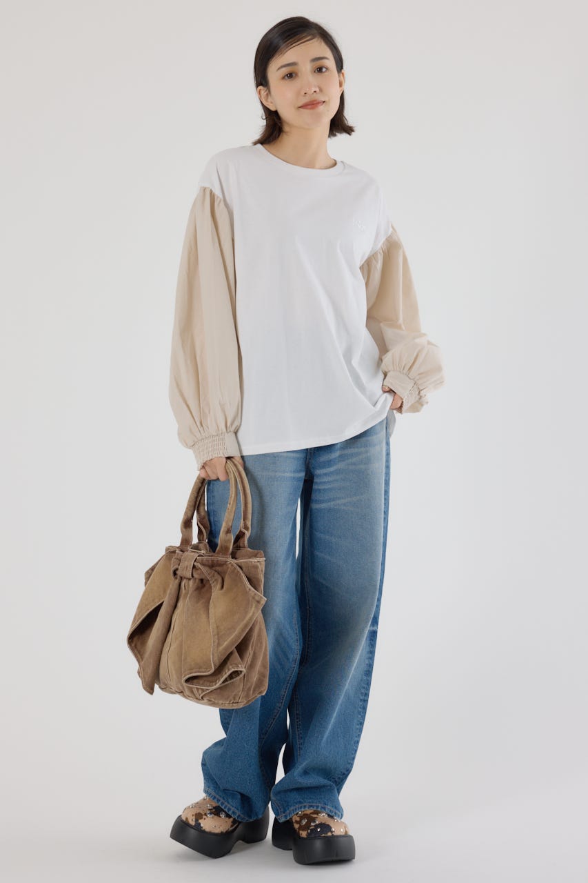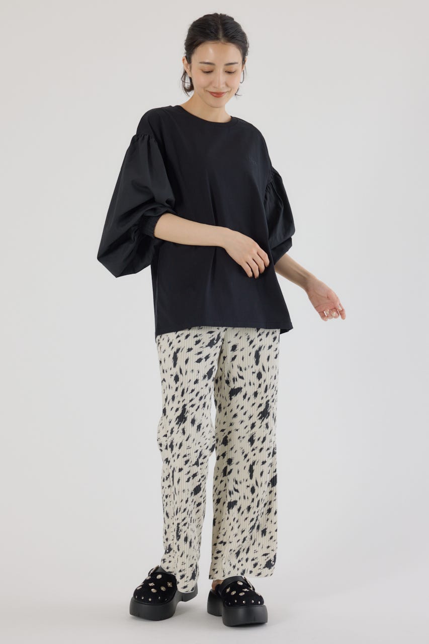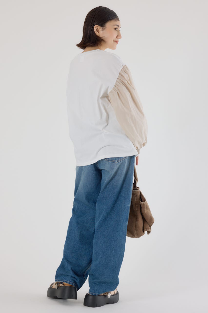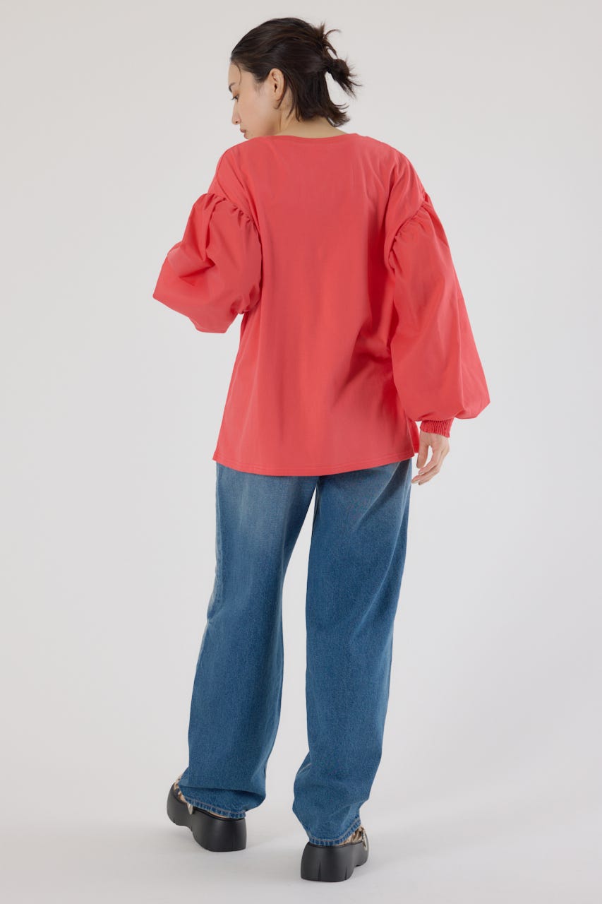 袖の布帛ドッキングのバルーンスリーブがかわいいトップス。