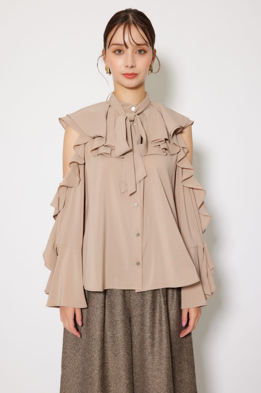 肩から袖口までたっぷりと施した存在感のあるラッフルフリルが目を惹くフェミニンなブラウスです。