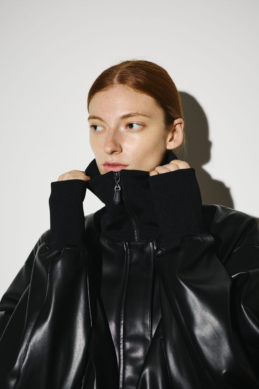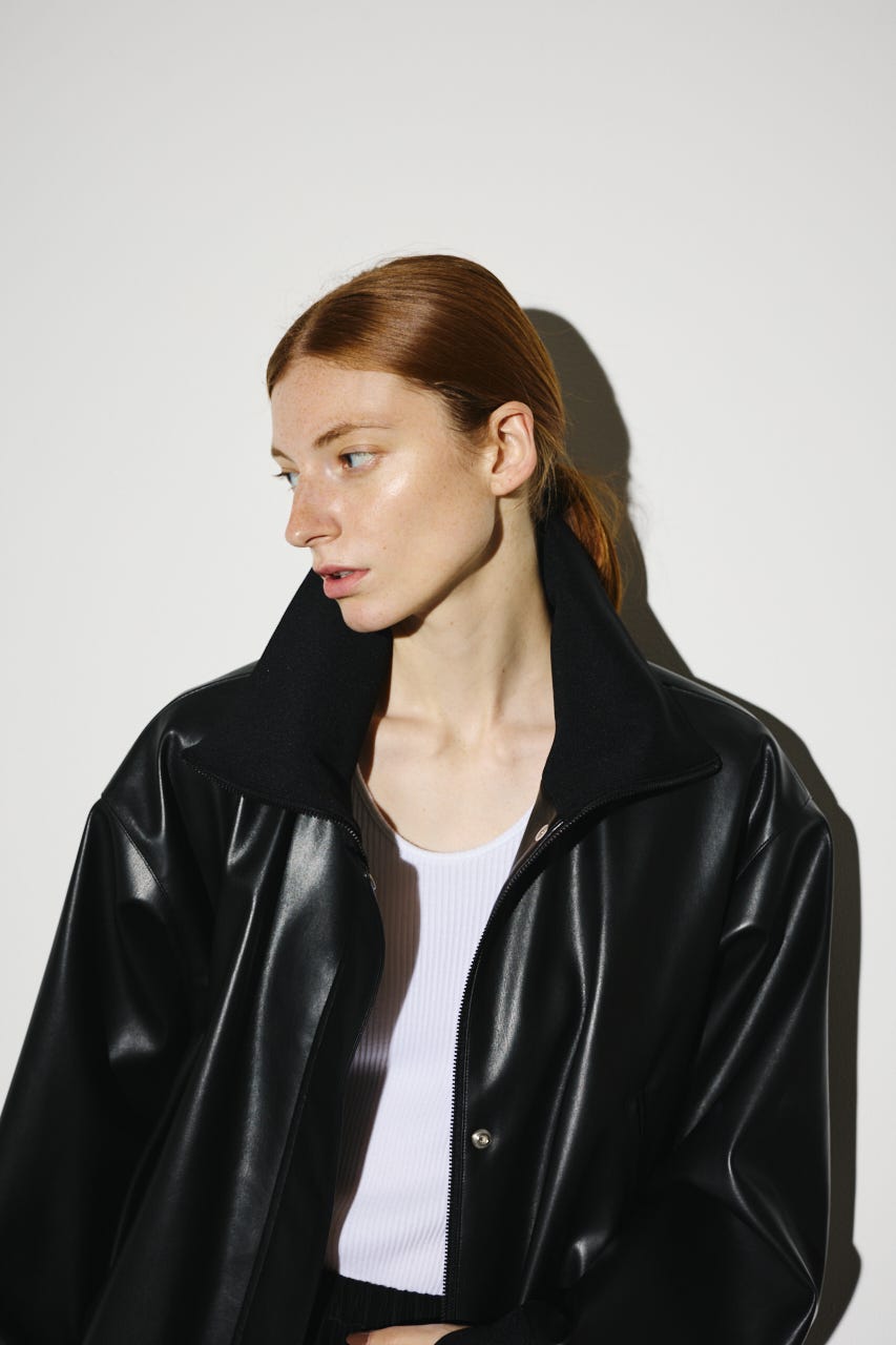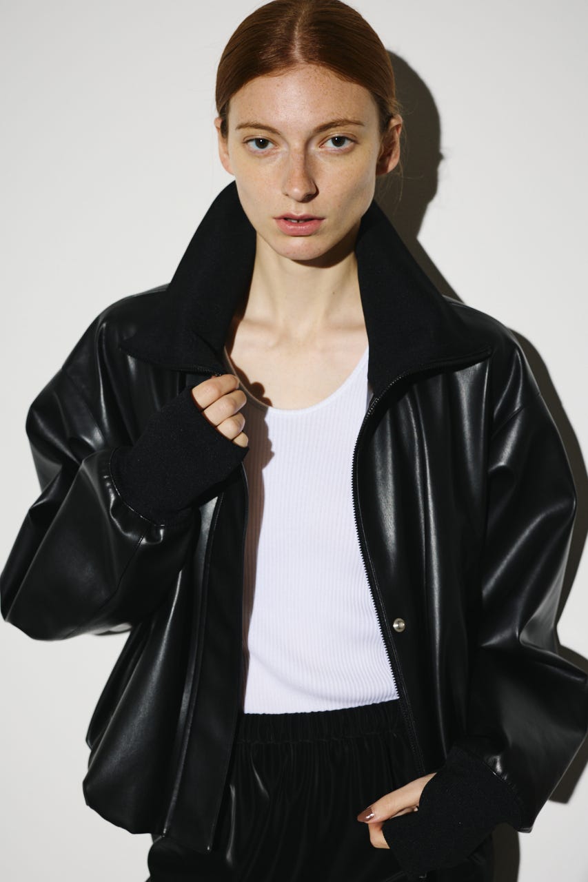 ■POINT:まるで本物のような質感と光沢感を持つフェイクレザーとリブをドッキングさせたジャケット。