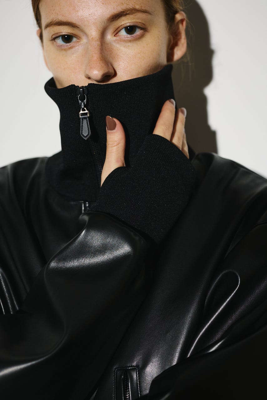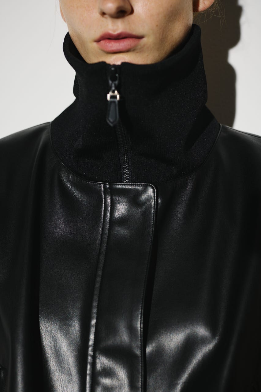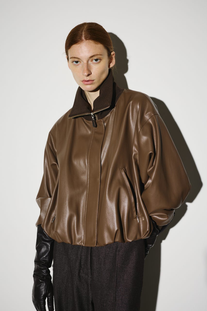 ■POINT:まるで本物のような質感と光沢感を持つフェイクレザーとリブをドッキングさせたジャケット。