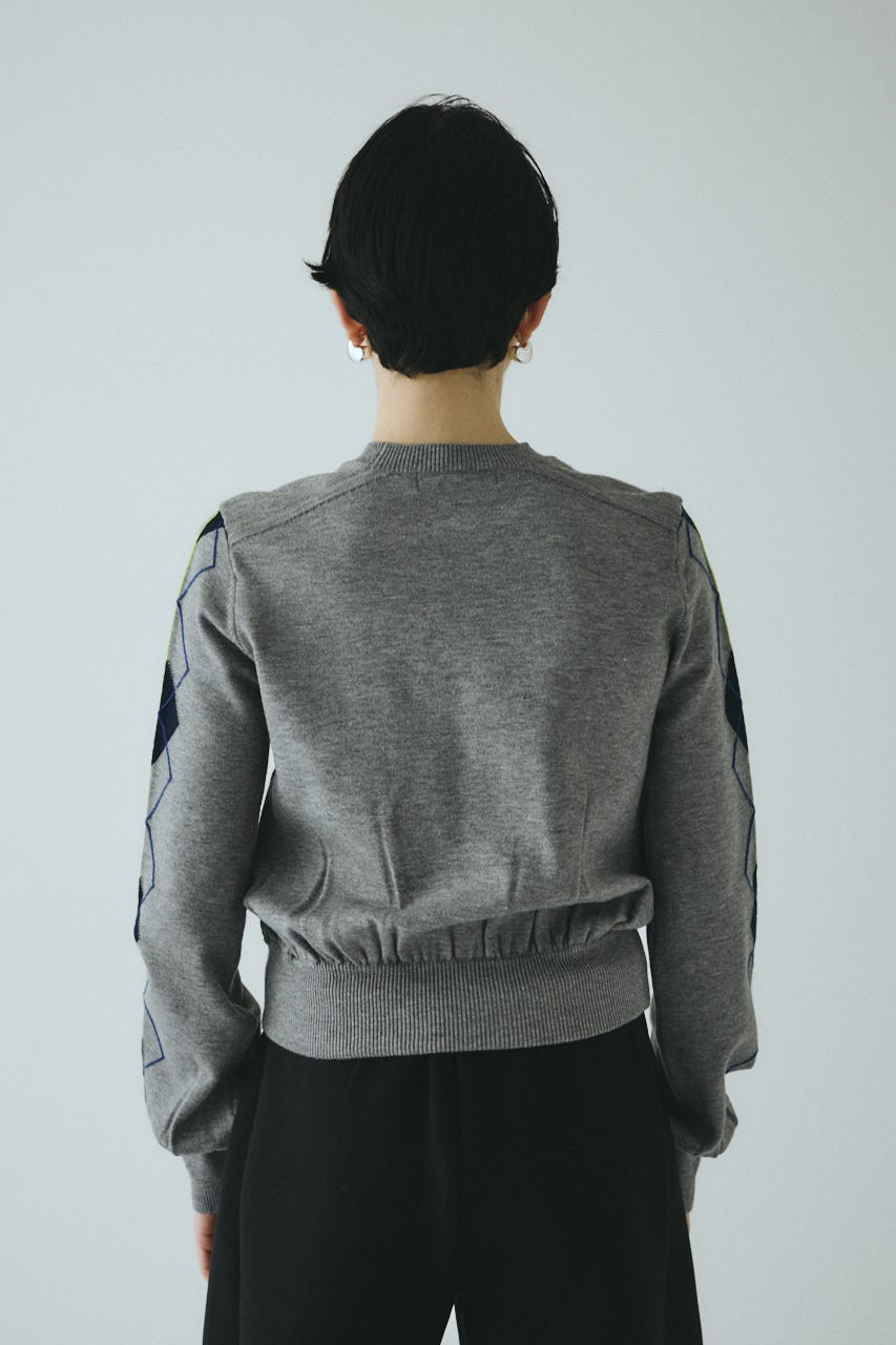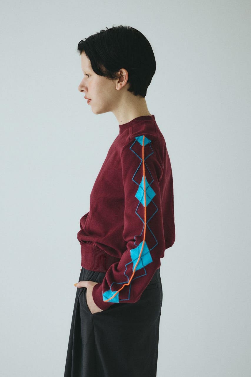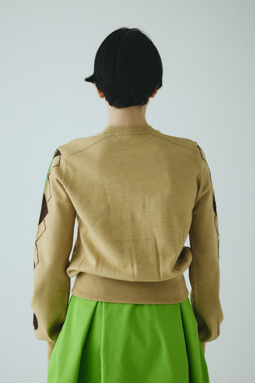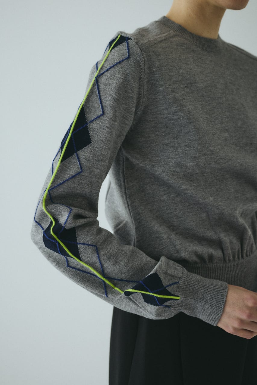 袖のアーガイル柄がHeRINらしい配色のニットトップス