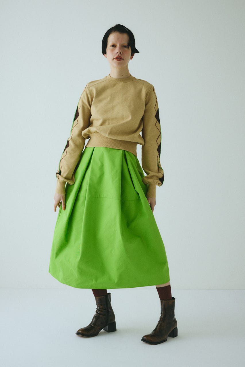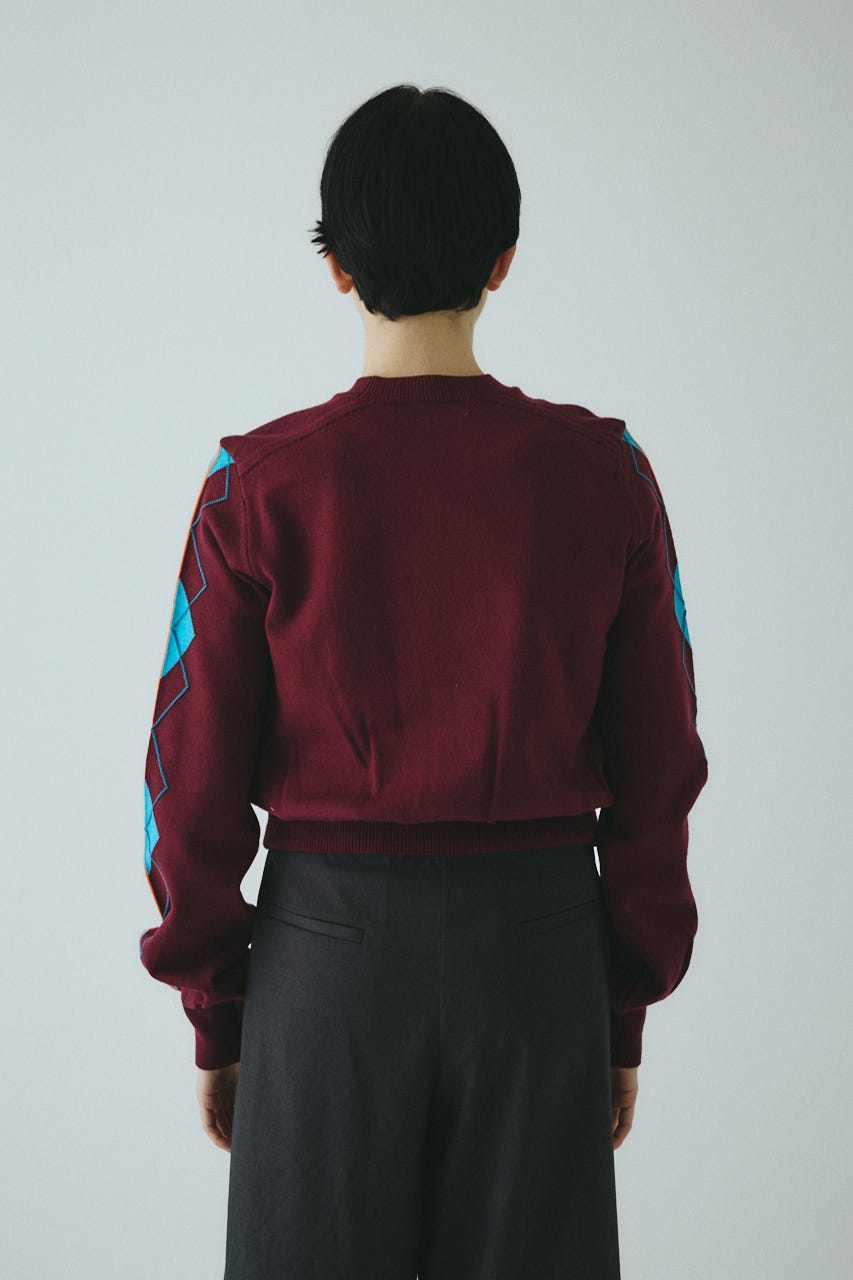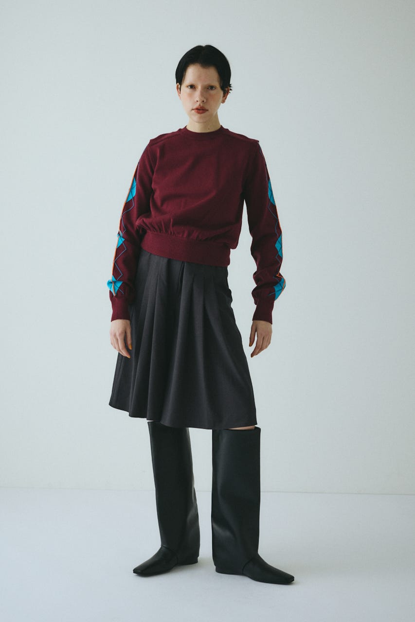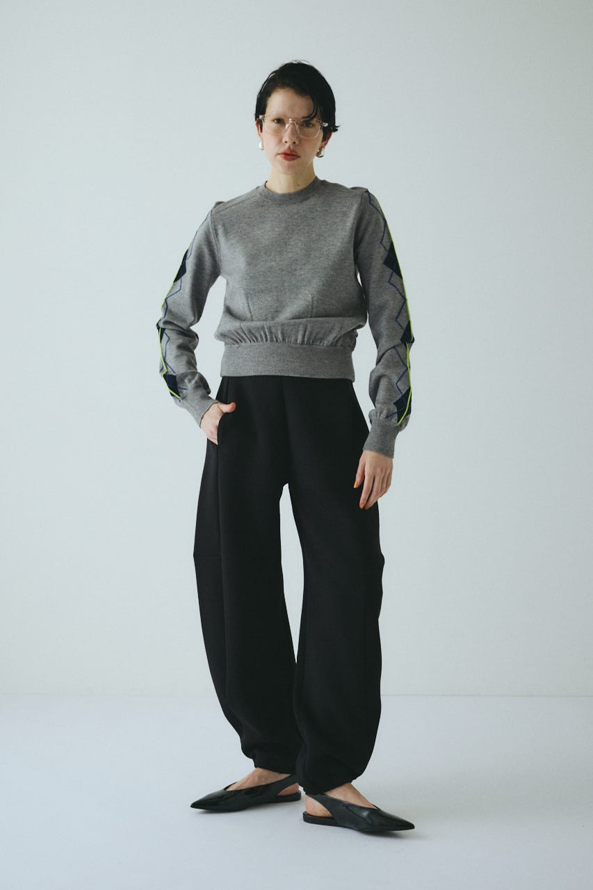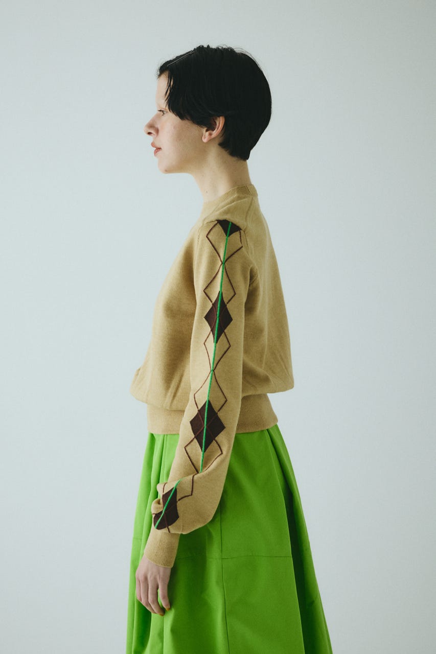 袖のアーガイル柄がHeRINらしい配色のニットトップス