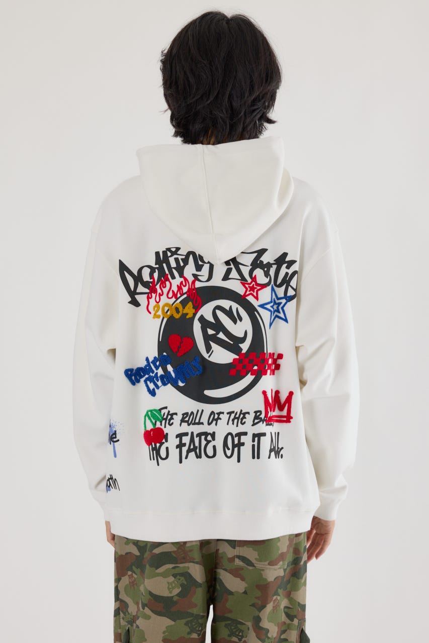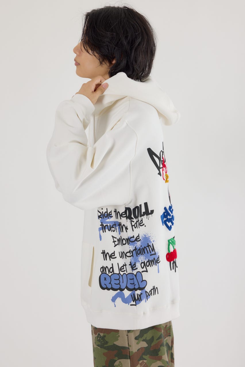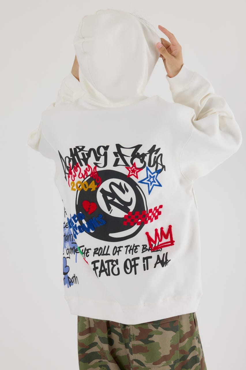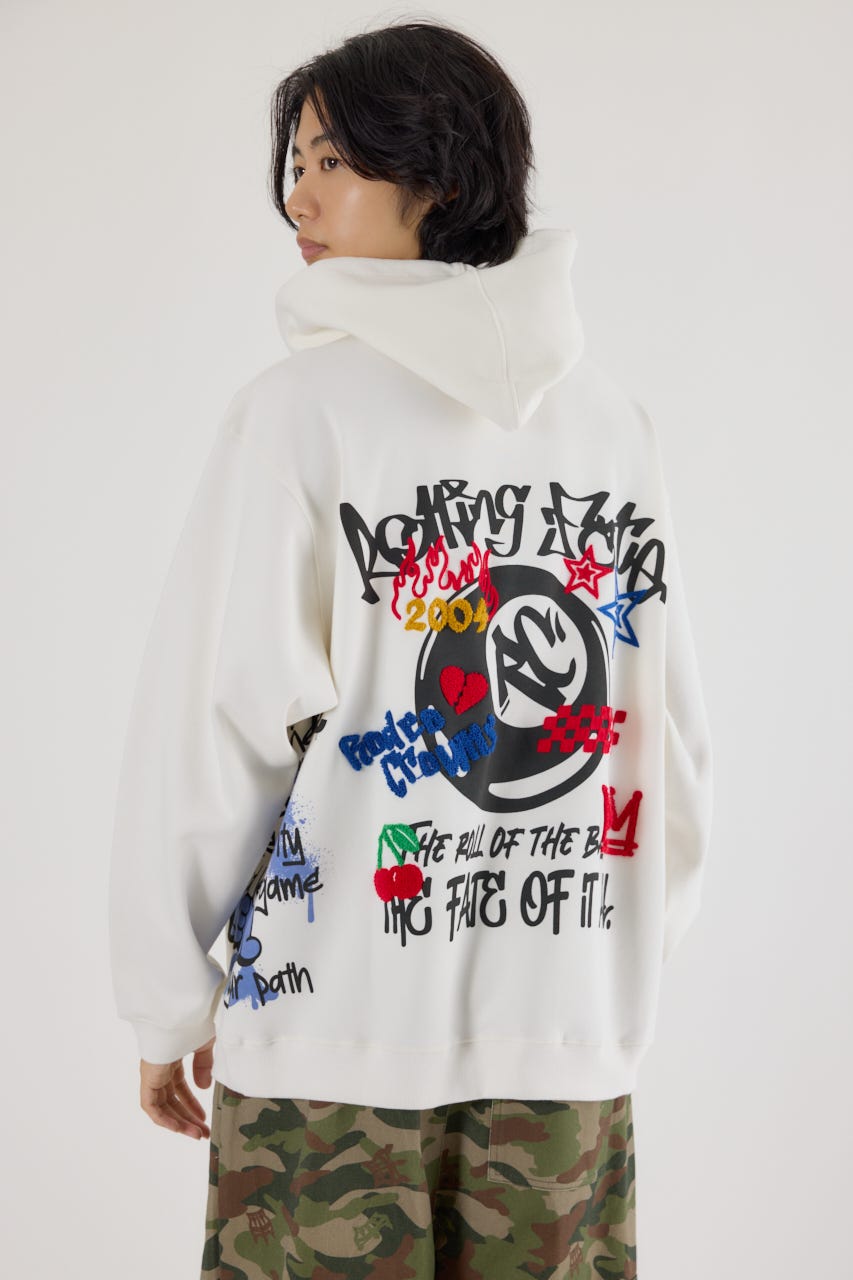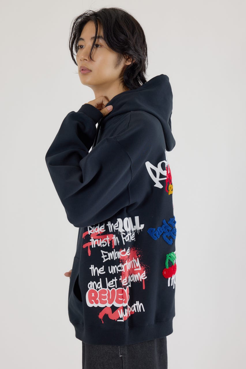様々な刺繍テクニックをプリントと組み合わせたグラフィックが印象的なスウェットパーカー。