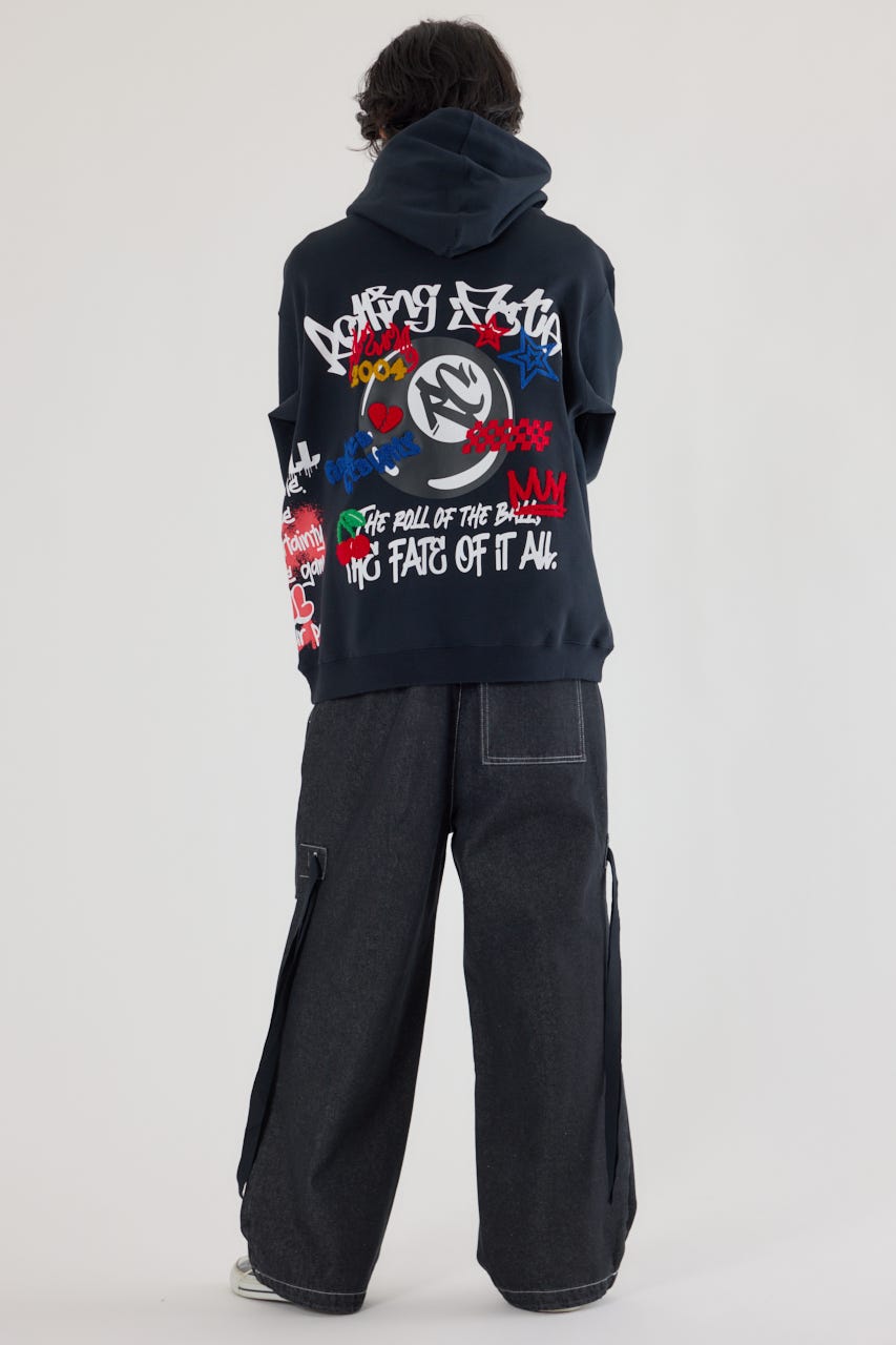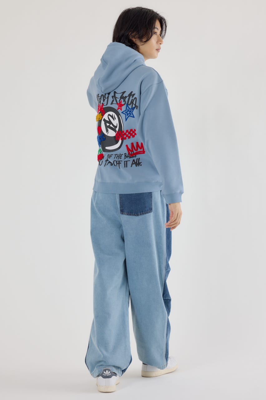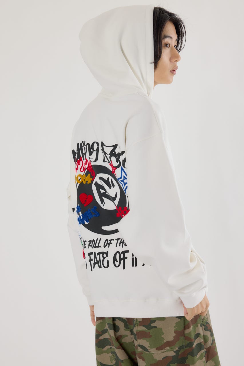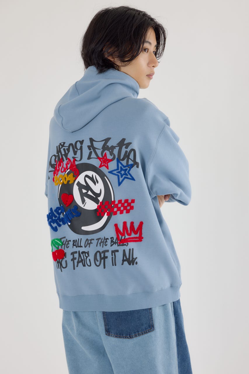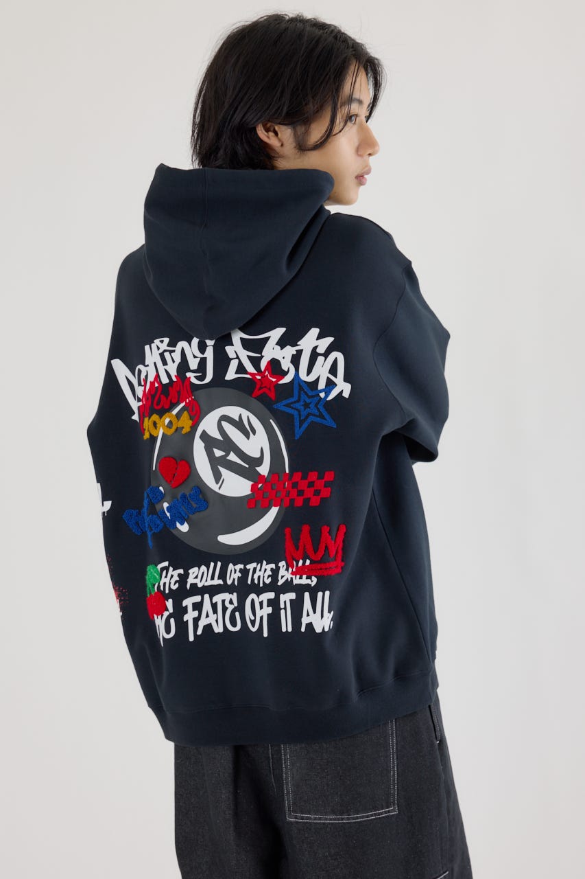 様々な刺繍テクニックをプリントと組み合わせたグラフィックが印象的なスウェットパーカー。