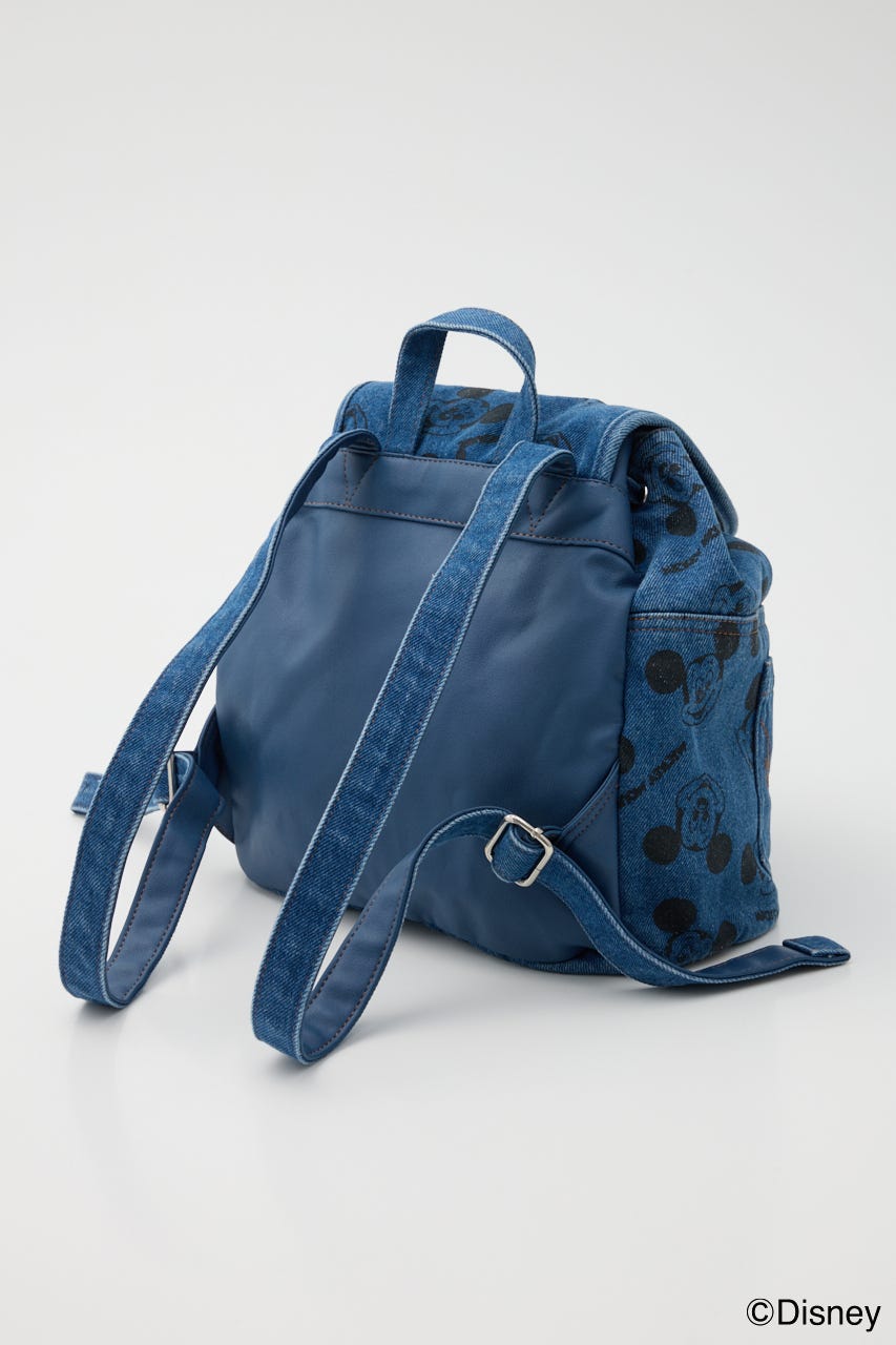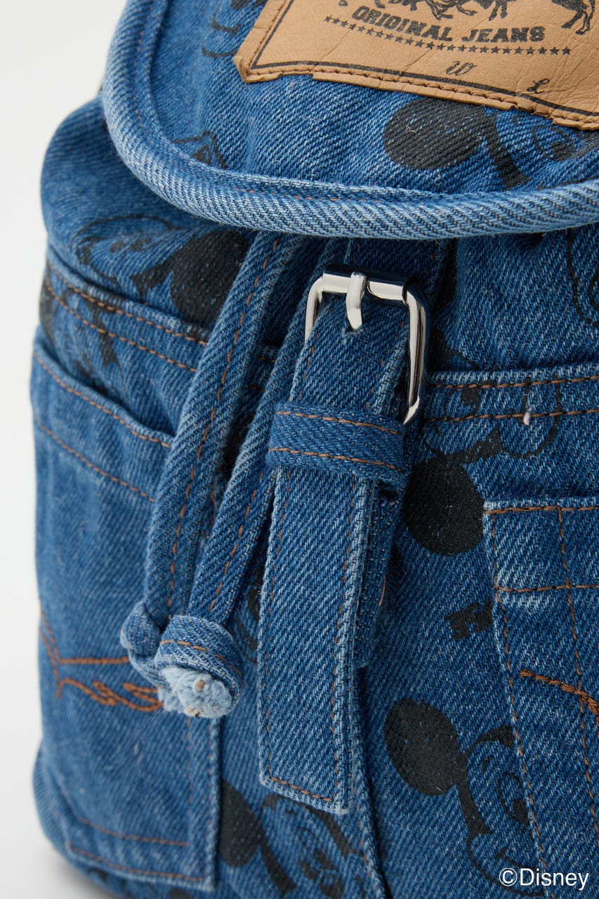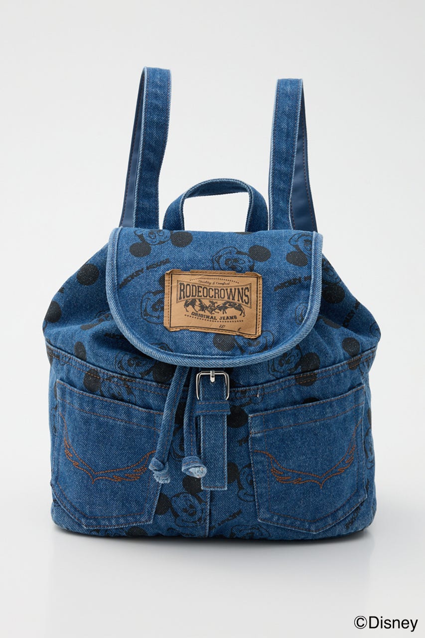 大人気ディズニーキャラクターのミッキーとミニーの総柄デザインがプリントされたデニムリュック。
