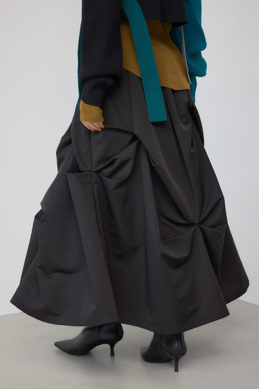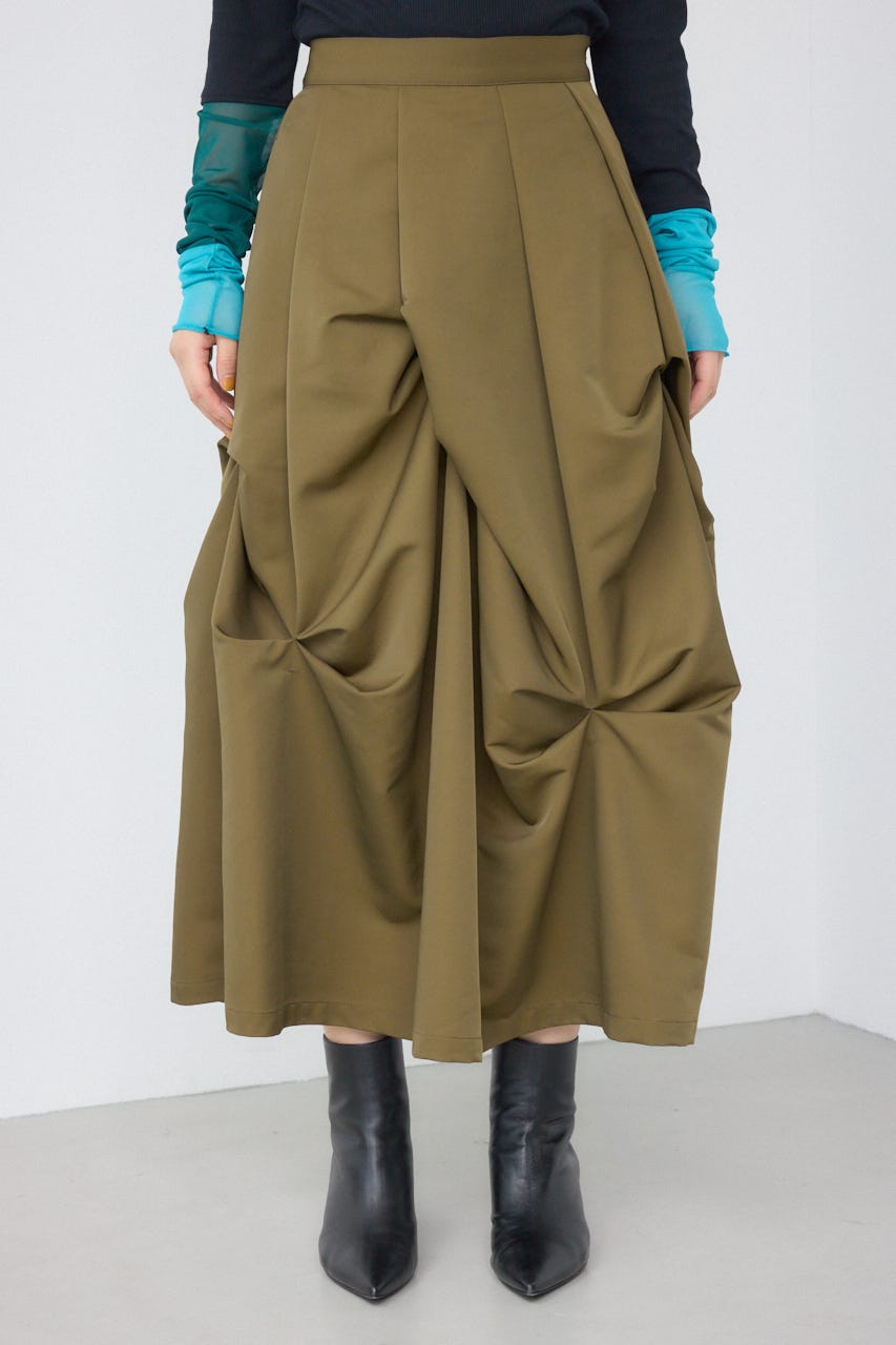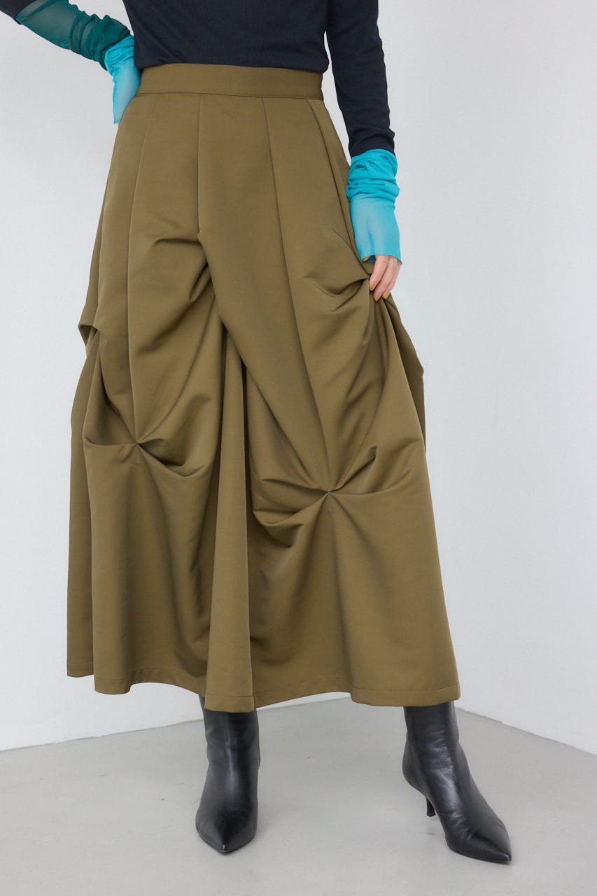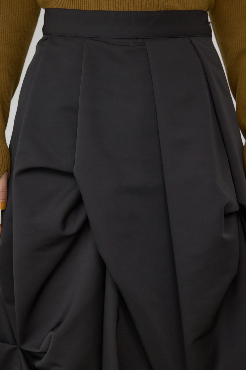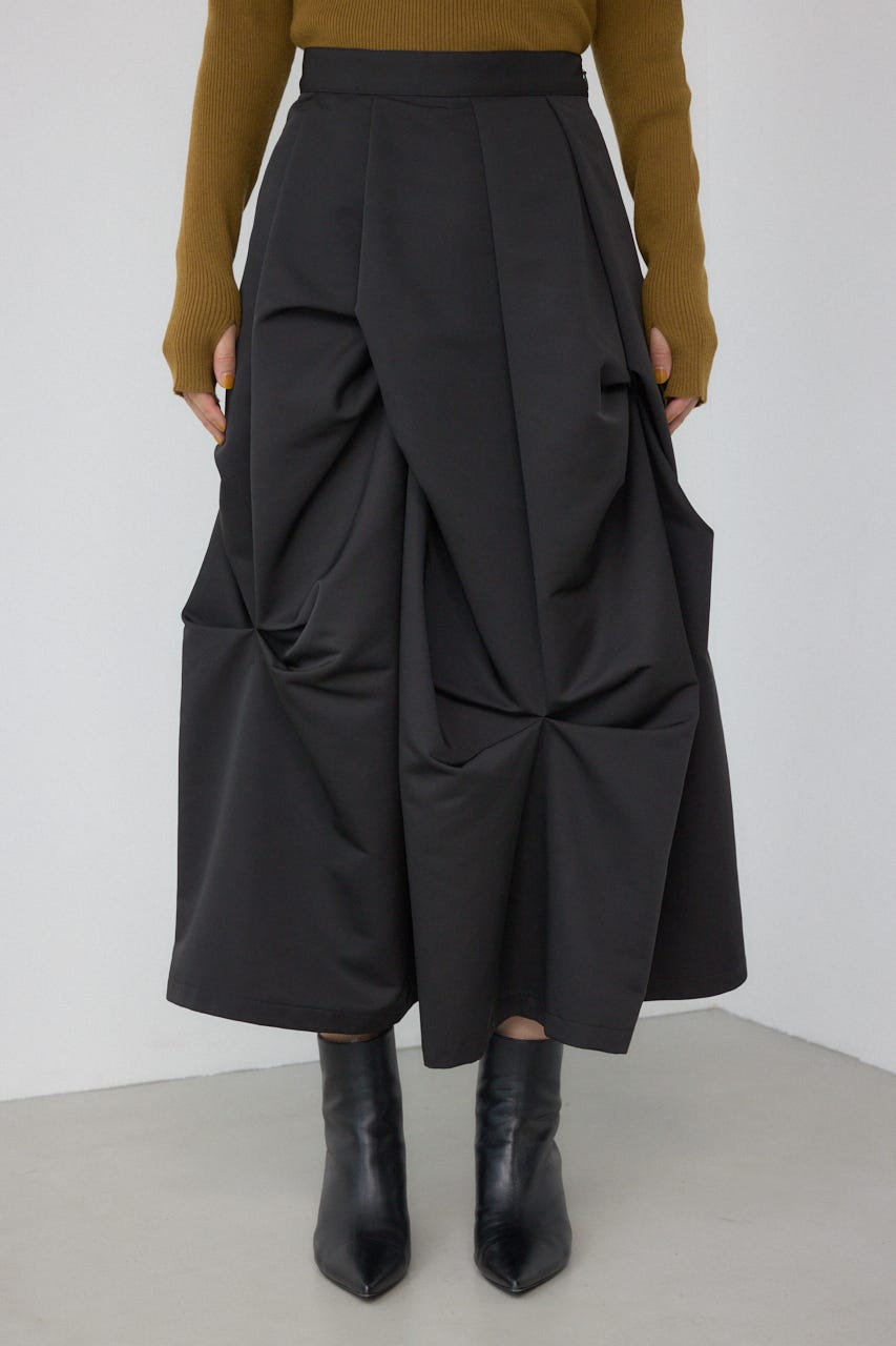 ランダムに入ったタックと軽やかなドレープが、独特の動きのあるデザインを作り出したモードなデザインのスカートです。