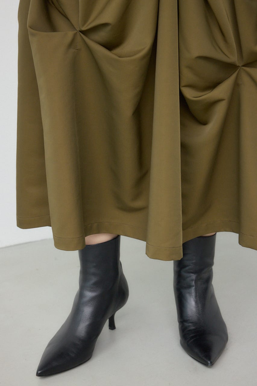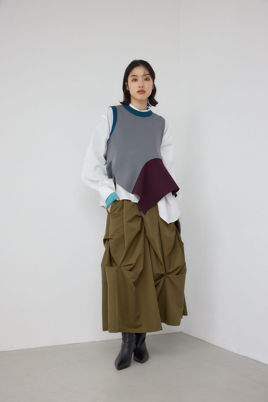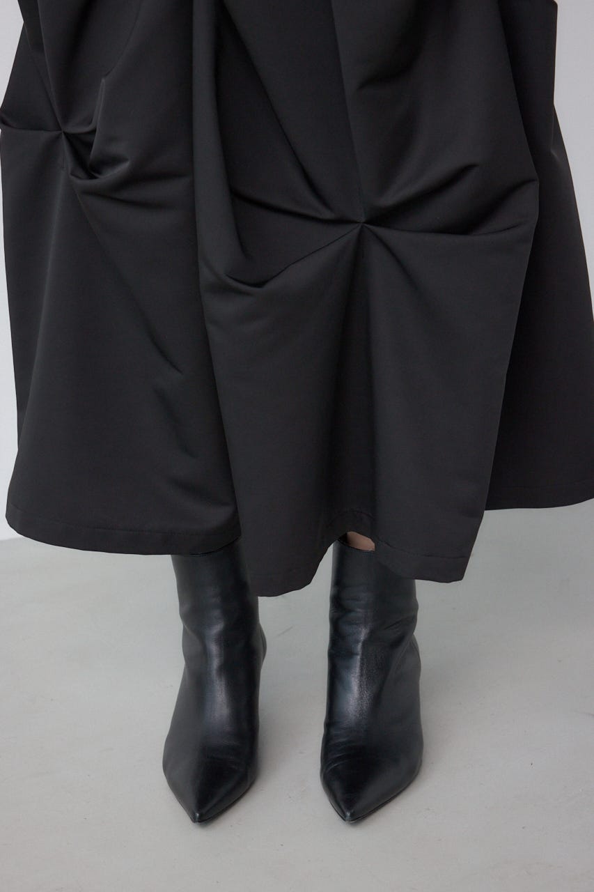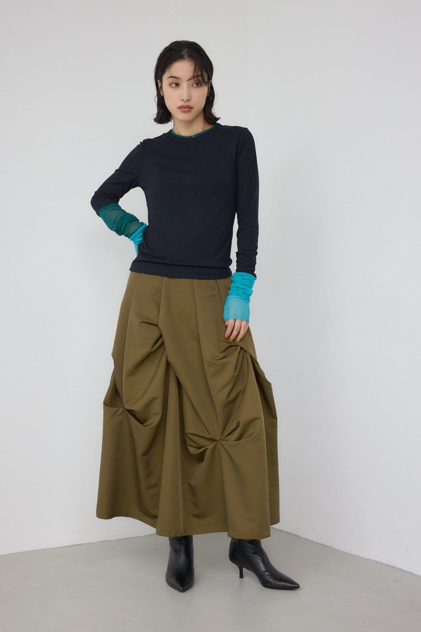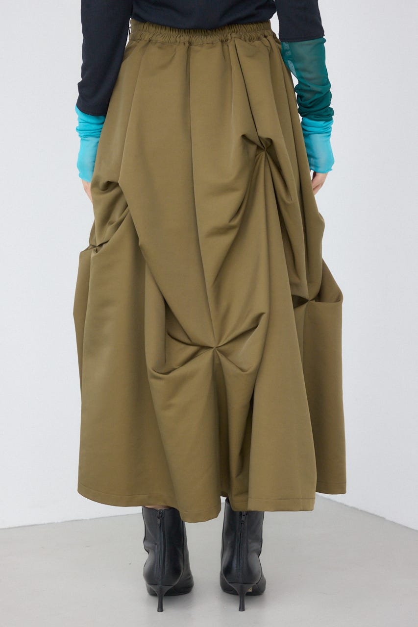 ランダムに入ったタックと軽やかなドレープが、独特の動きのあるデザインを作り出したモードなデザインのスカートです。