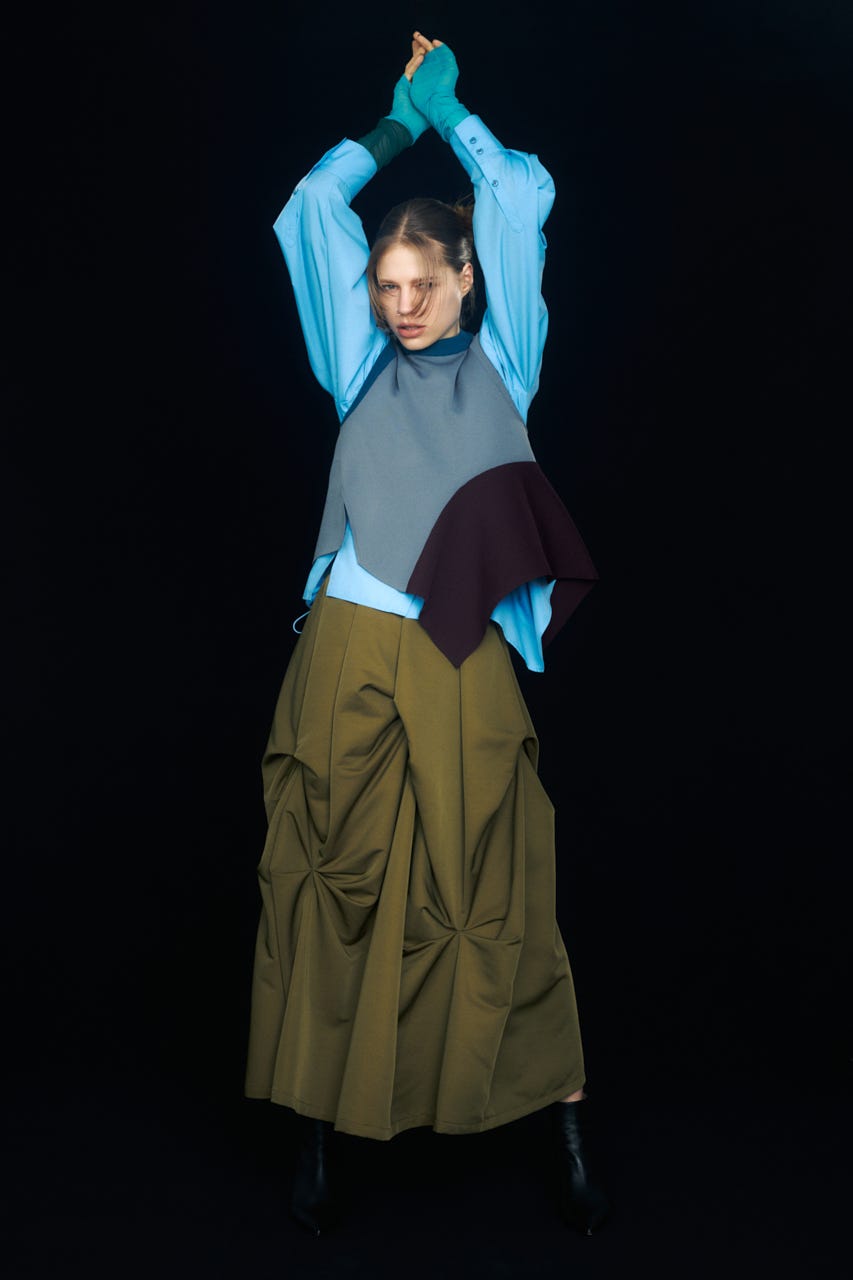 ハリ感のあるモードな素材が作る立体的なシルエットがポイント。