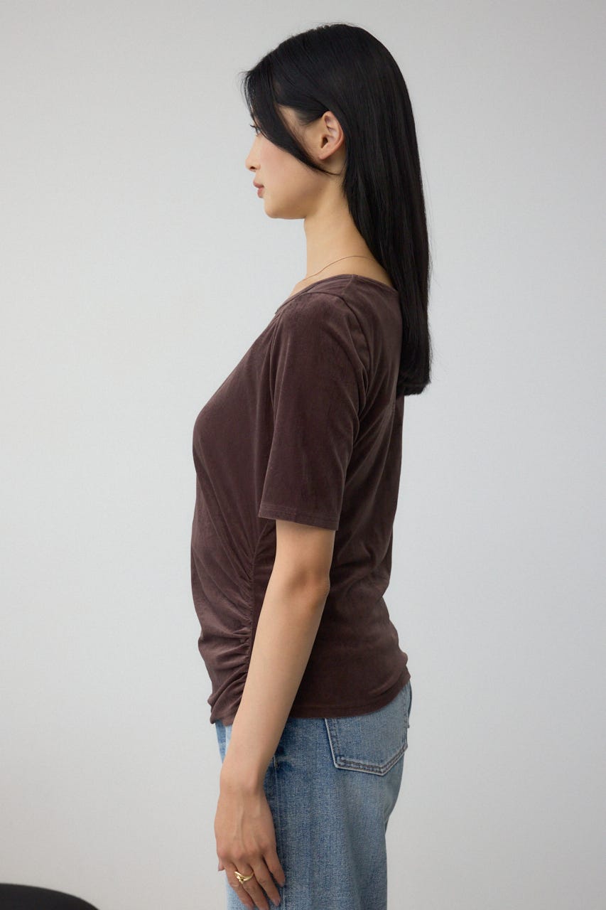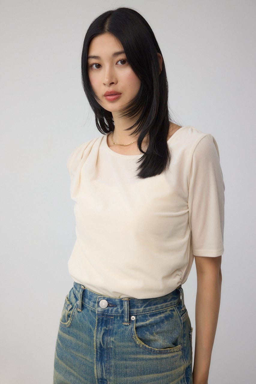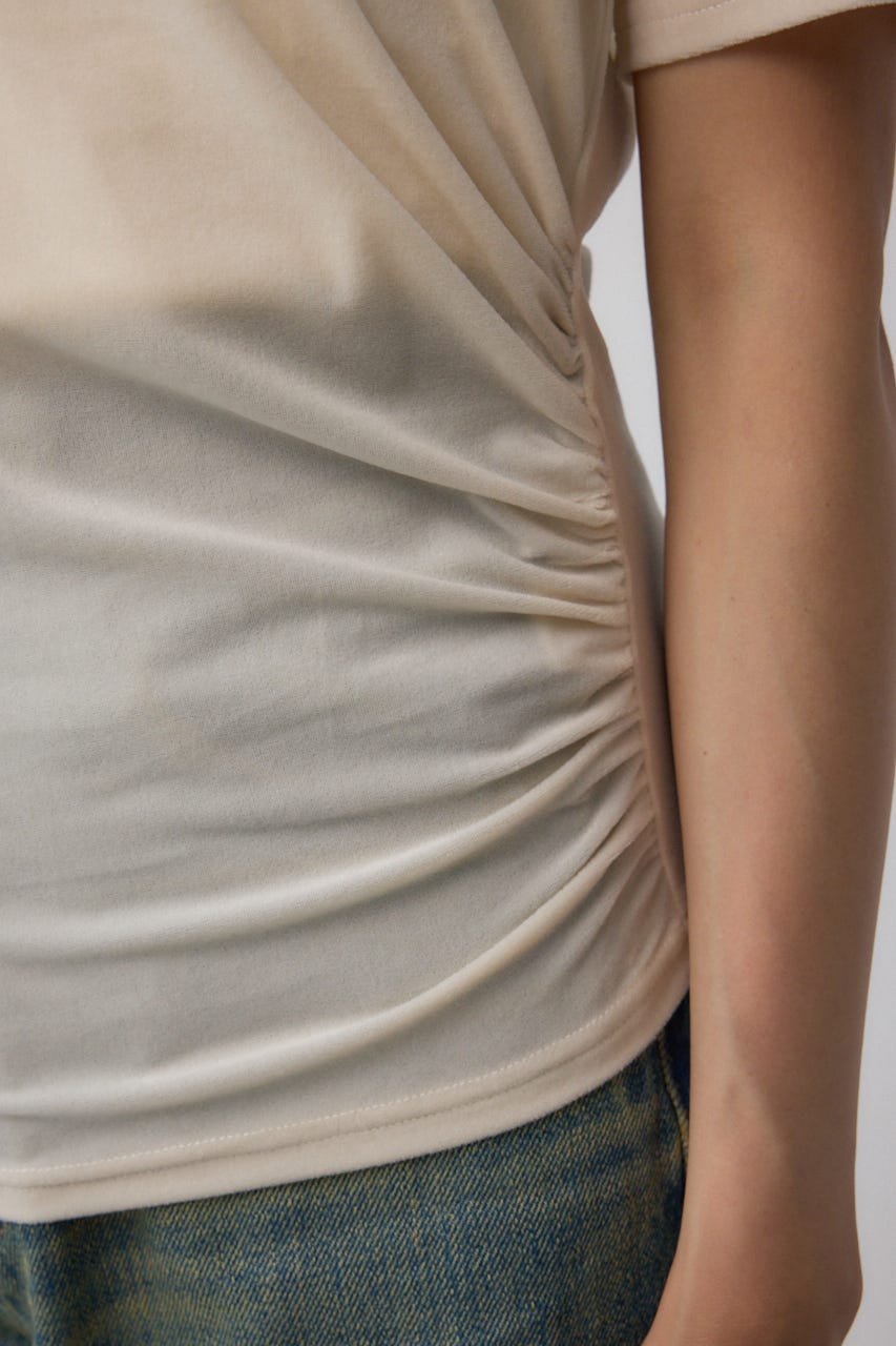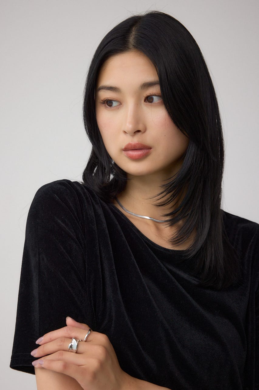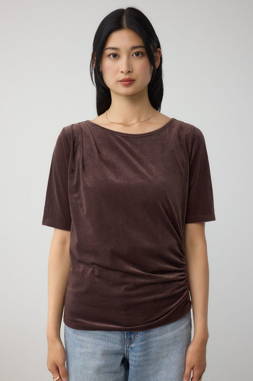 トレンドのベロア素材をトレンドのドレープデザインにしたトップスです。