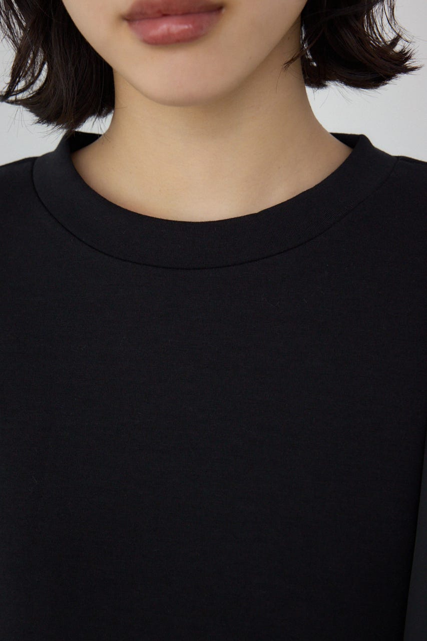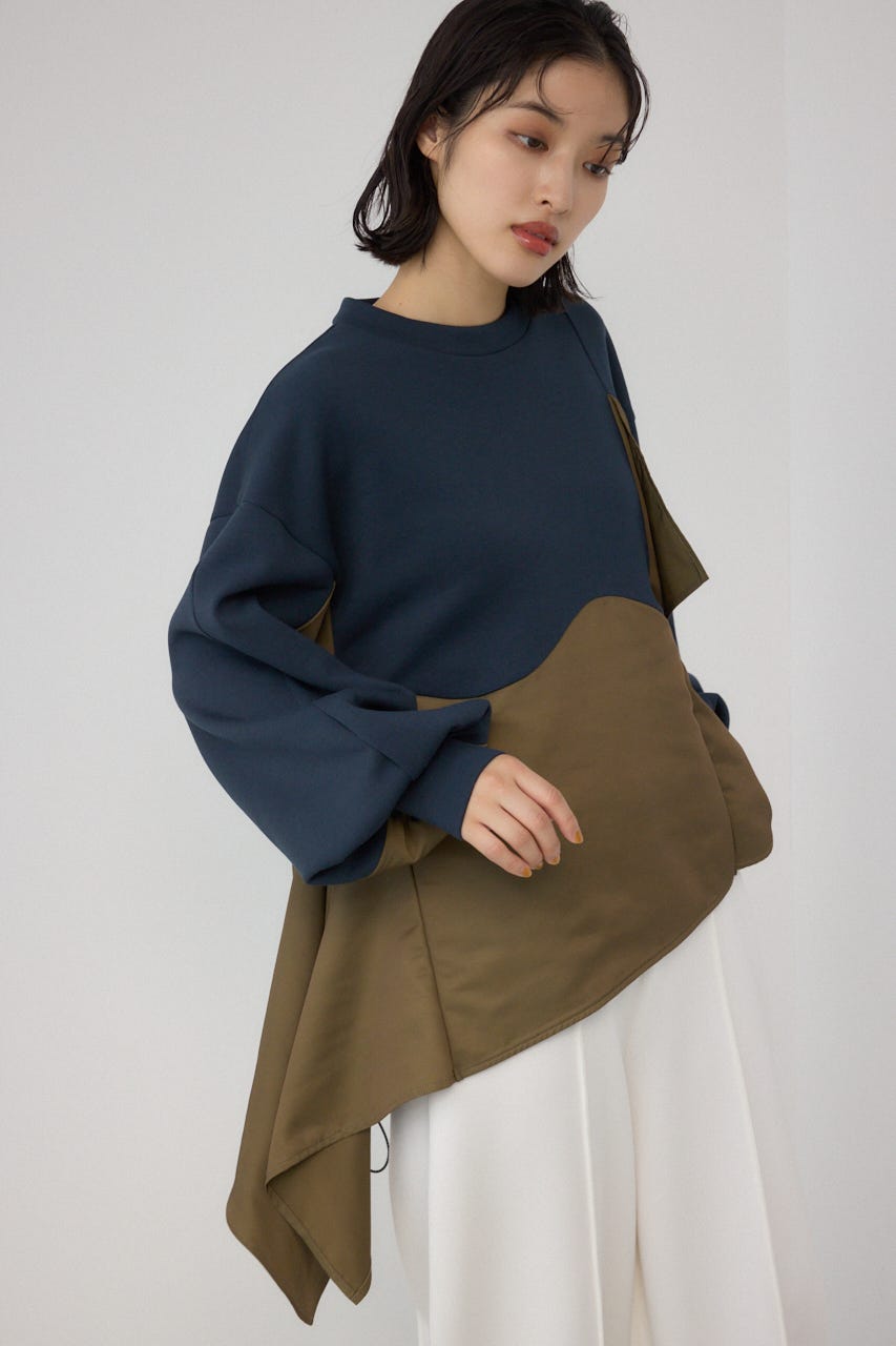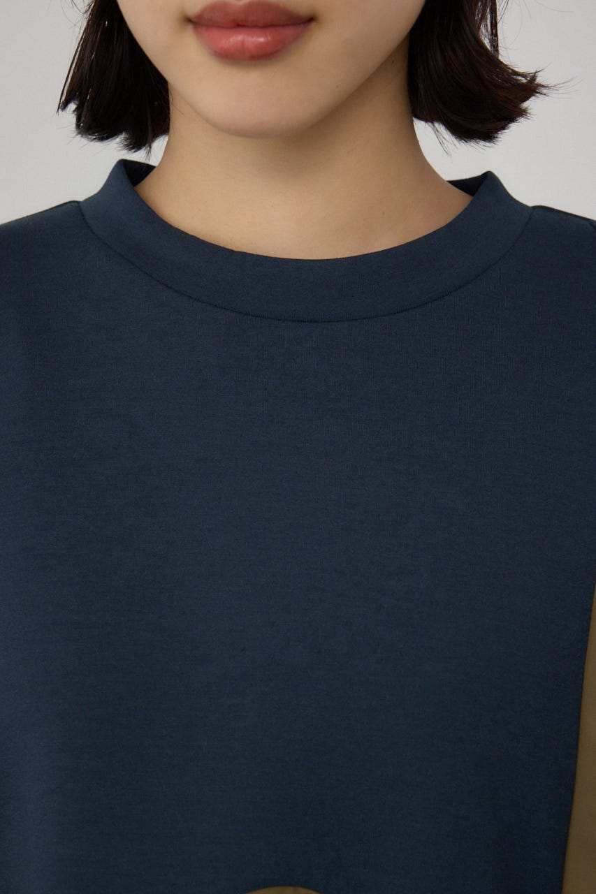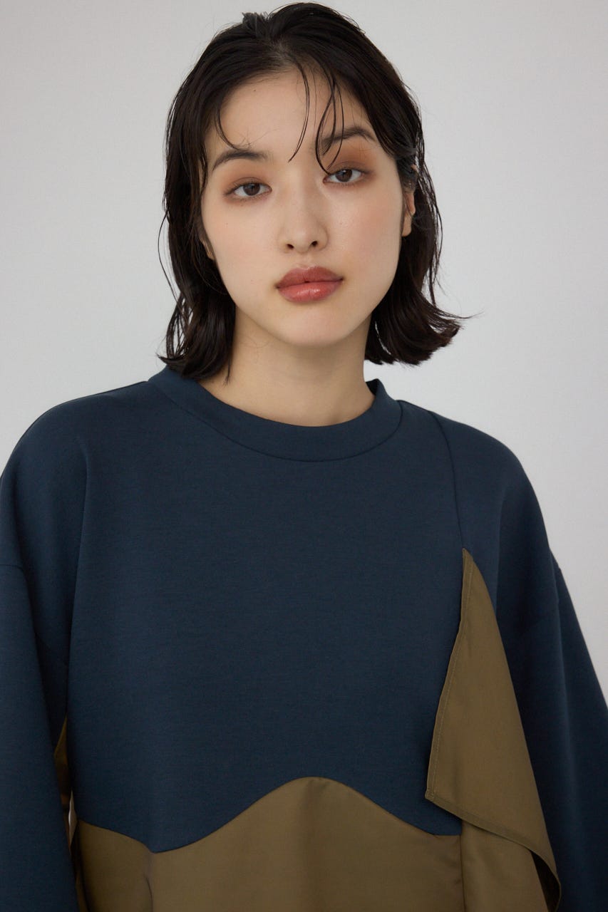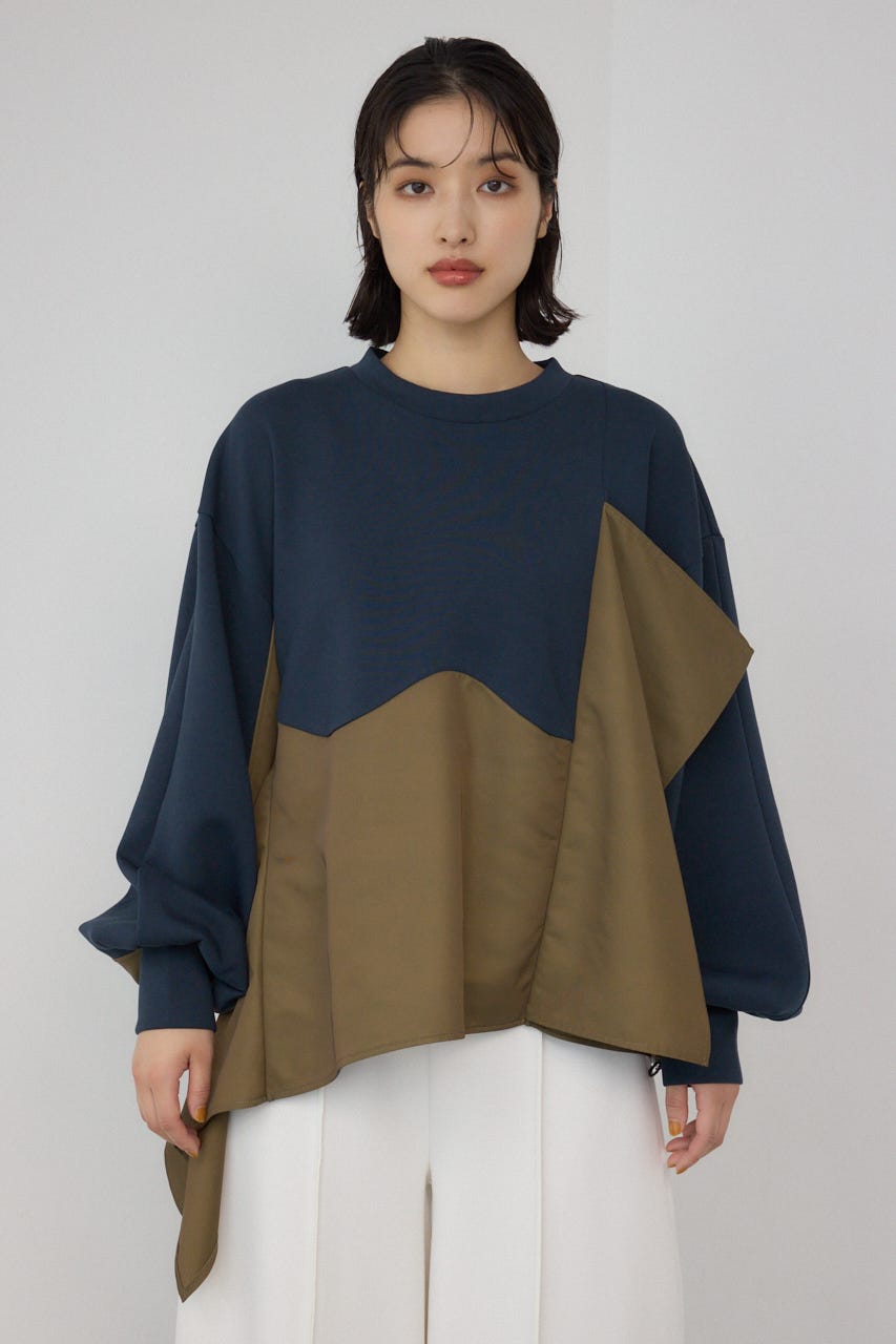 カットトップスですが、布帛とのコンビネーションデザインとアシンメトリーなデザインがモードな印象に仕上げてくれます。