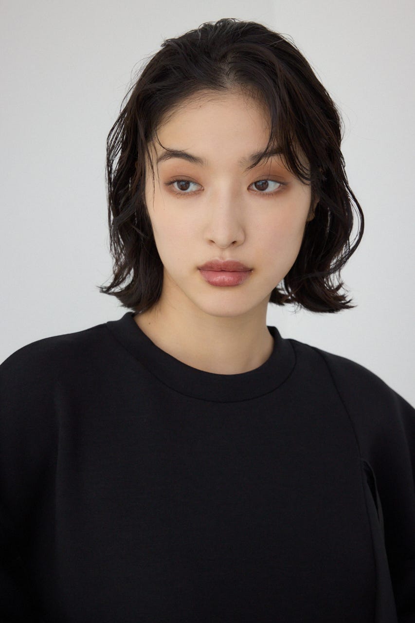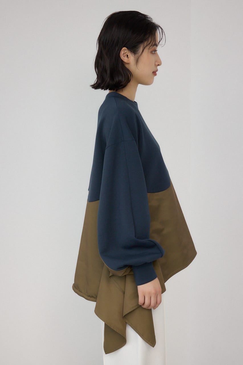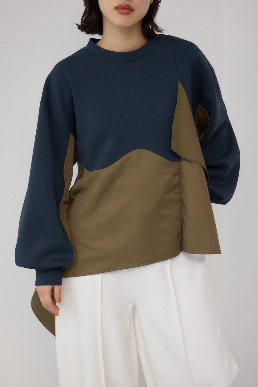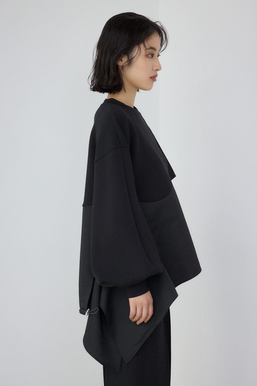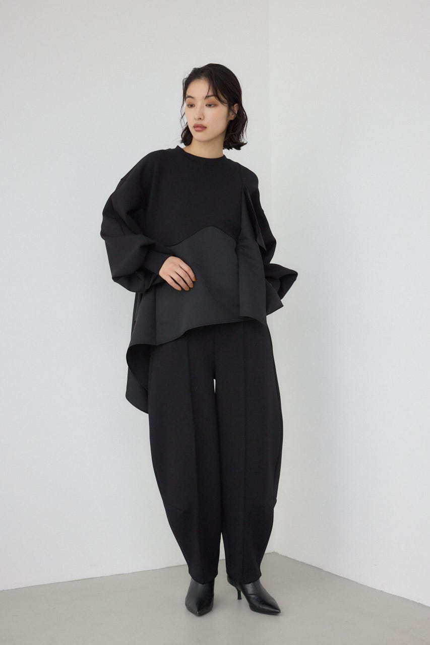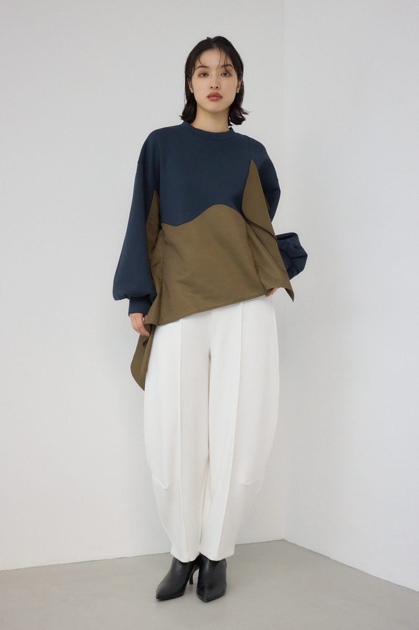 カットトップスですが、布帛とのコンビネーションデザインとアシンメトリーなデザインがモードな印象に仕上げてくれます。