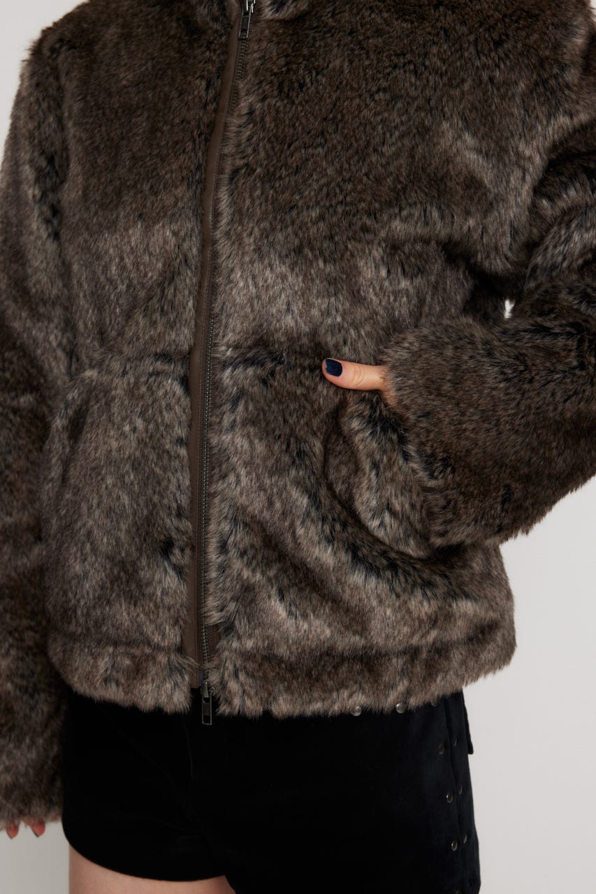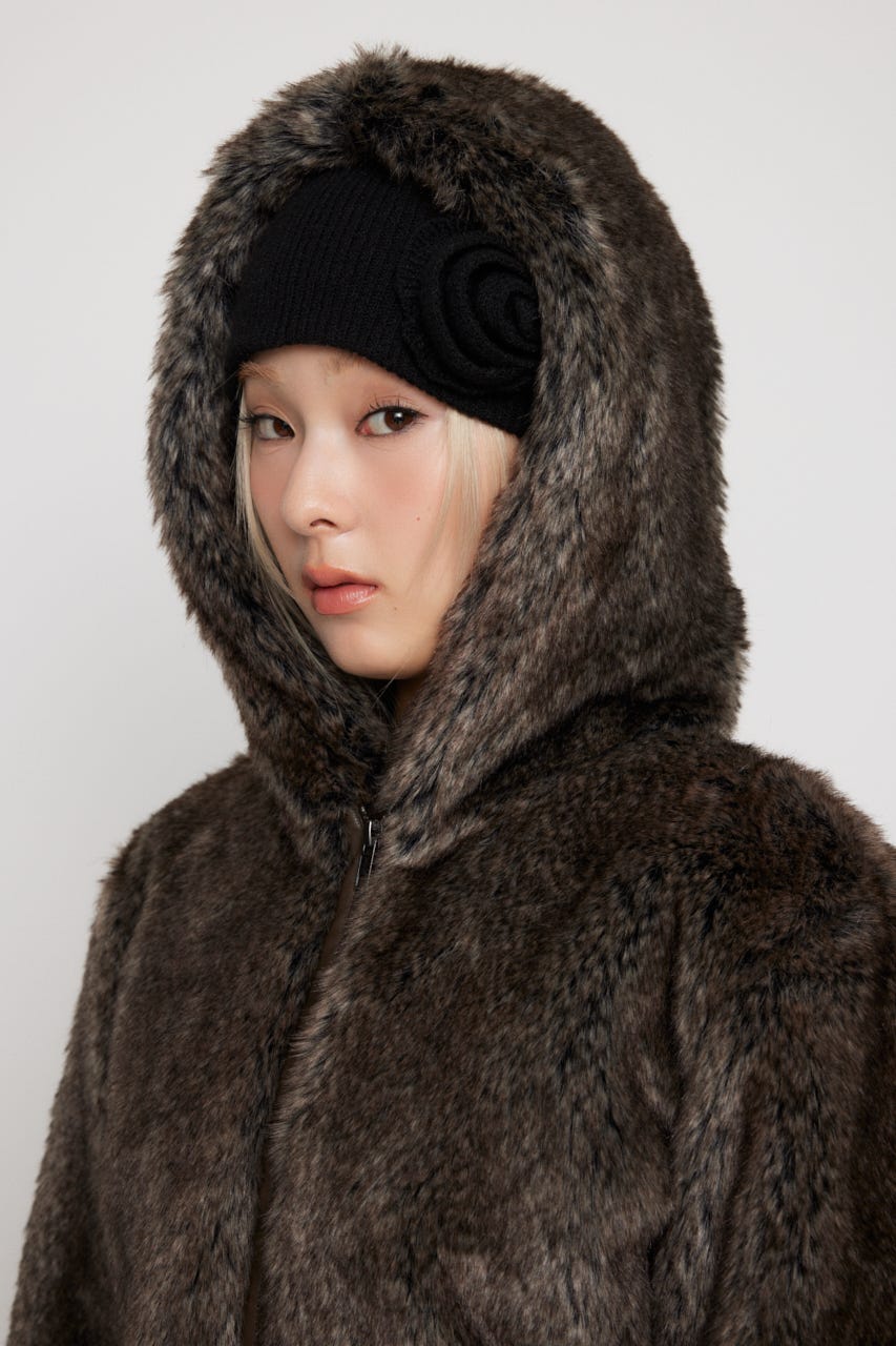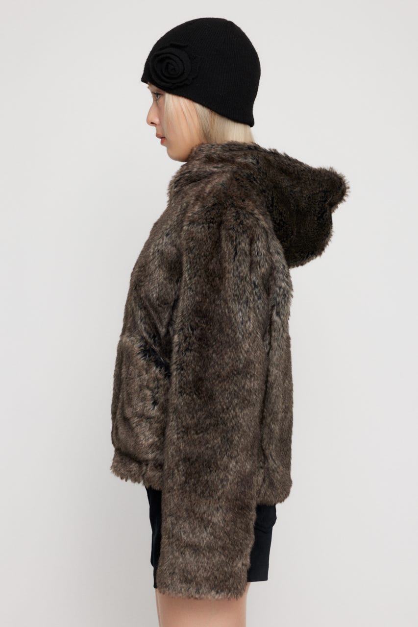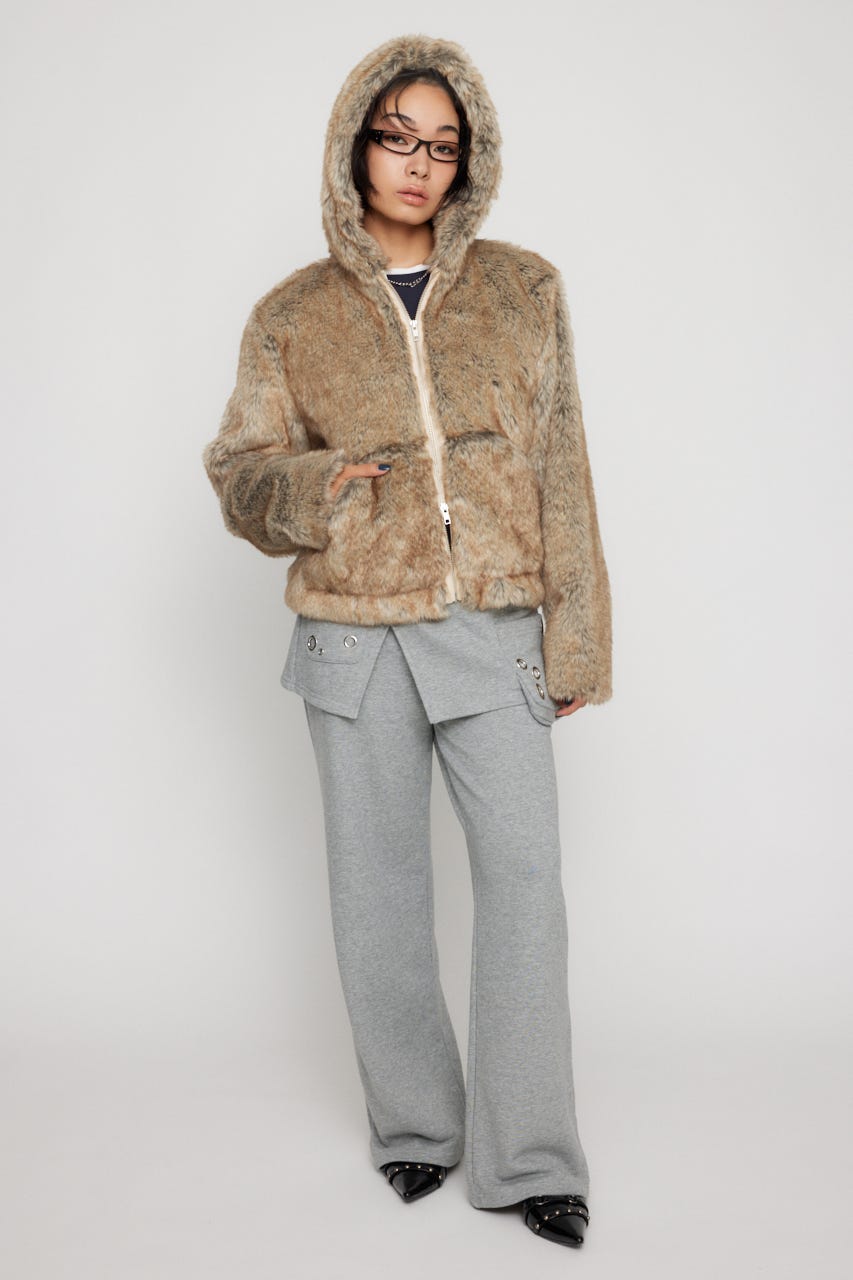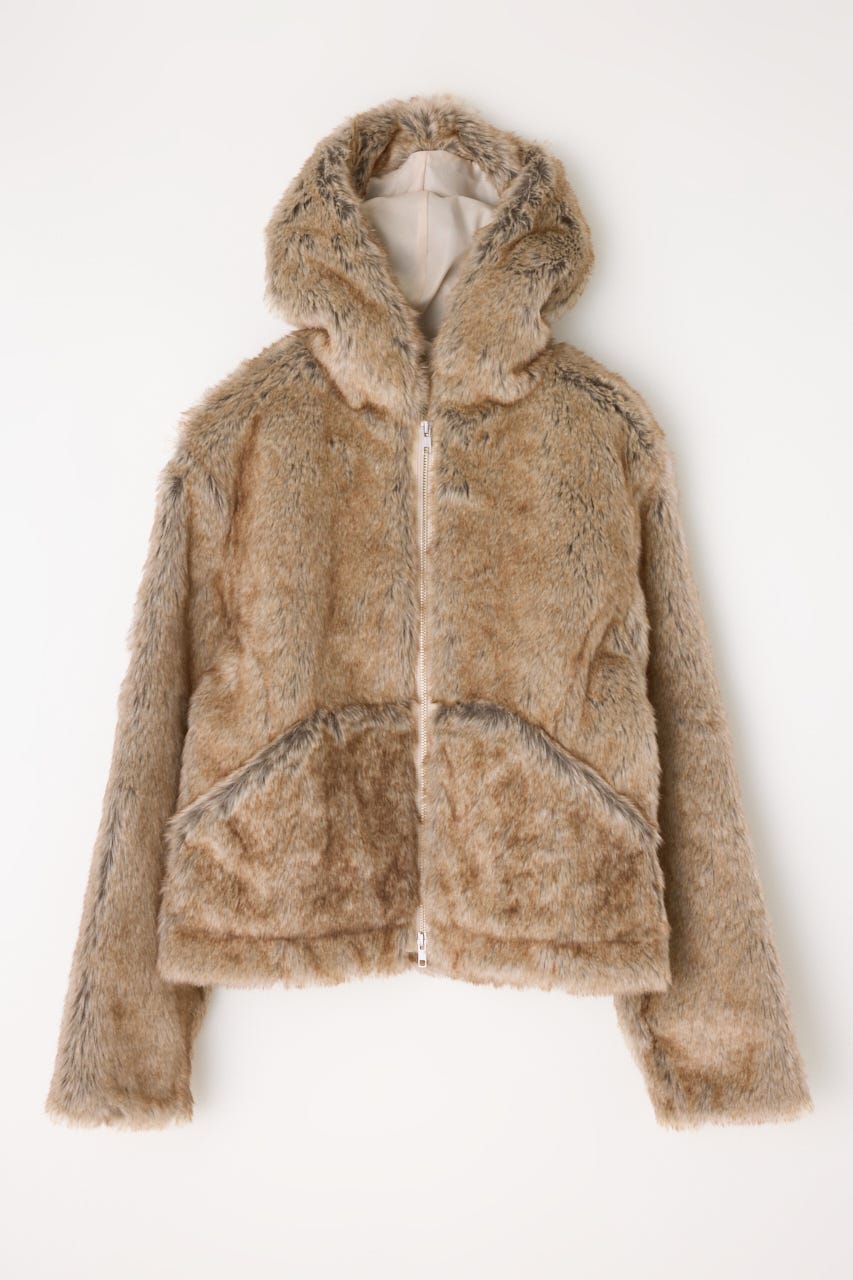 ■POINT:フード付きのファーが目を惹くブルゾン。