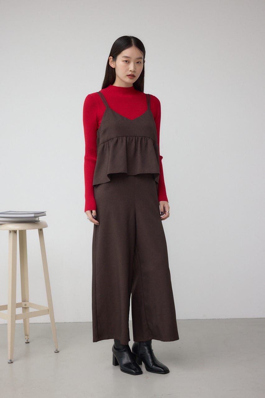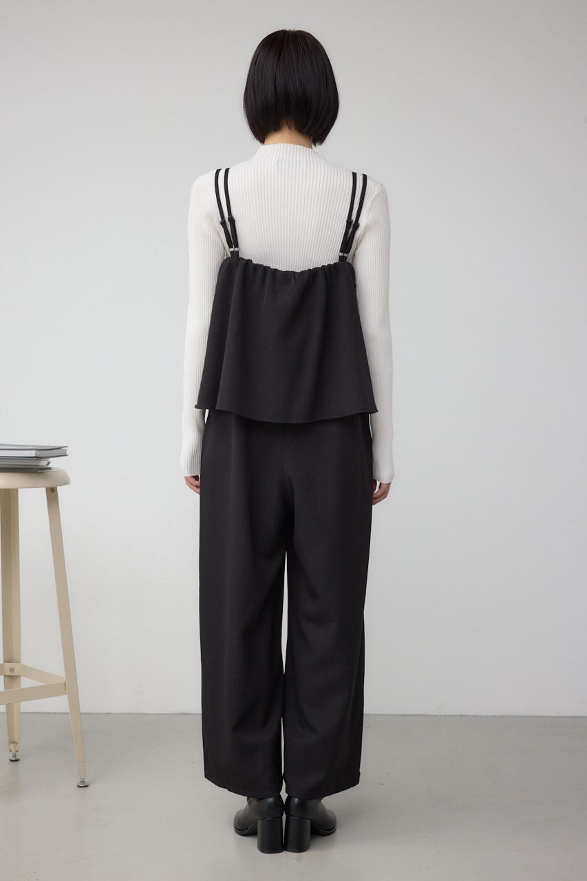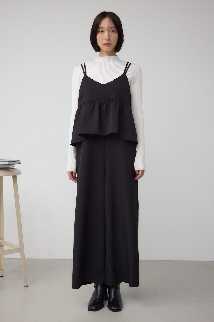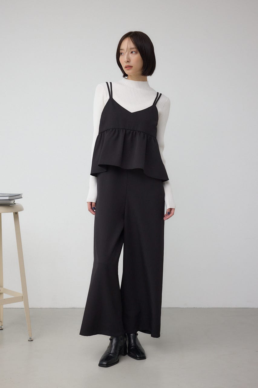 女性らしいシルエットが特徴のキャミ型ビスチェとワイドシルエットのカジュアルなパンツを組み合わせたオールインワン。