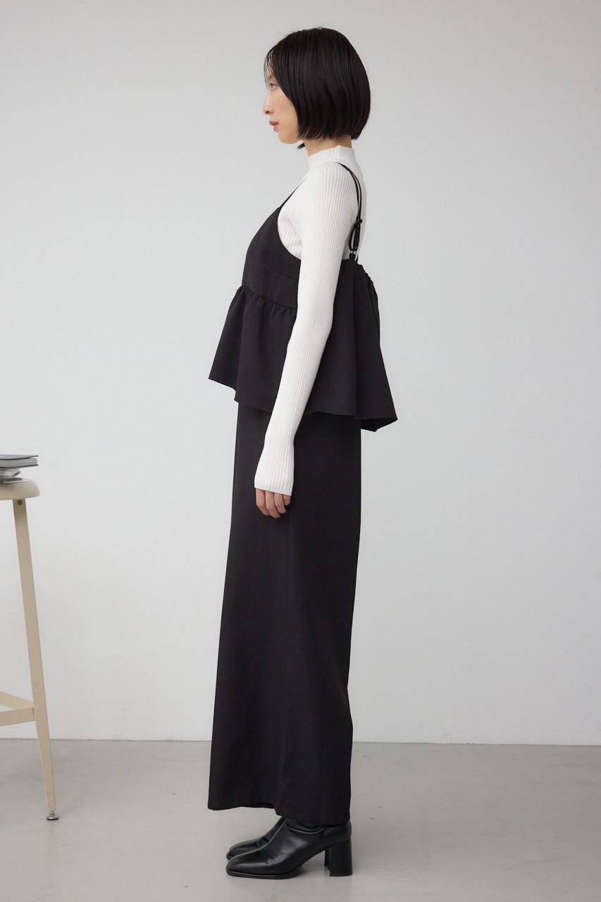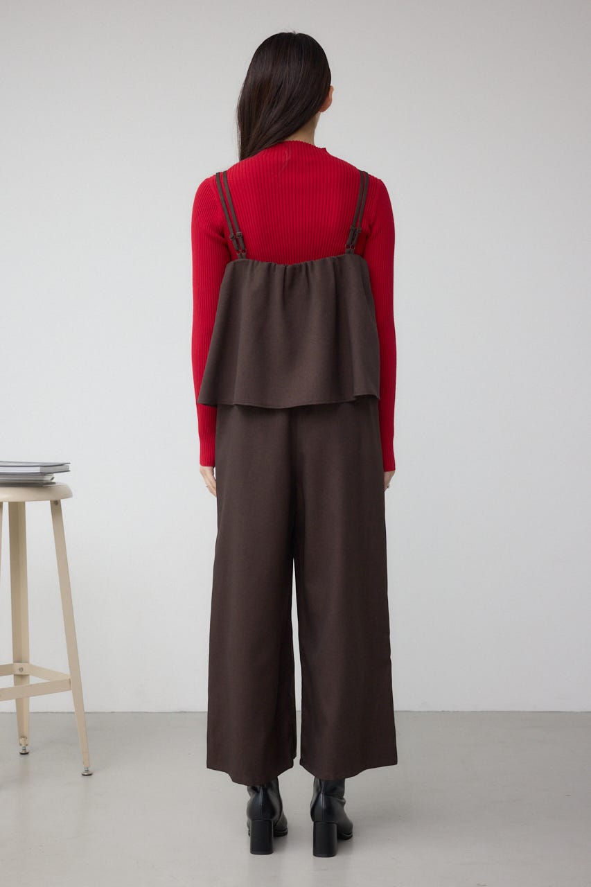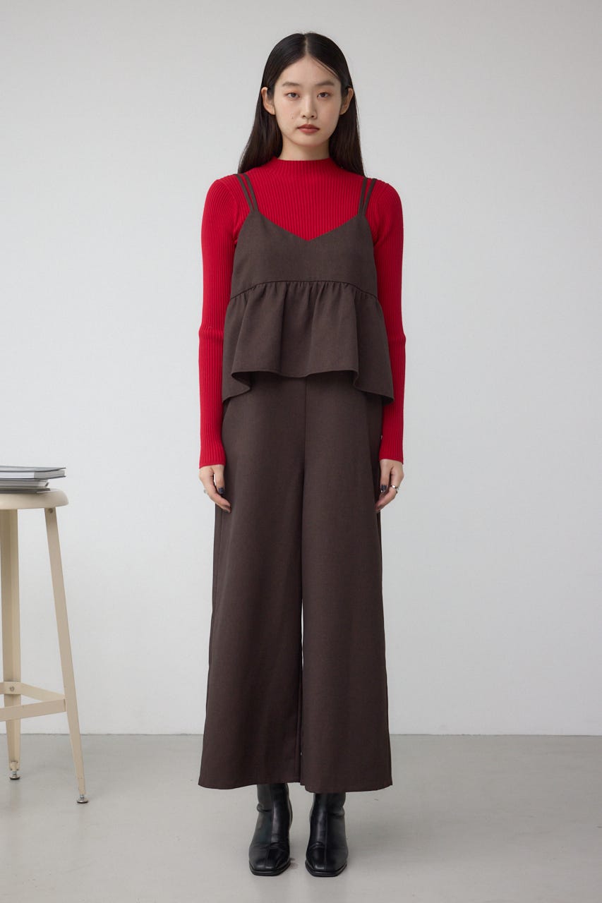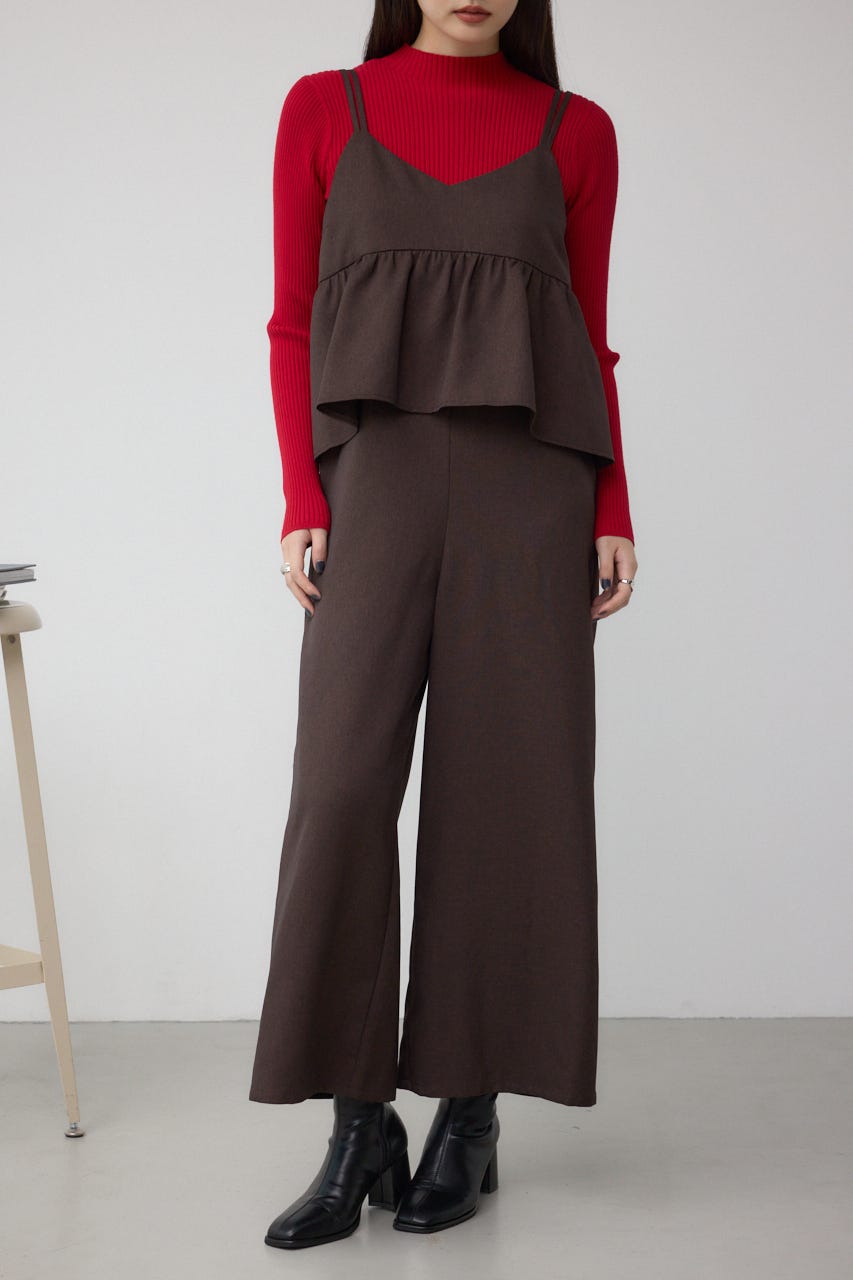 女性らしいシルエットが特徴のキャミ型ビスチェとワイドシルエットのカジュアルなパンツを組み合わせたオールインワン。