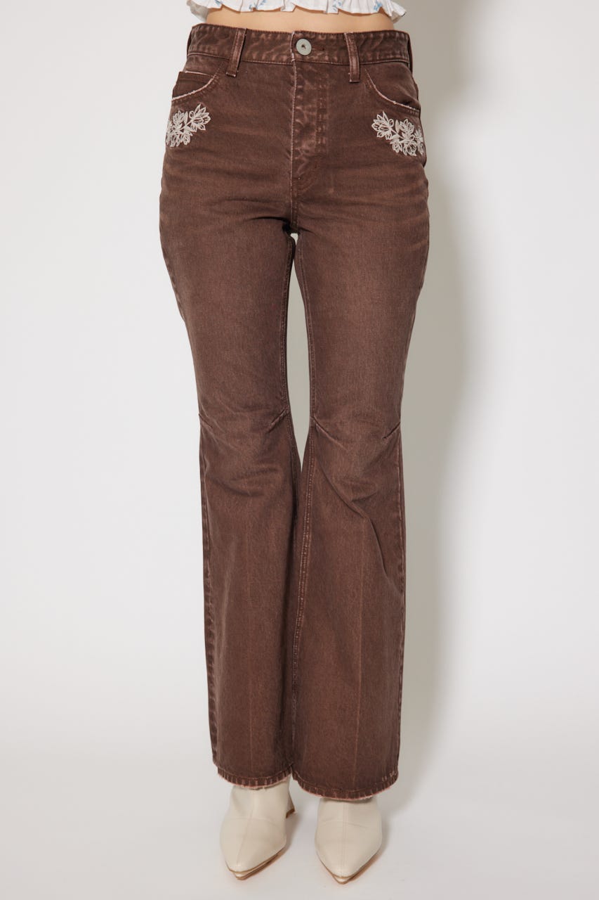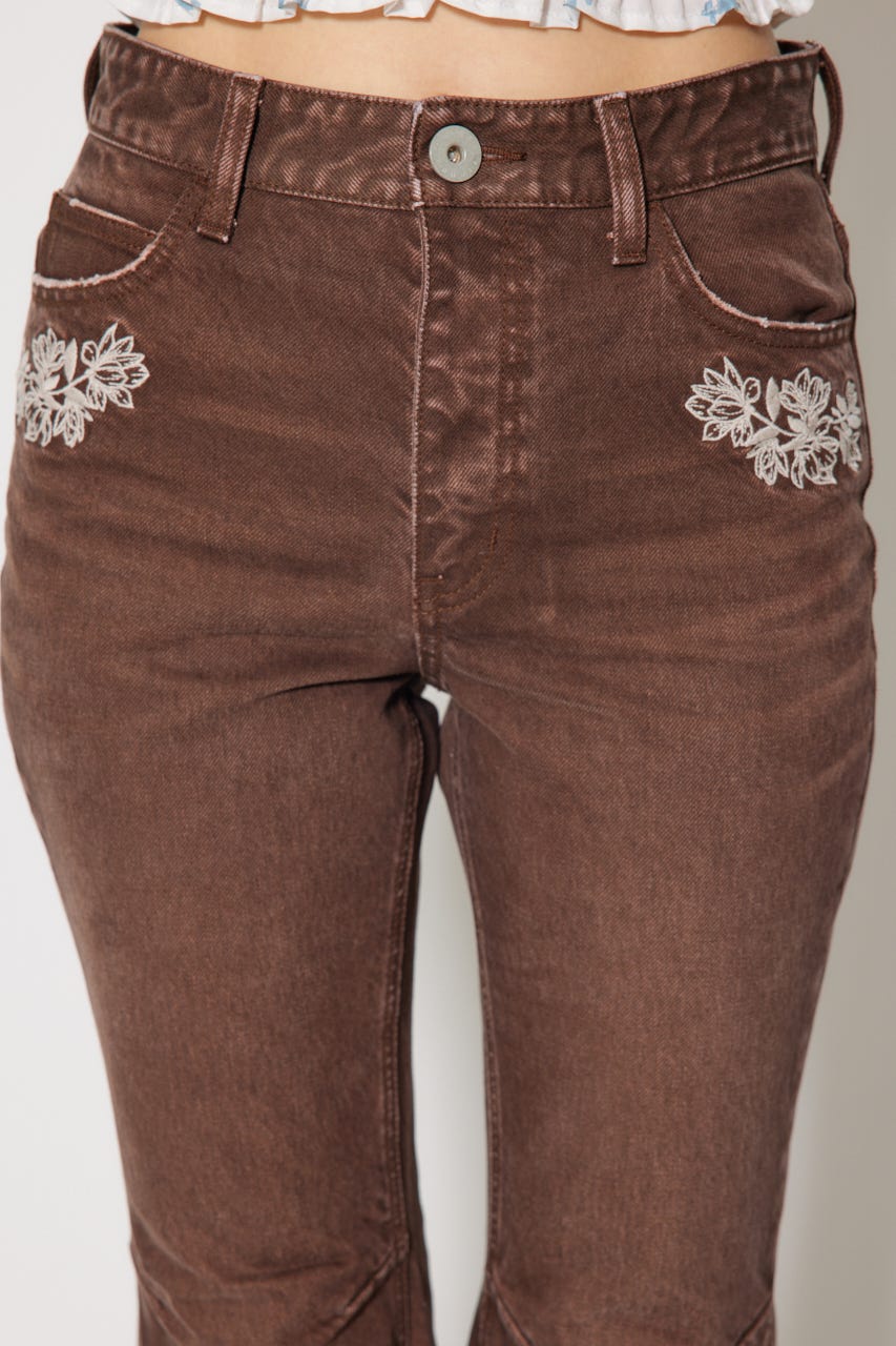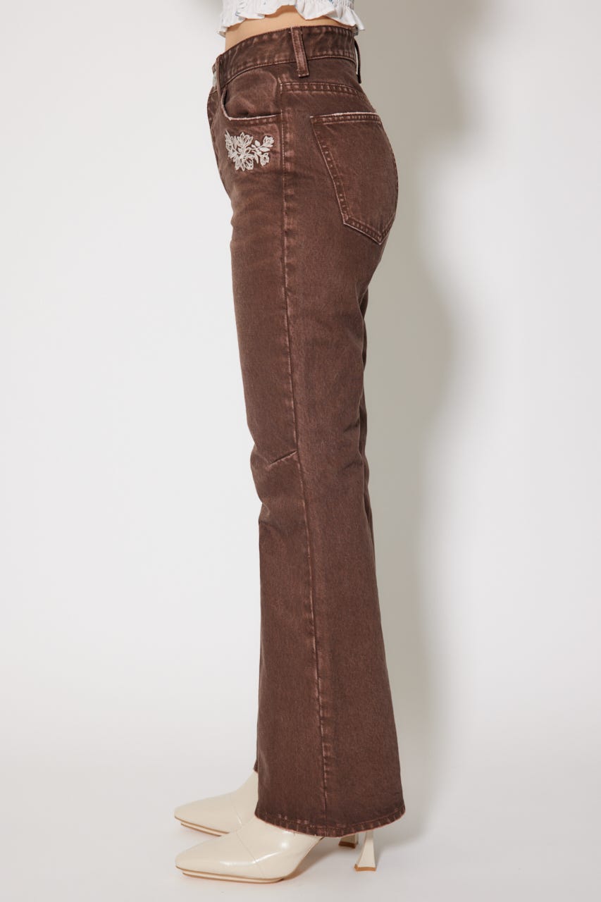 オリジナルのフラワー刺繍をあしらったブーツカットのデニム風パンツ。