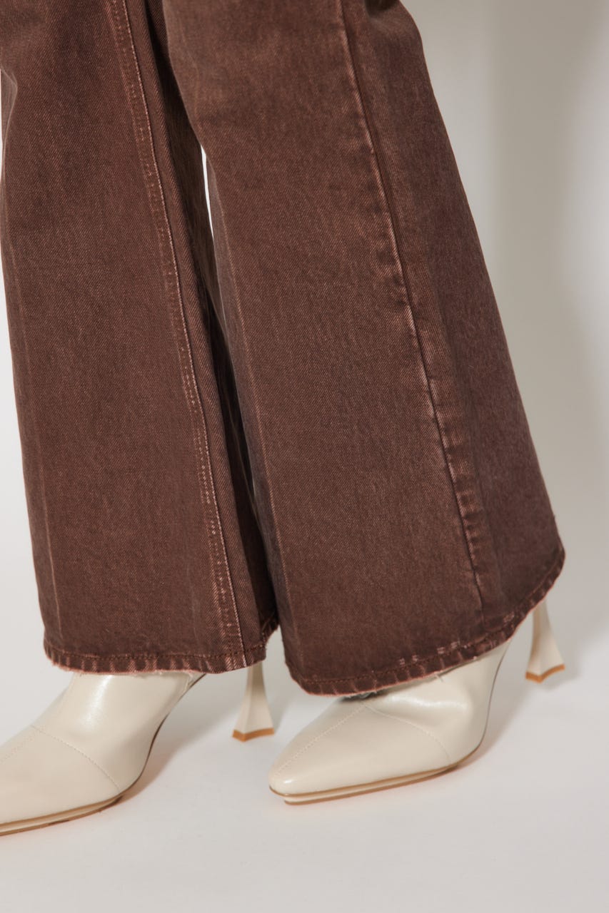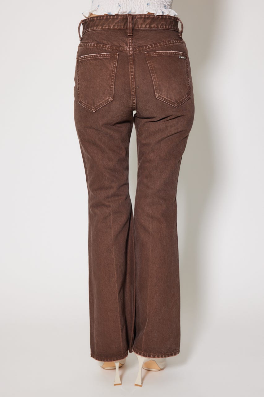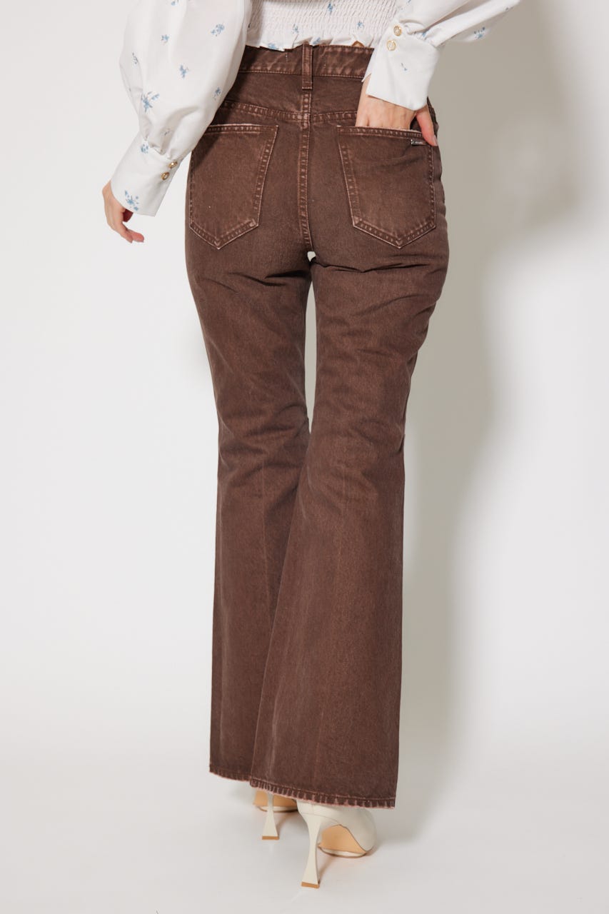 オリジナルのフラワー刺繍をあしらったブーツカットのデニム風パンツ。