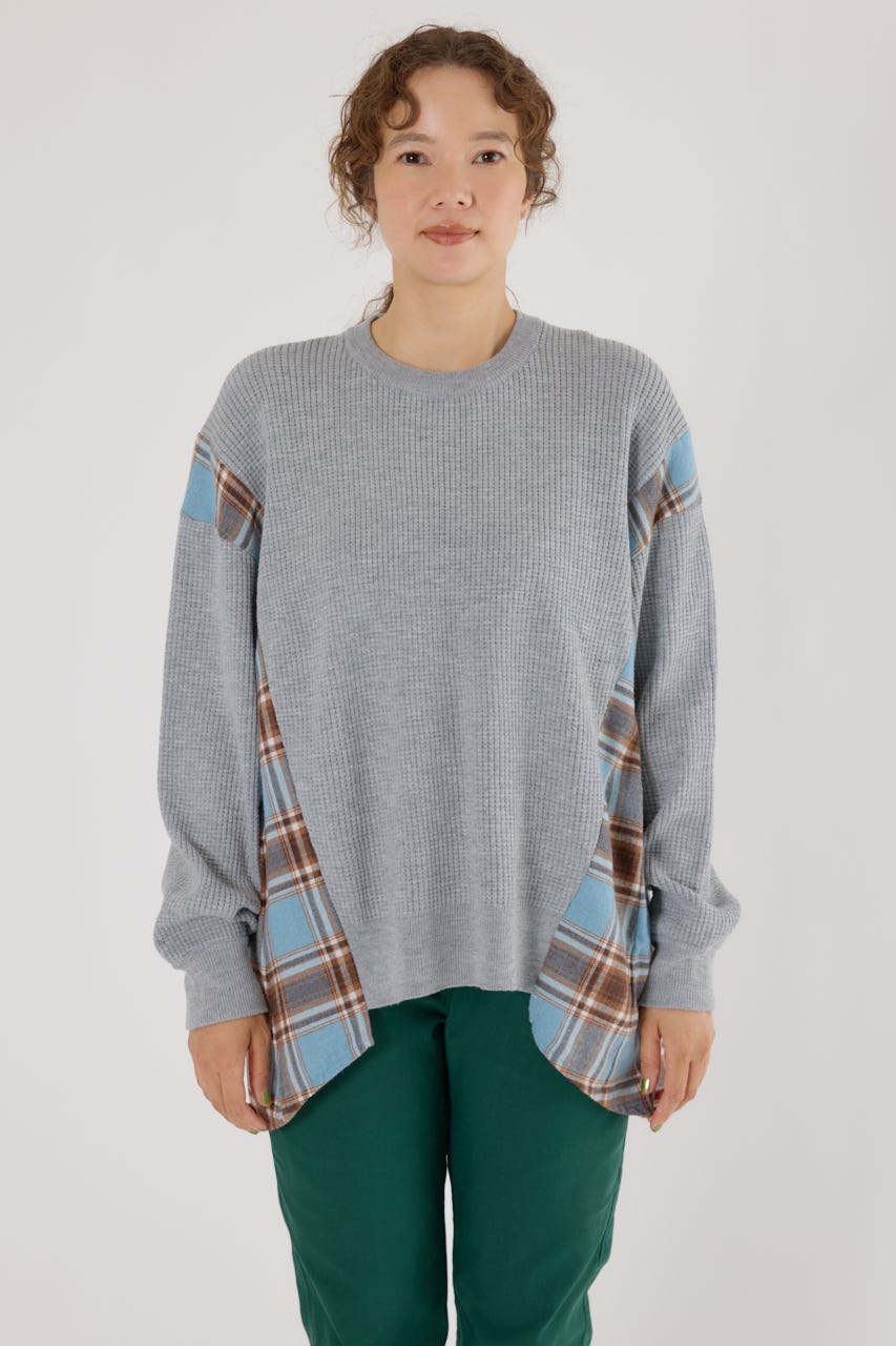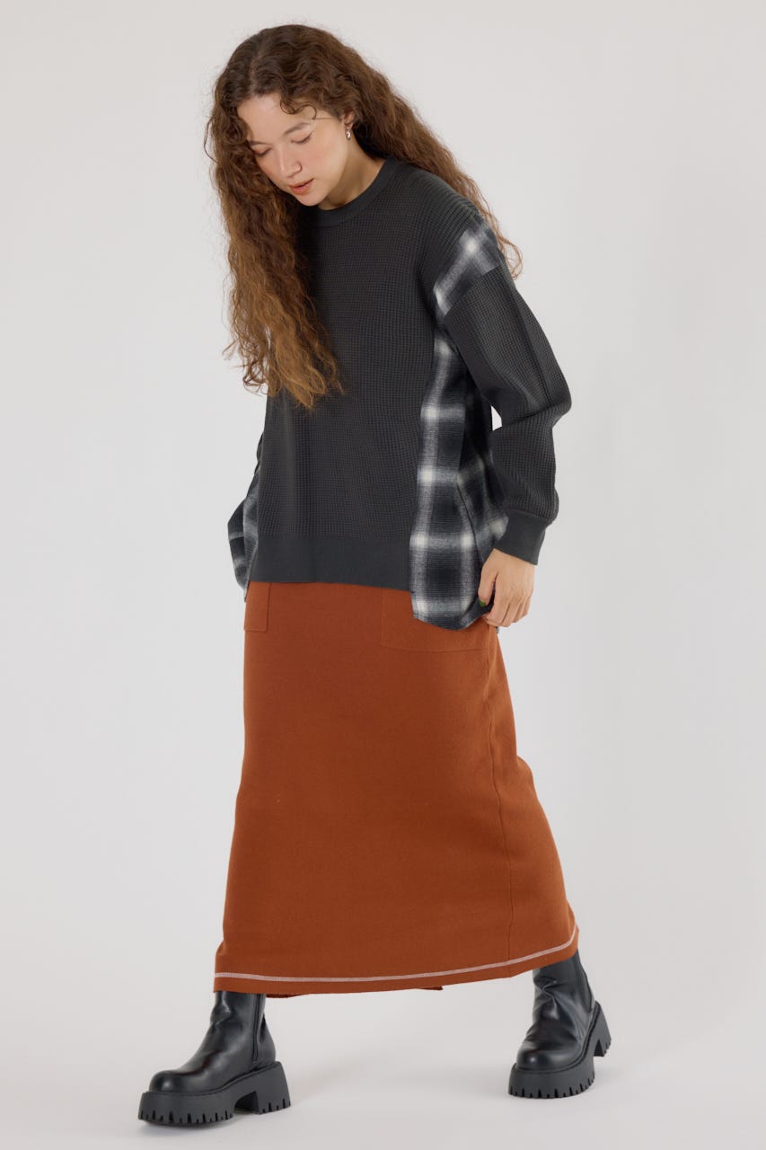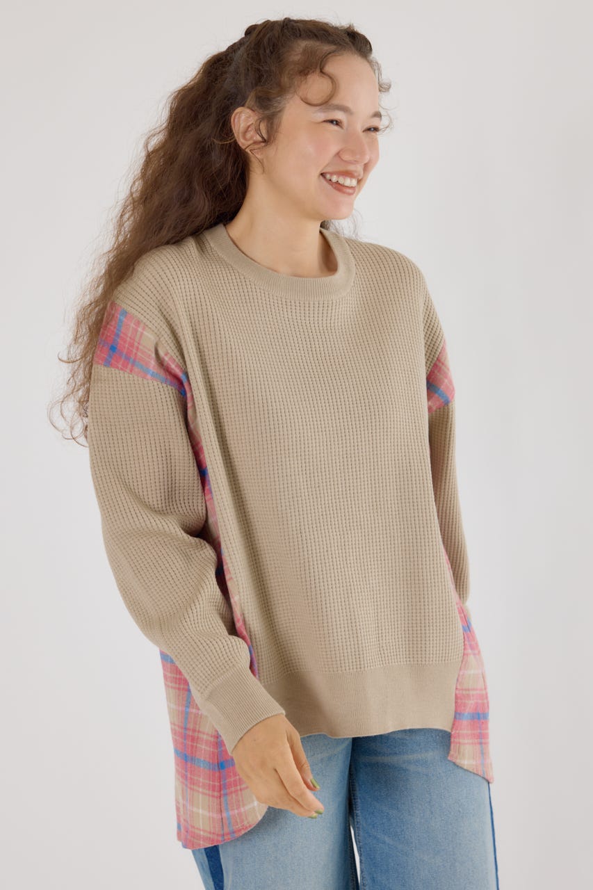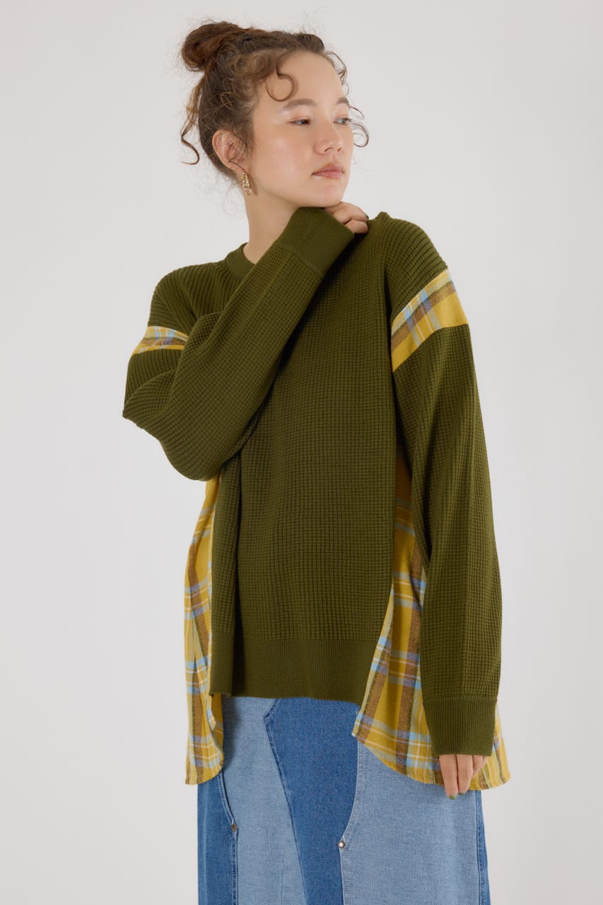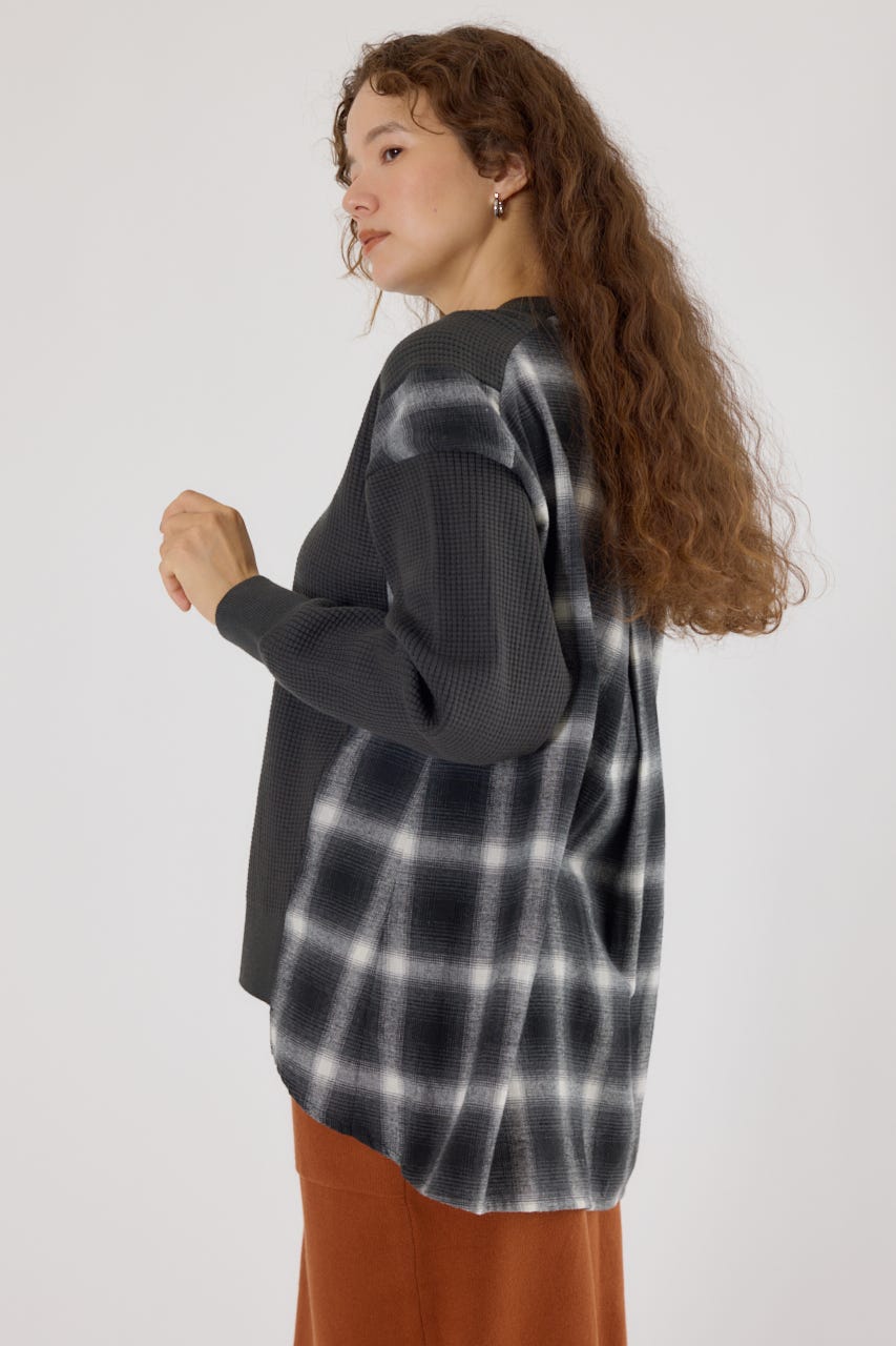 表面感のあるワッフル編みのニットと、チェックシャツのドッキング。