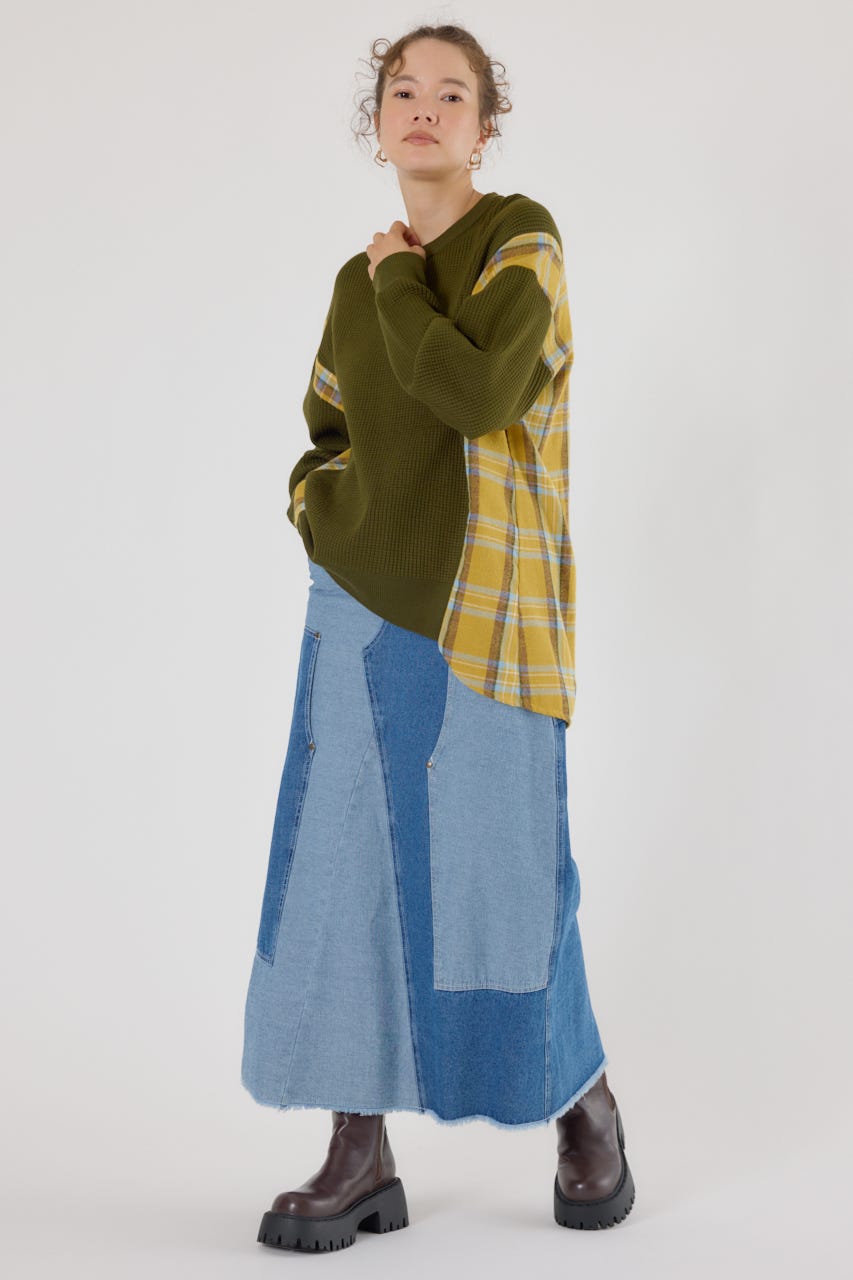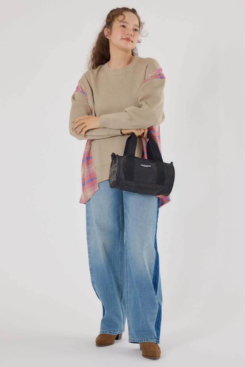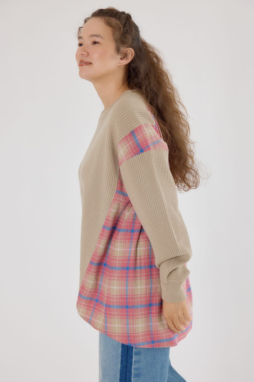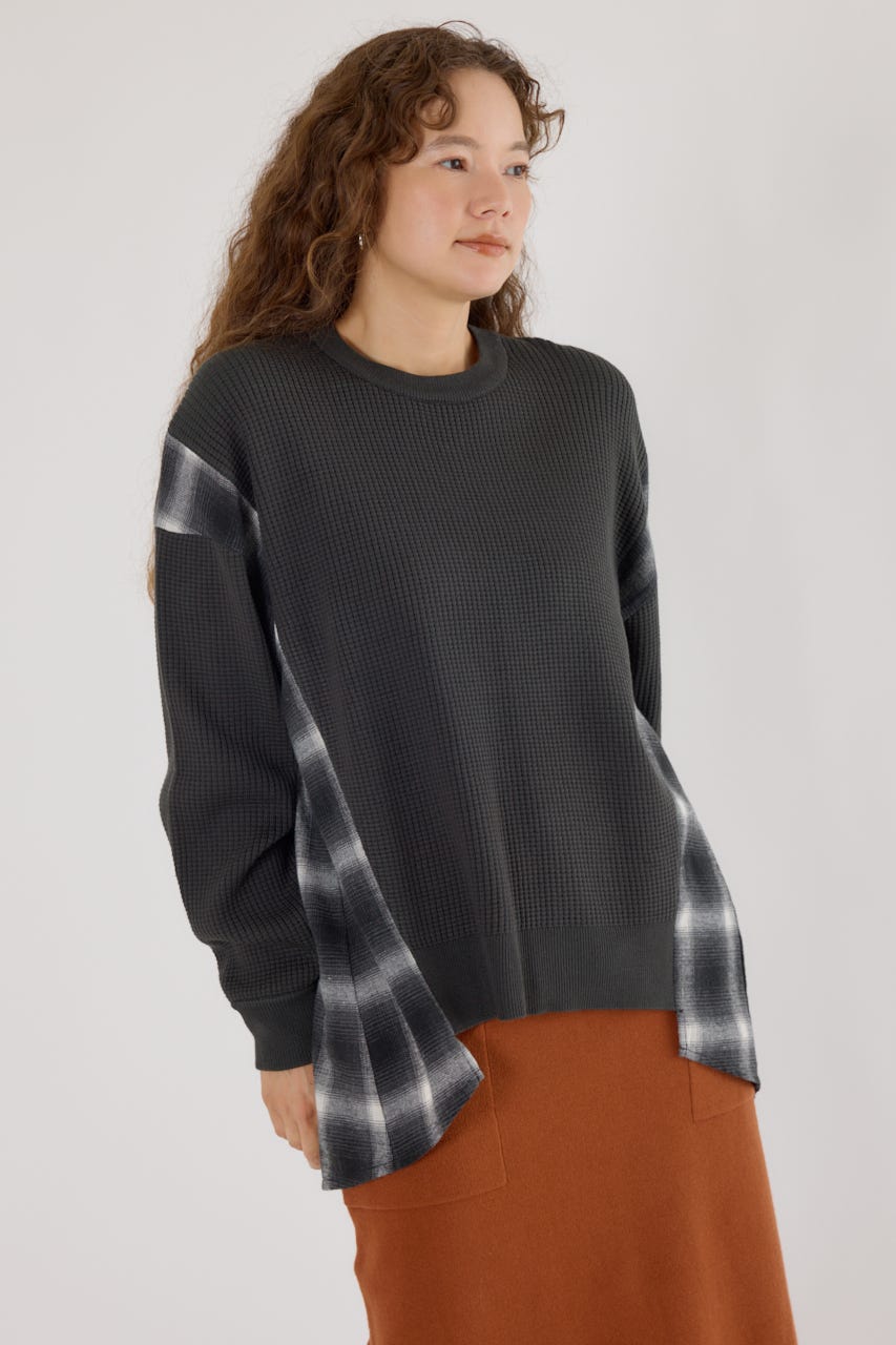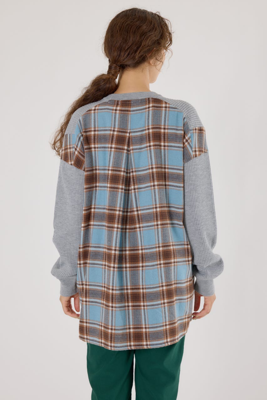 表面感のあるワッフル編みのニットと、チェックシャツのドッキング。