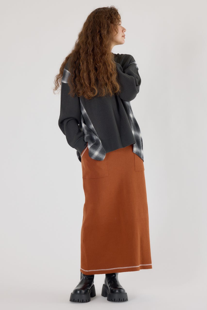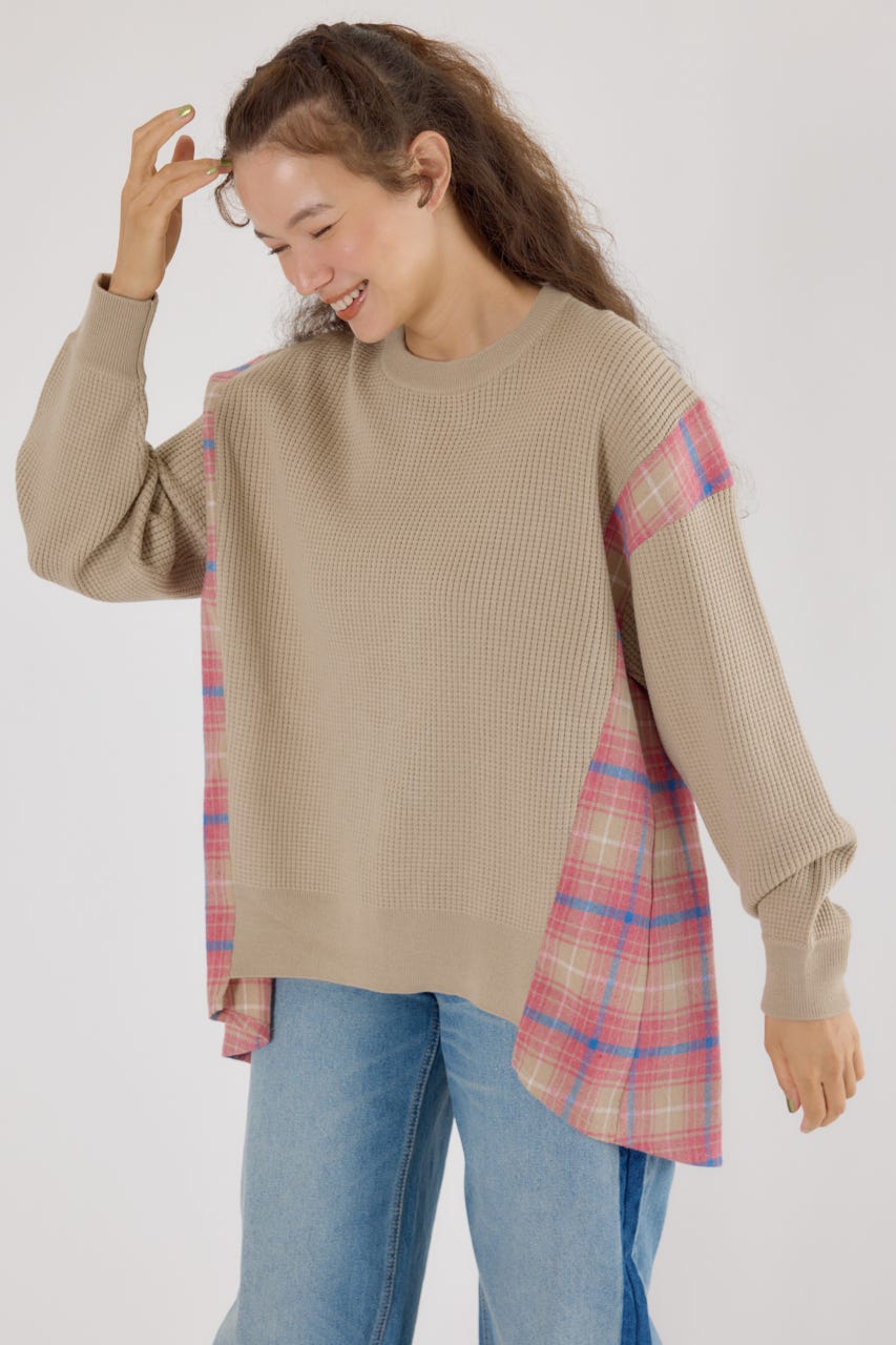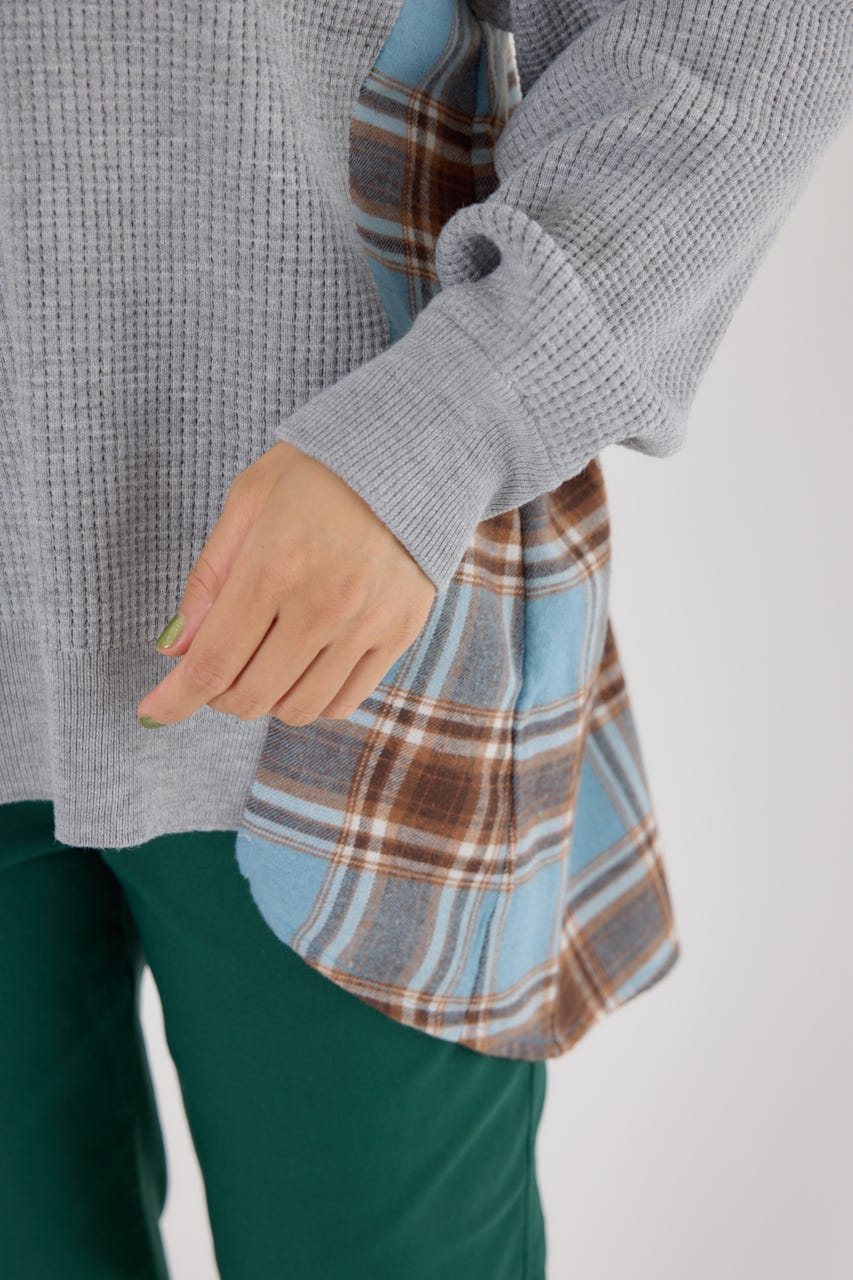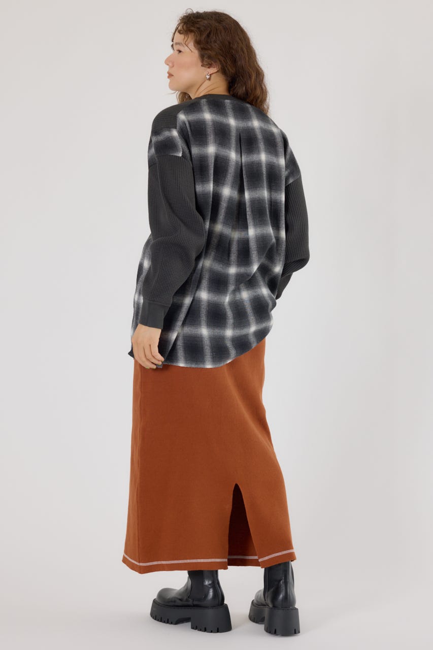 表面感のあるワッフル編みのニットと、チェックシャツのドッキング。