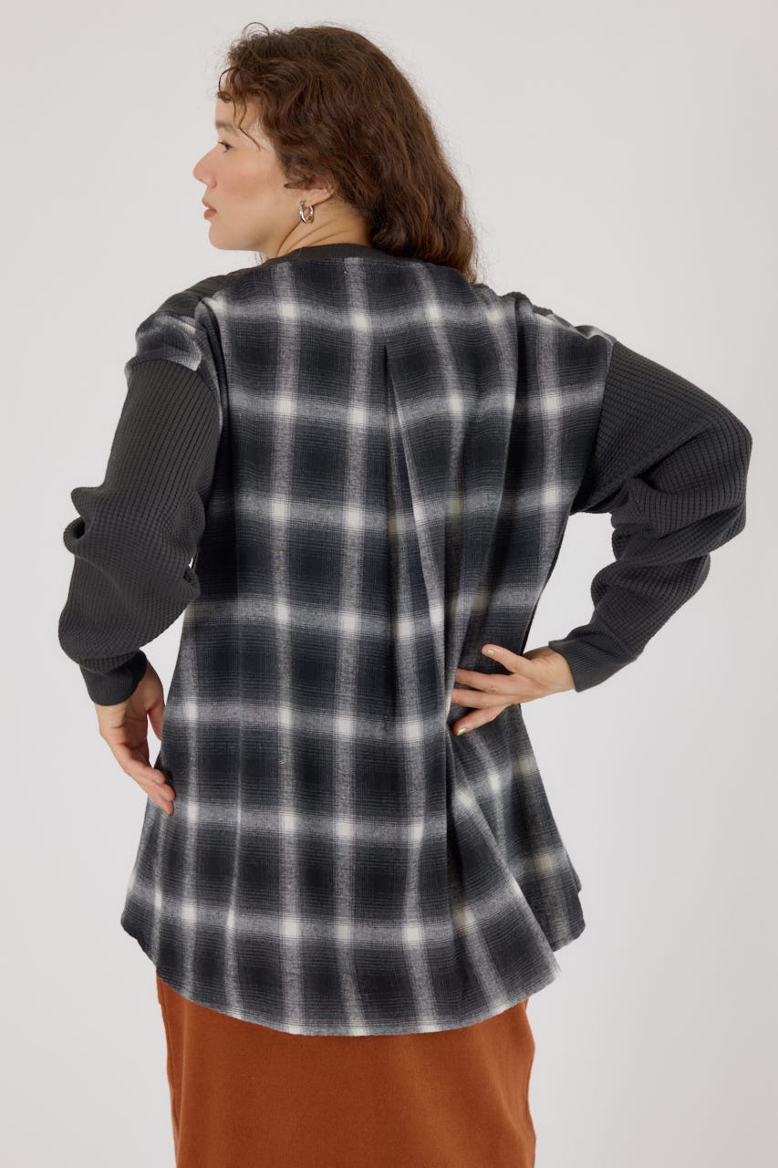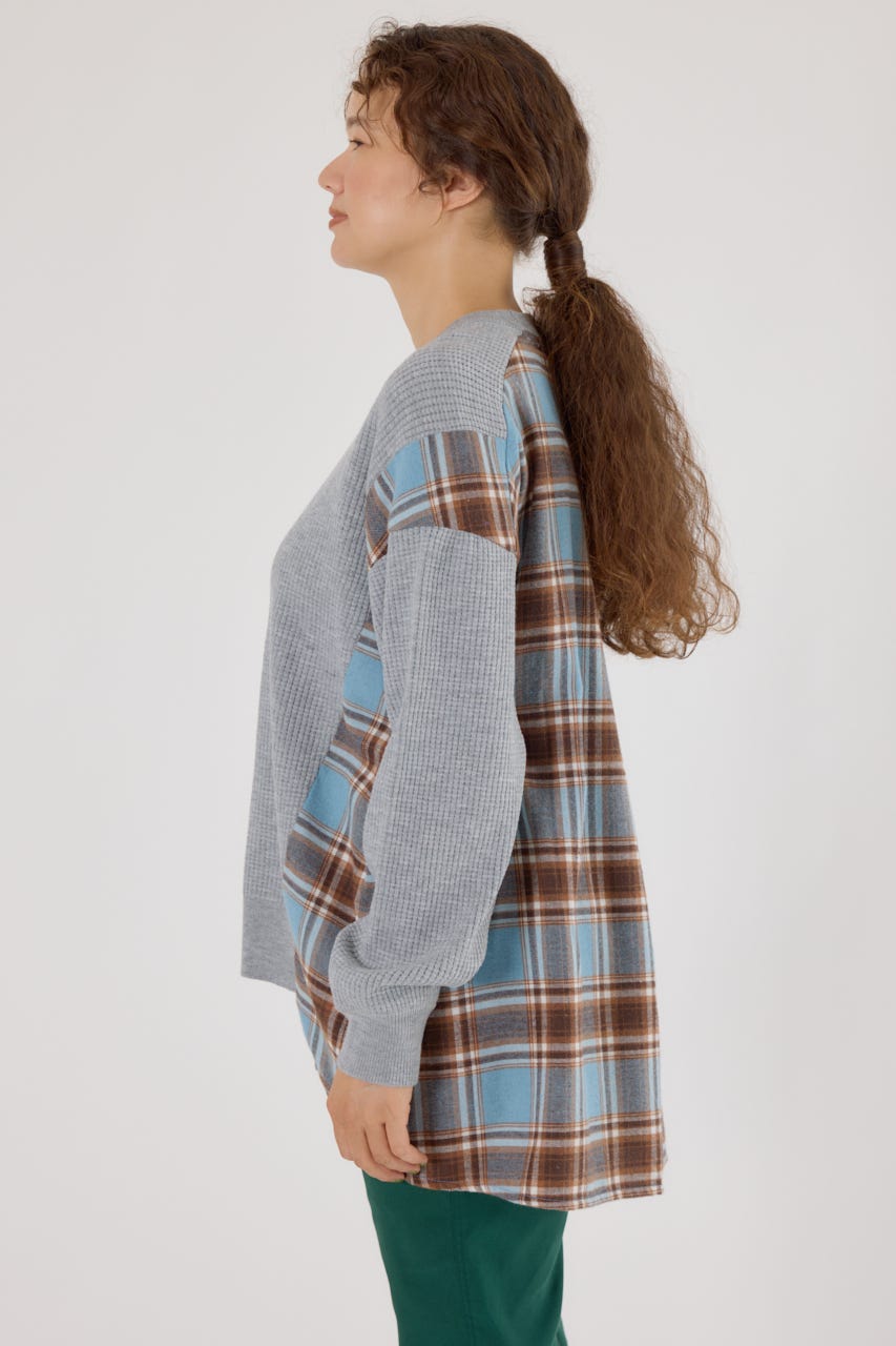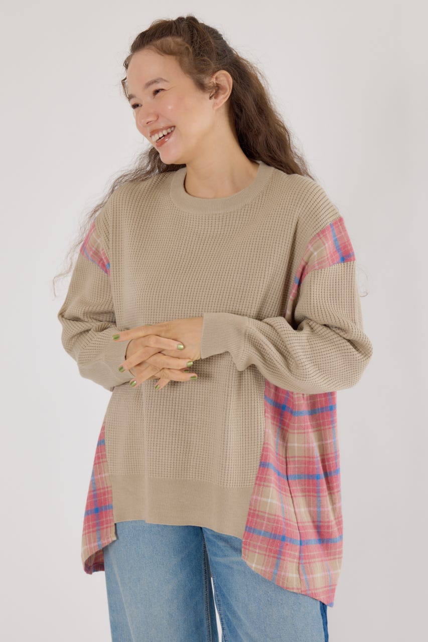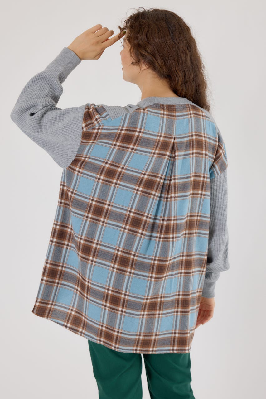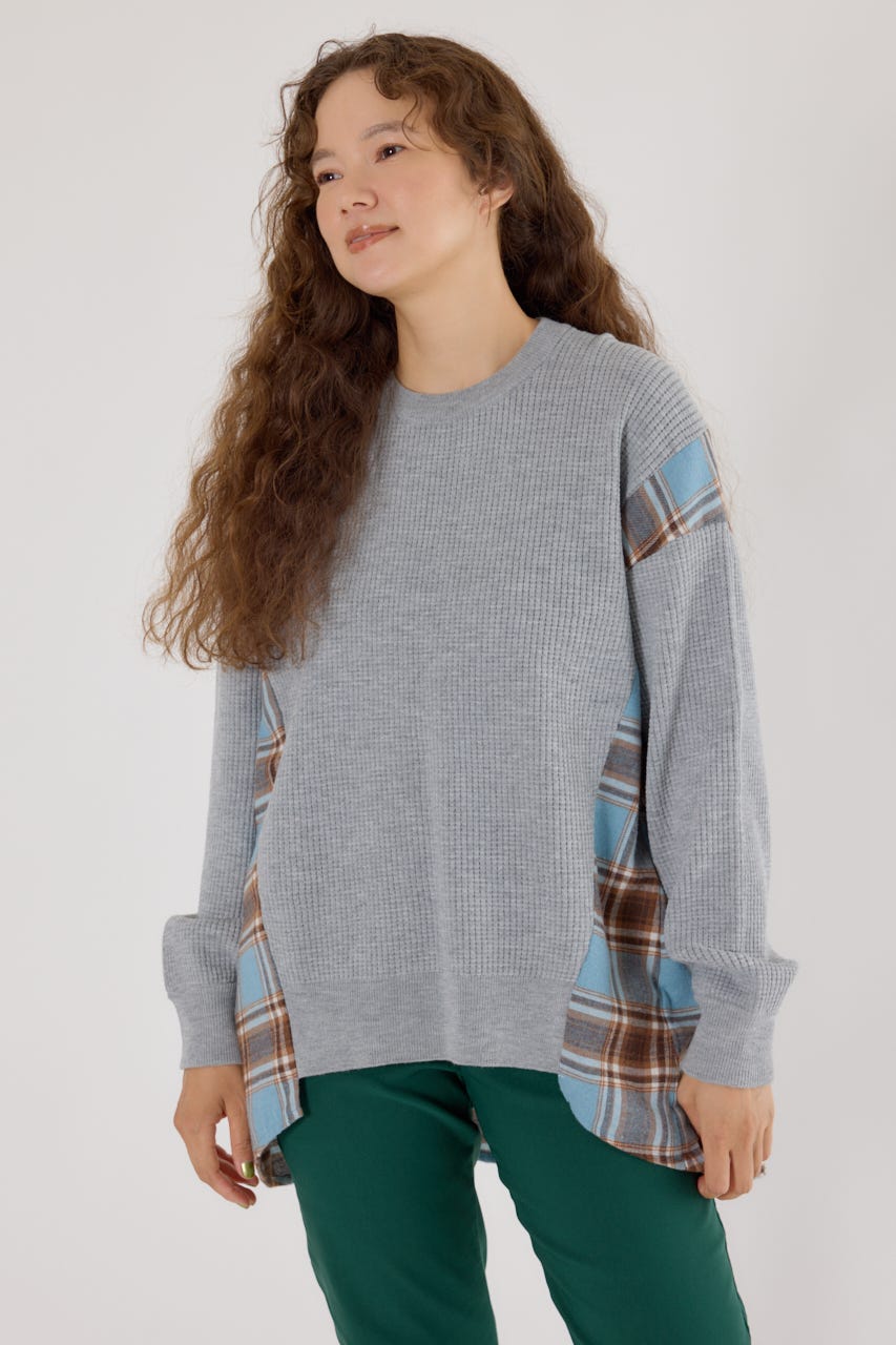 表面感のあるワッフル編みのニットと、チェックシャツのドッキング。