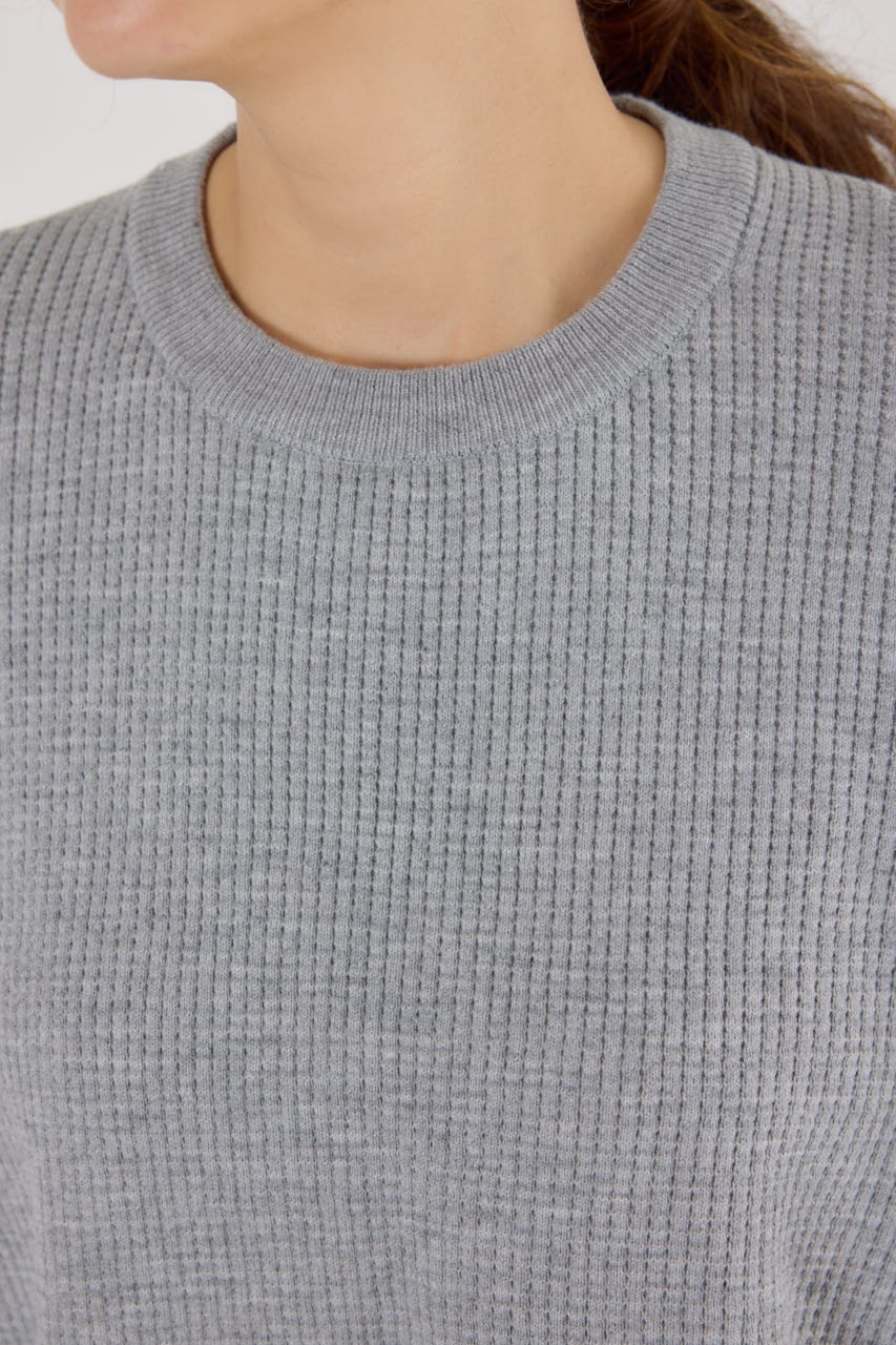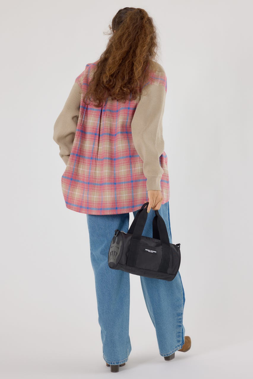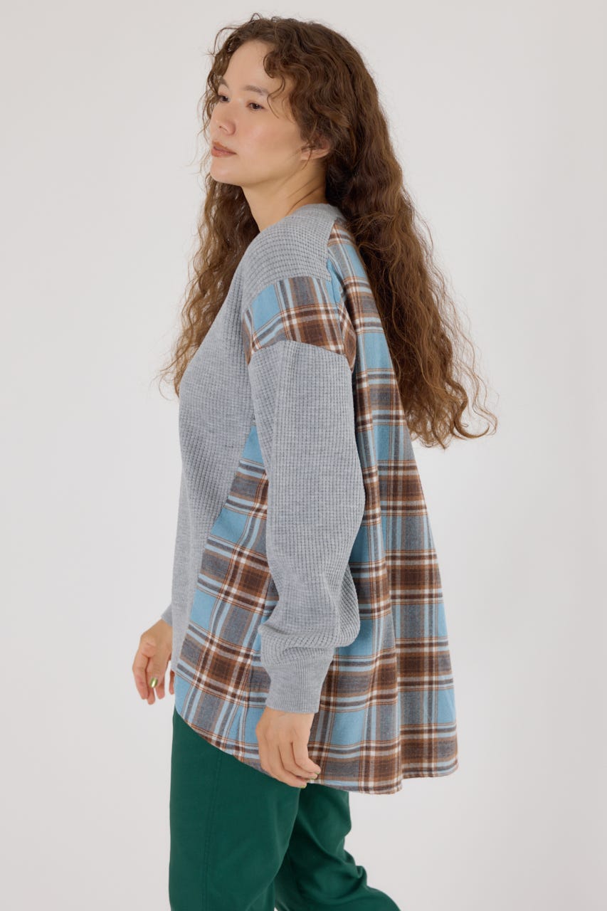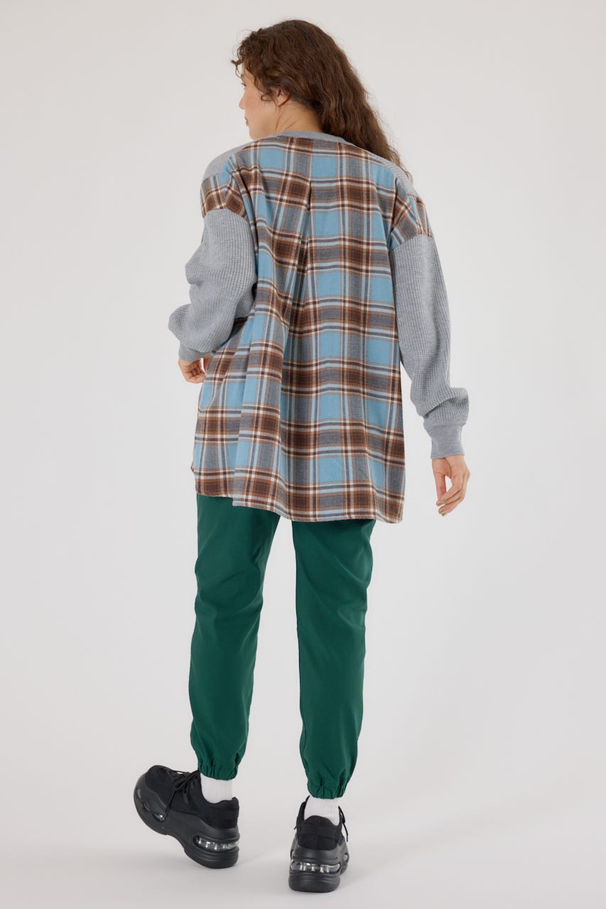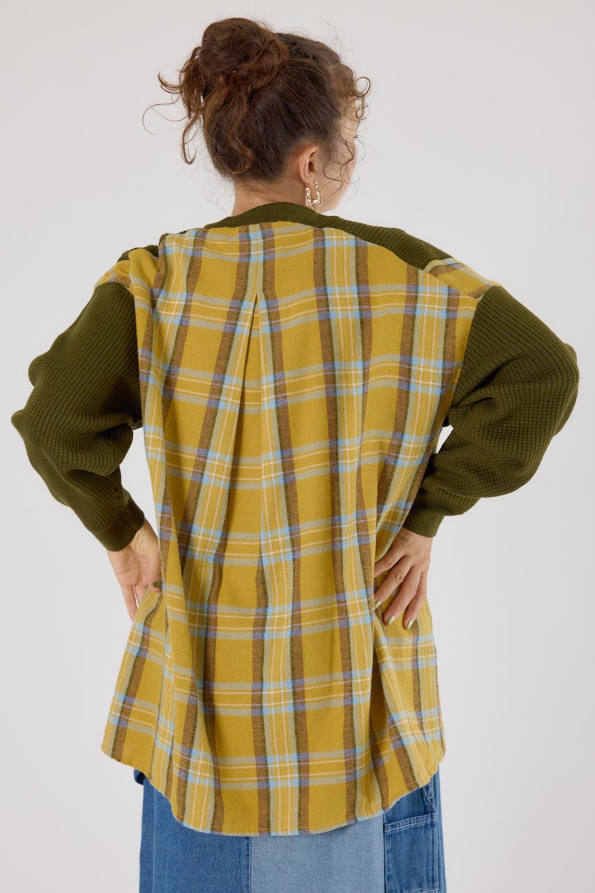 表面感のあるワッフル編みのニットと、チェックシャツのドッキング。