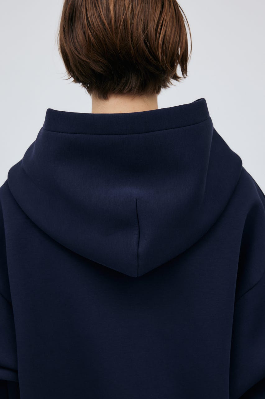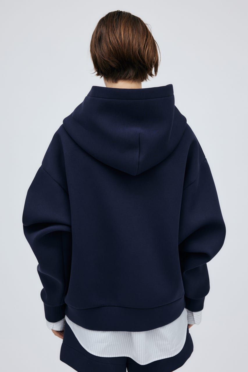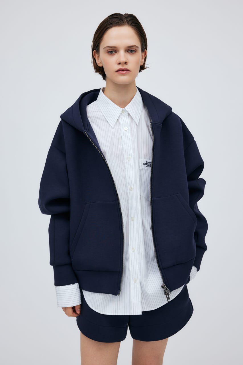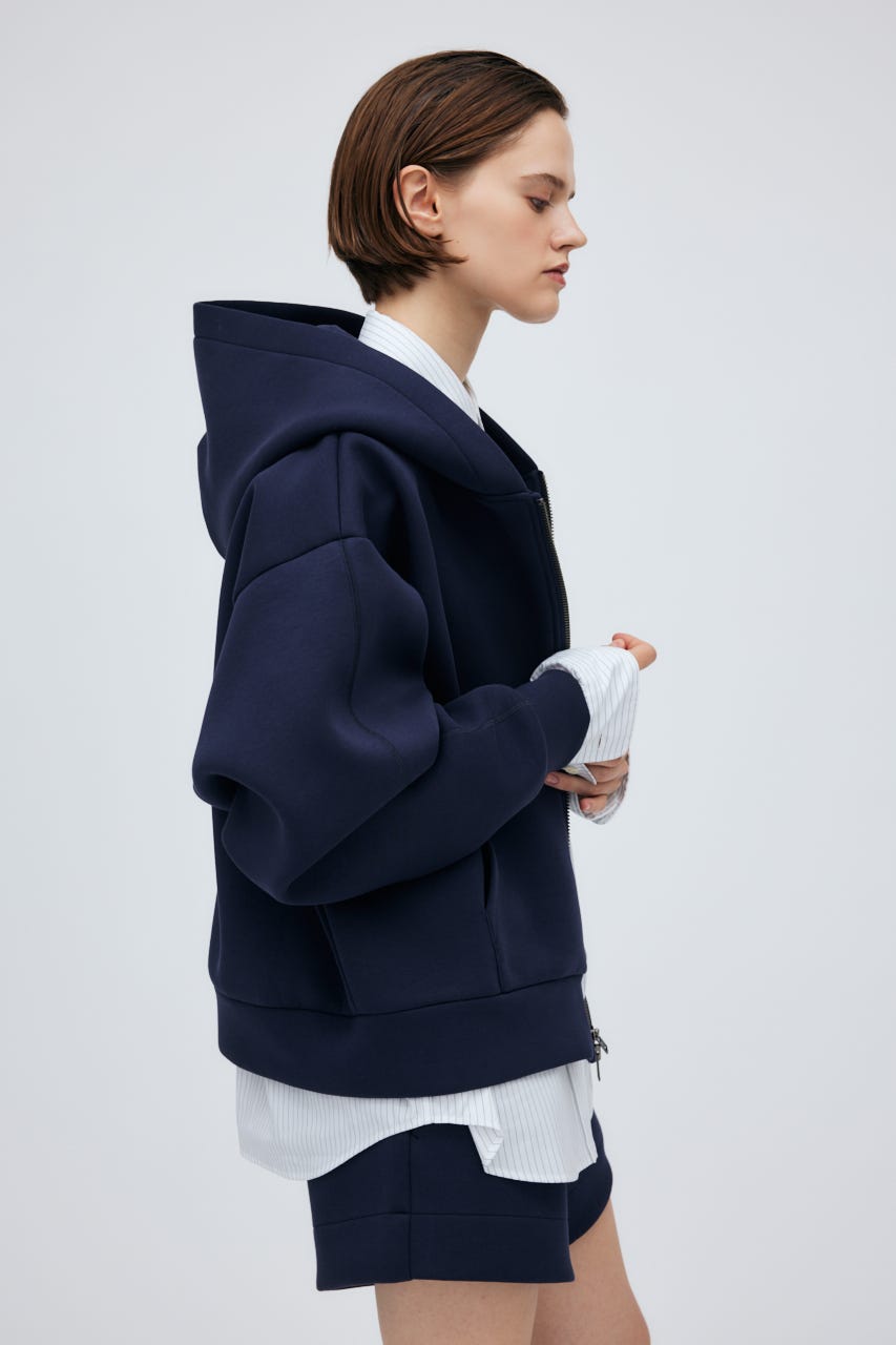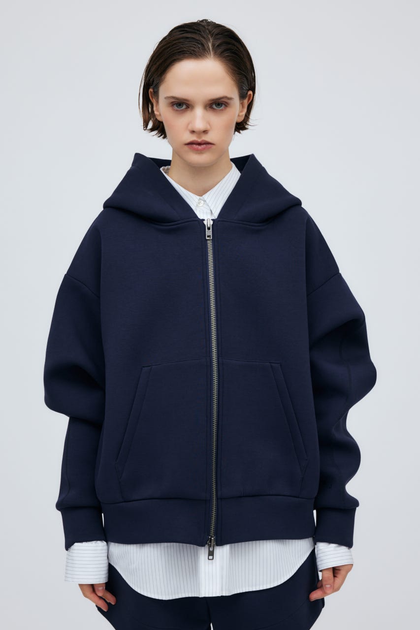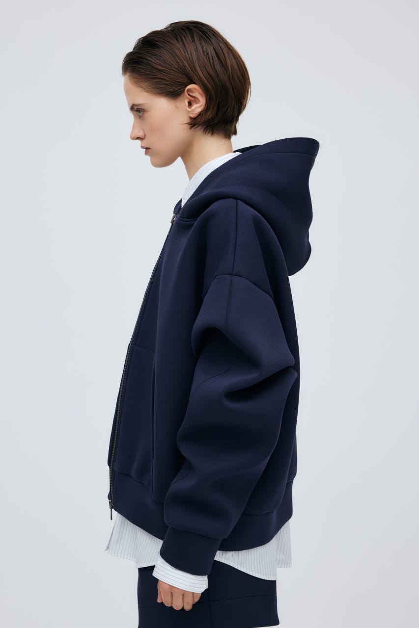 立体感のあるジップアップフーディは、オーバーサイズデザインでスタイリッシュながらも軽い着用感や防寒性と実用性も兼ね揃えた一着。