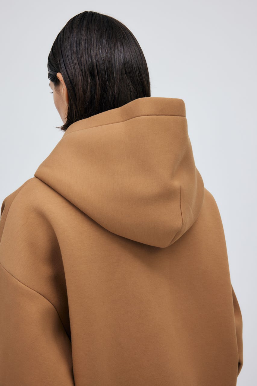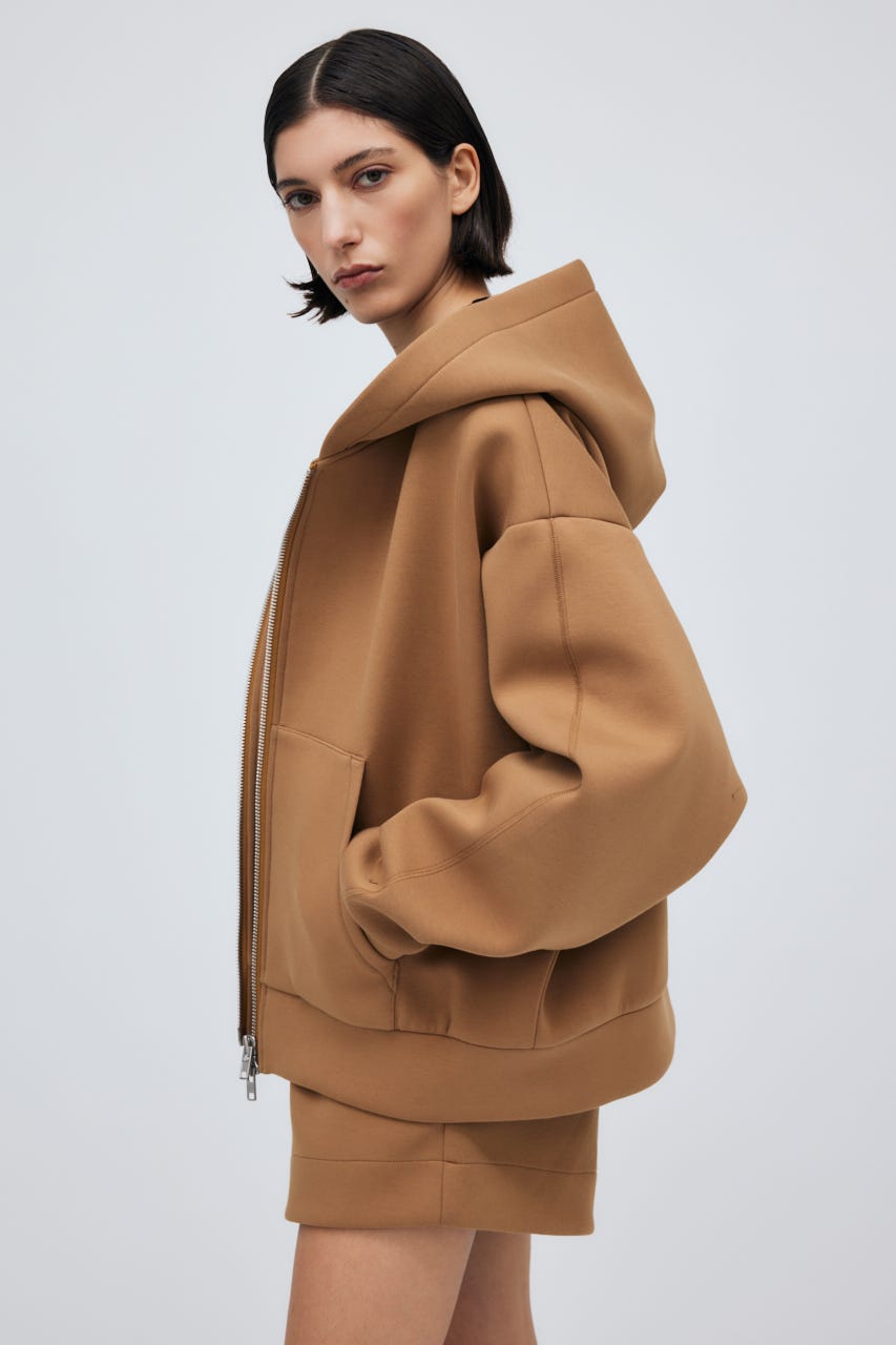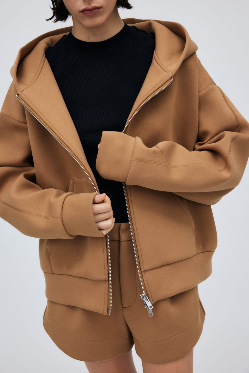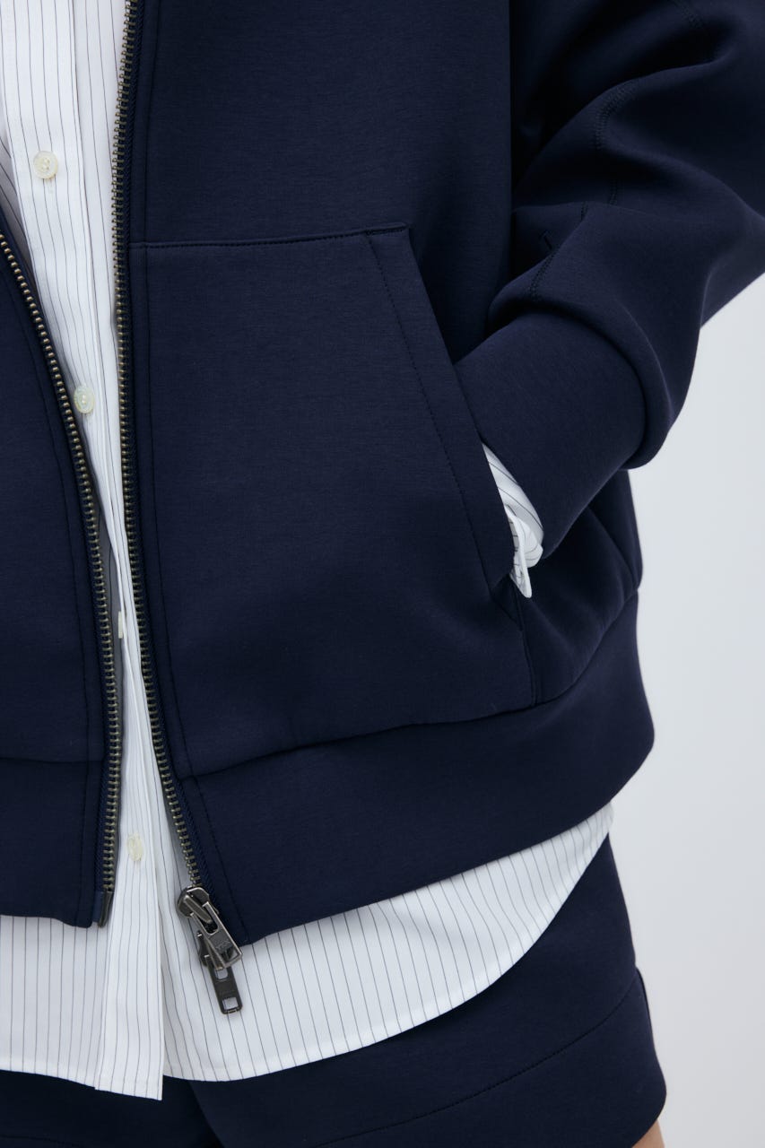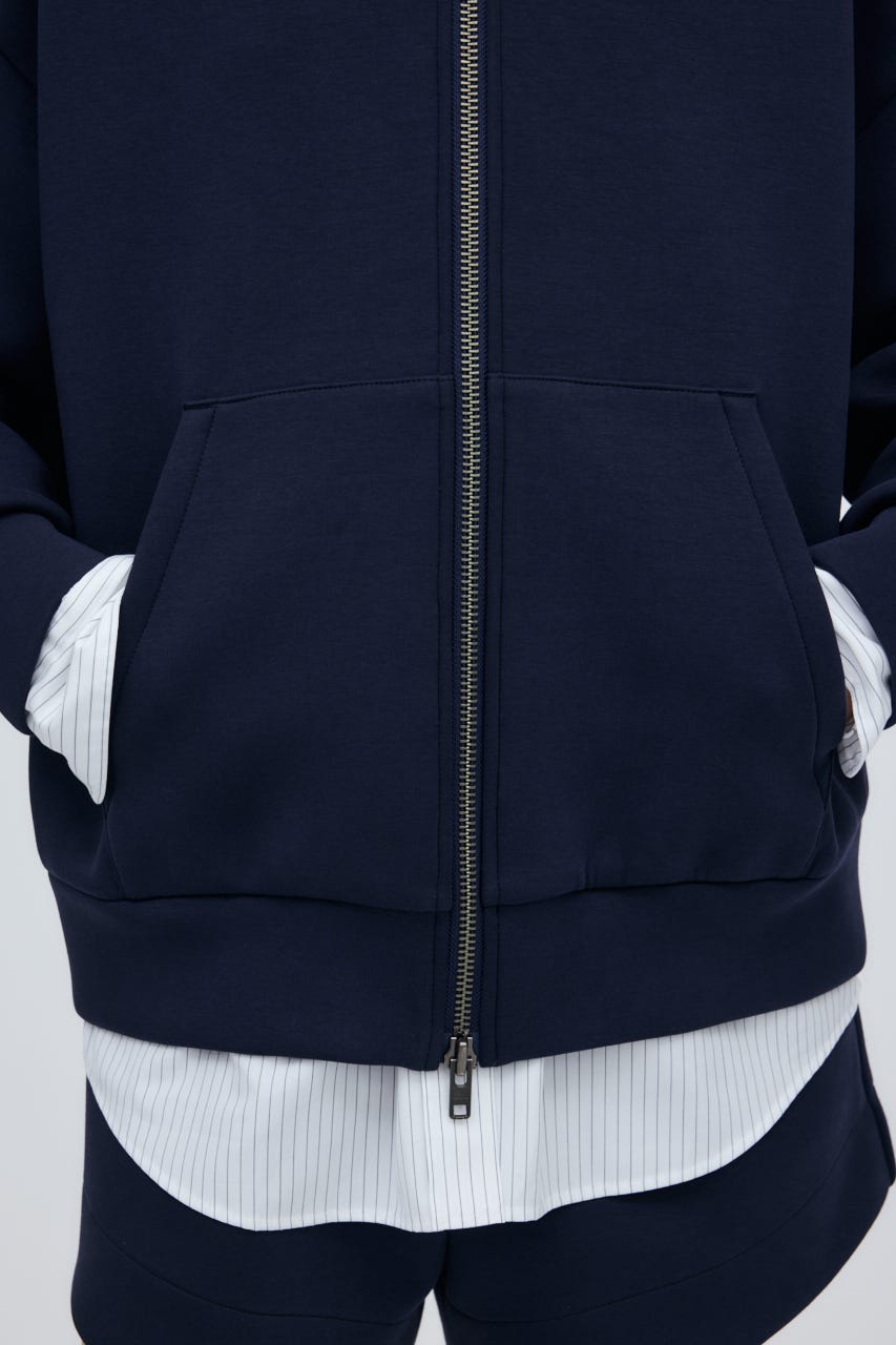 立体感のあるジップアップフーディは、オーバーサイズデザインでスタイリッシュながらも軽い着用感や防寒性と実用性も兼ね揃えた一着。