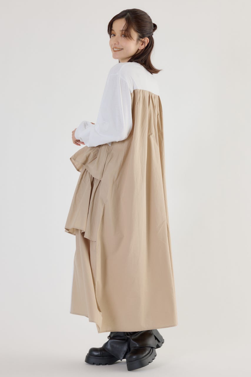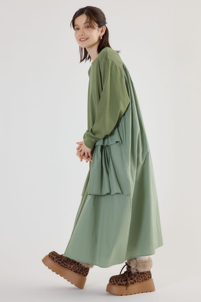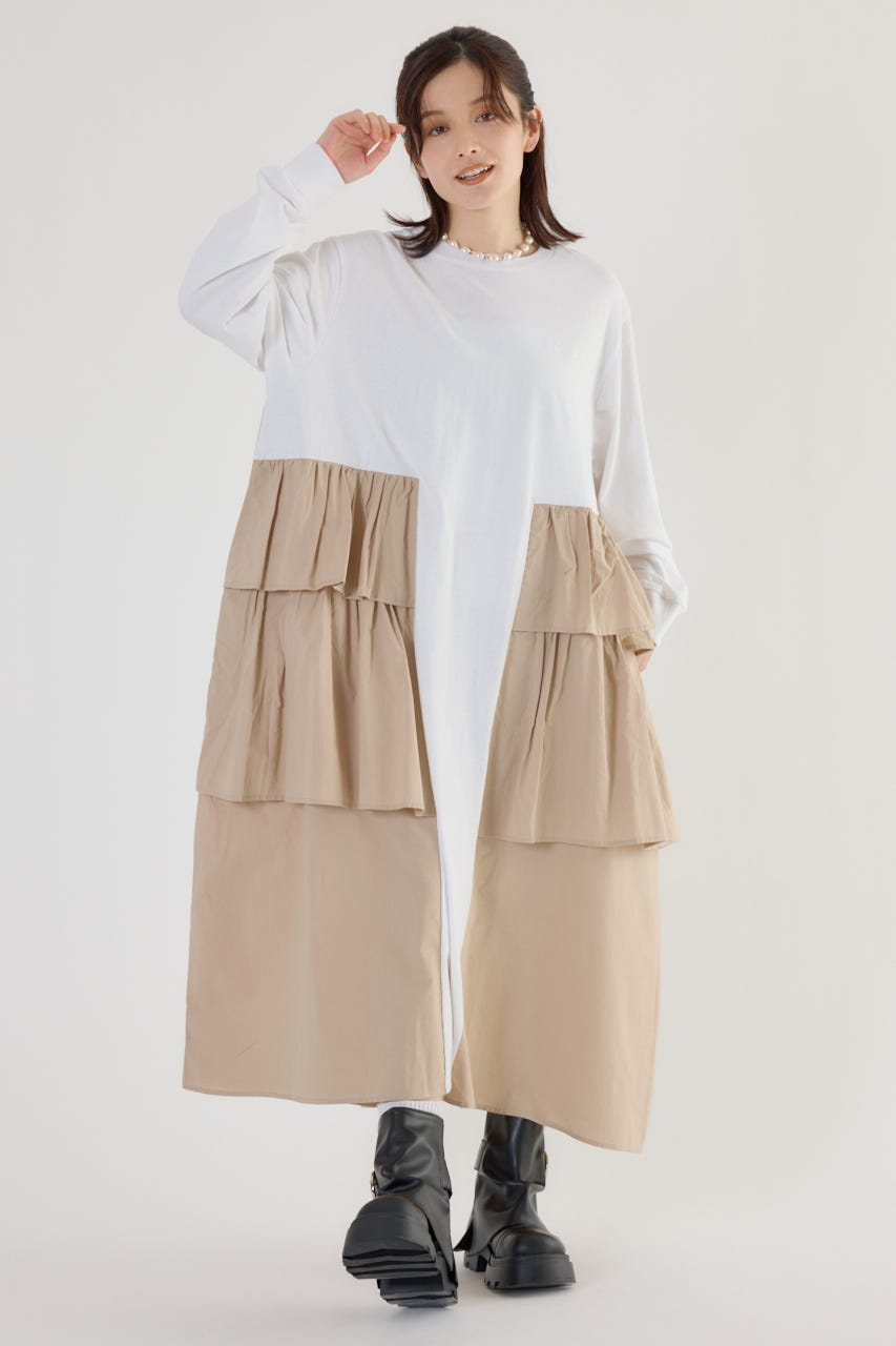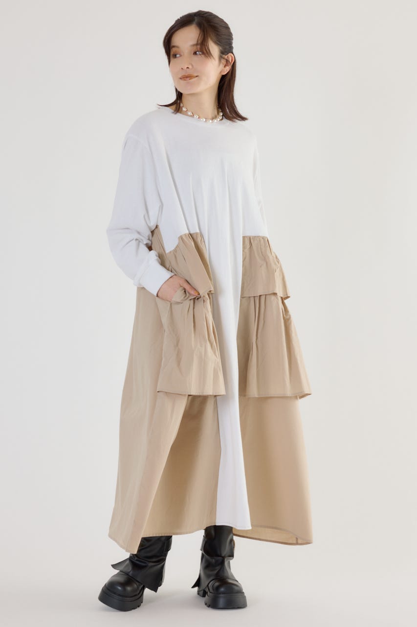 天竺と布帛素材のドッキングが1枚で主役級なワンピース。