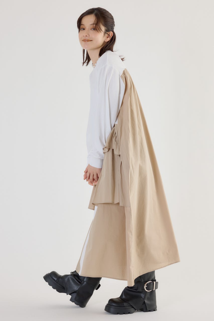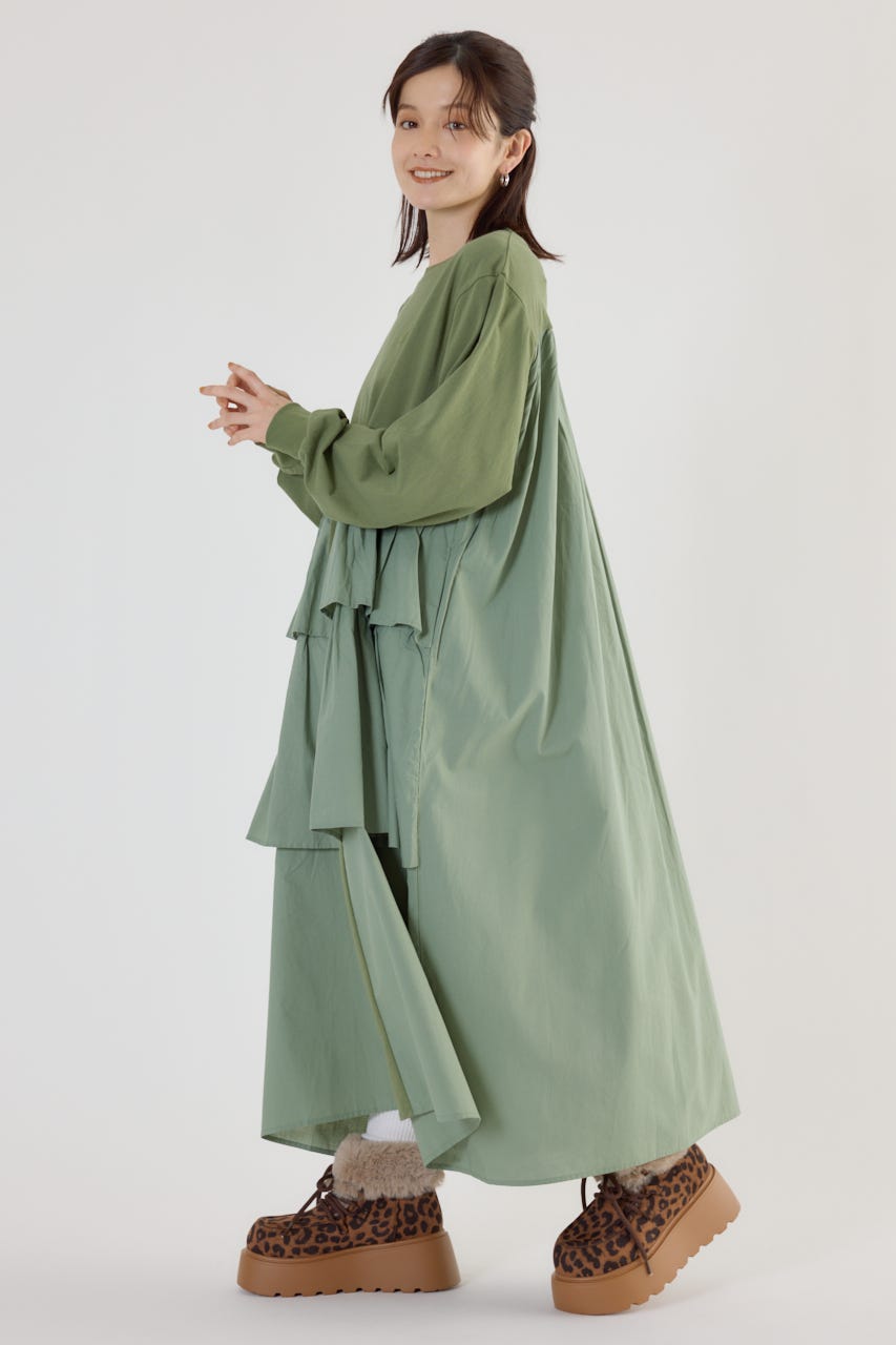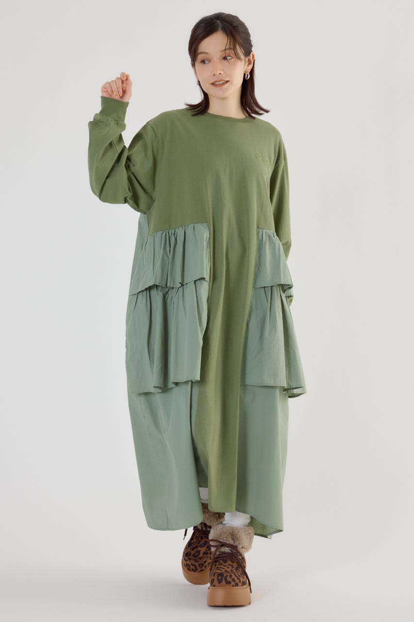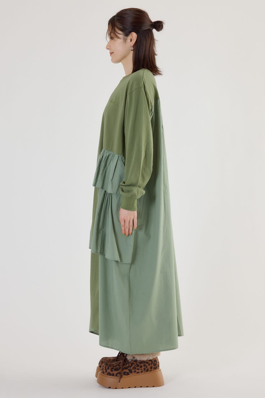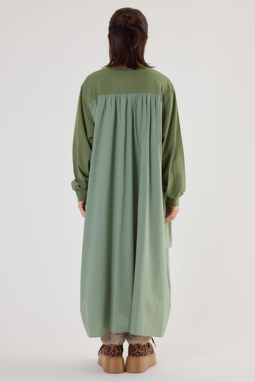 天竺と布帛素材のドッキングが1枚で主役級なワンピース。