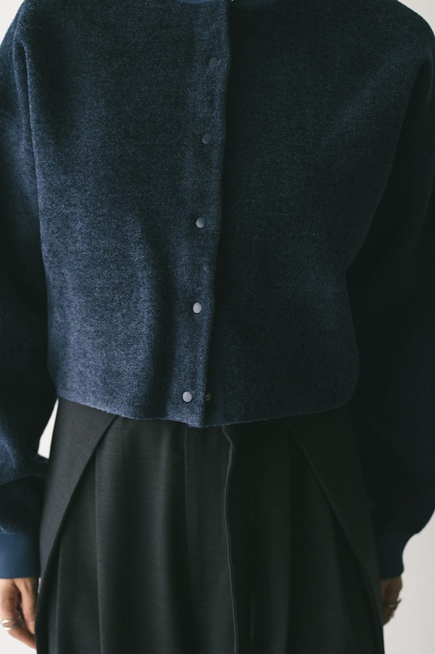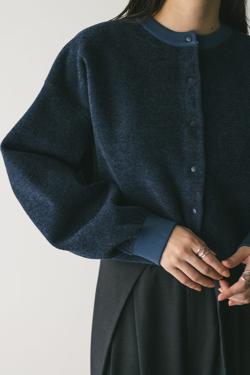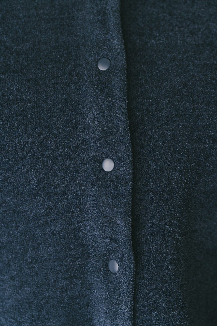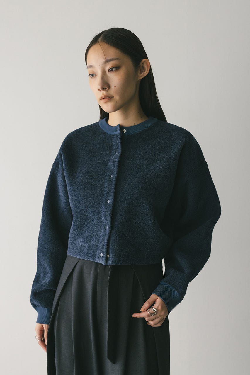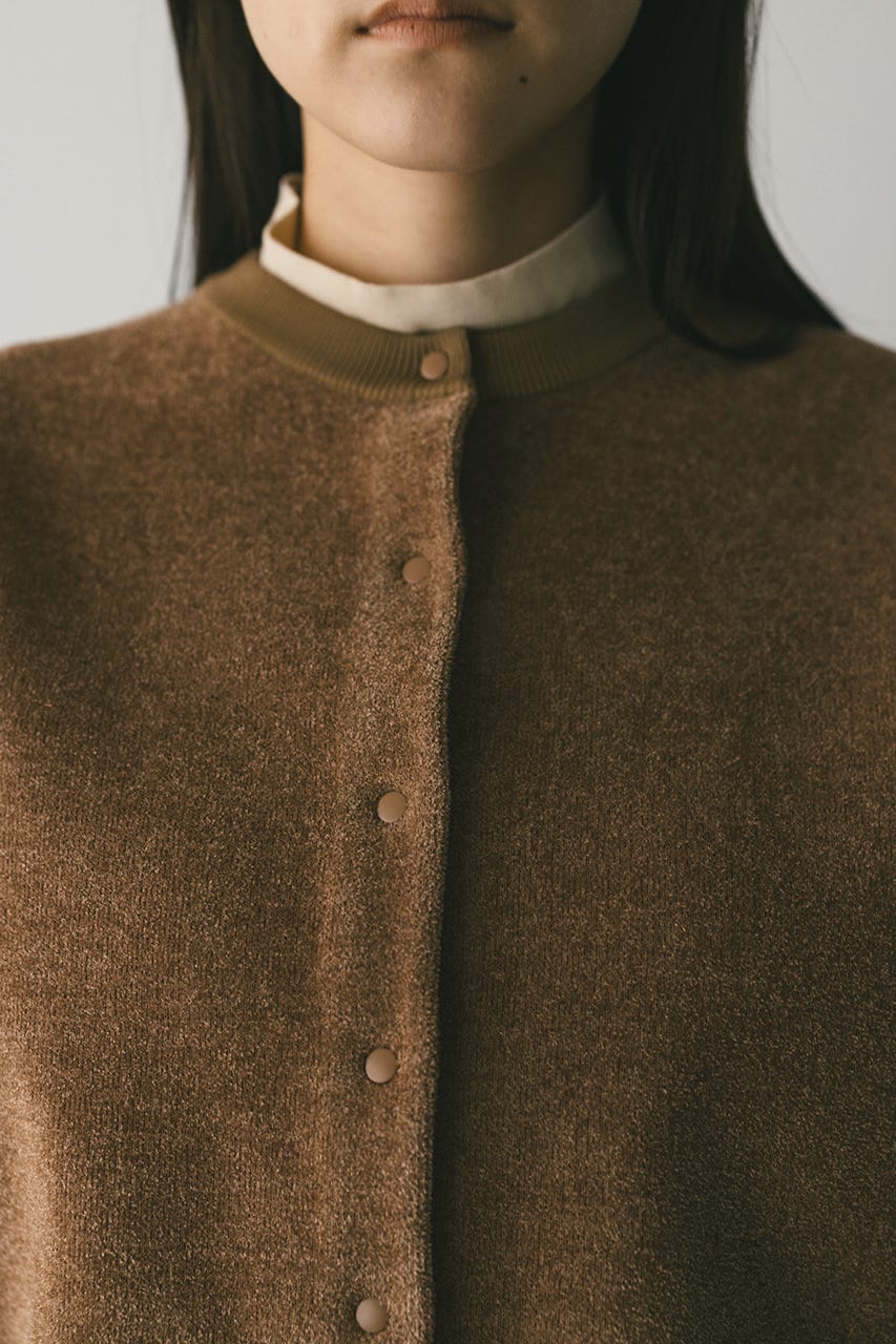 ベロアヤーンとなめらかで上品艶のポリエステル糸を編み立てたリバーシブルベロアニットカーデ。