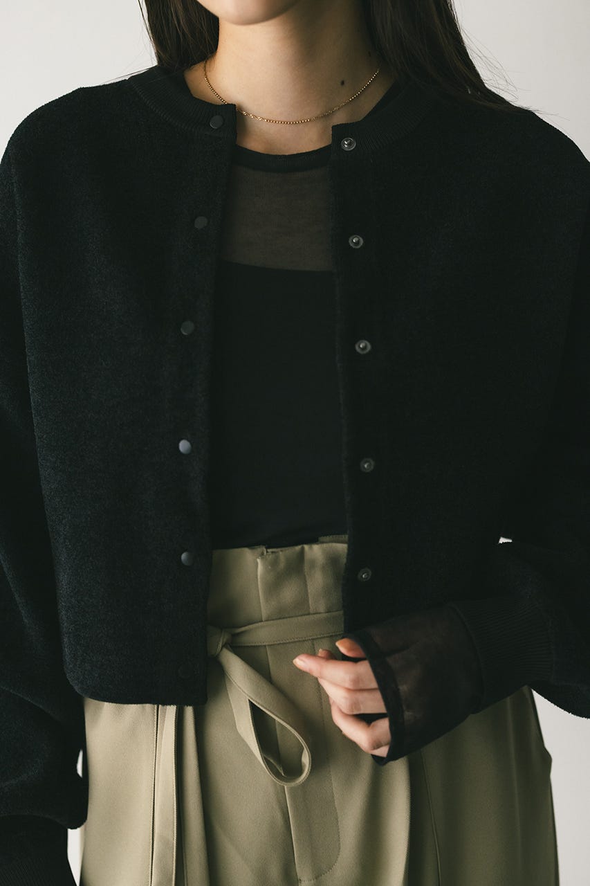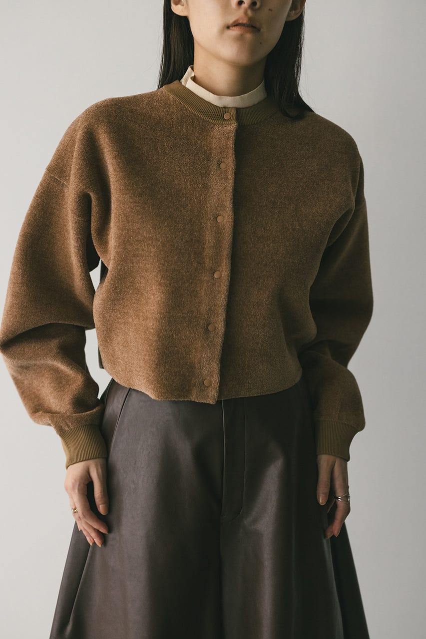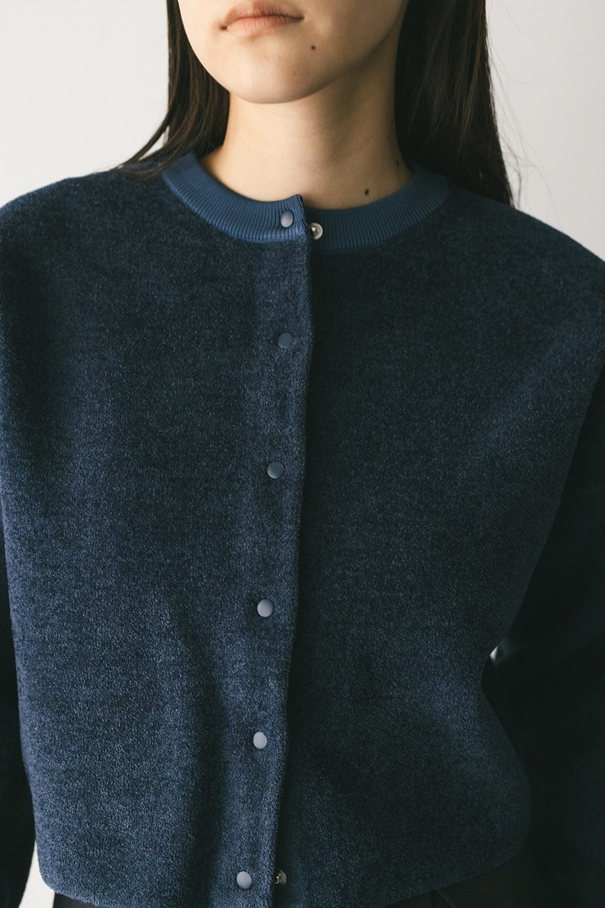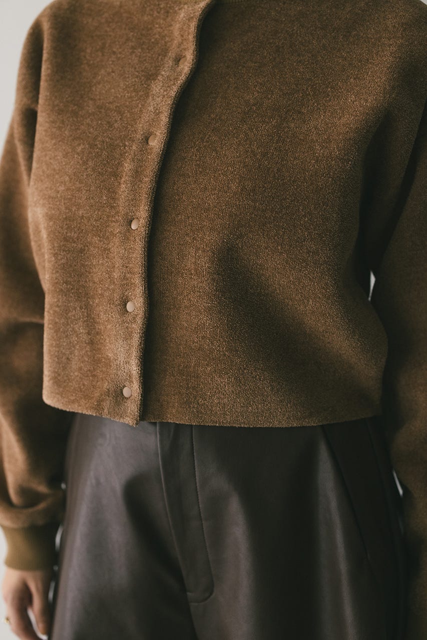 ベロアヤーンとなめらかで上品艶のポリエステル糸を編み立てたリバーシブルベロアニットカーデ。