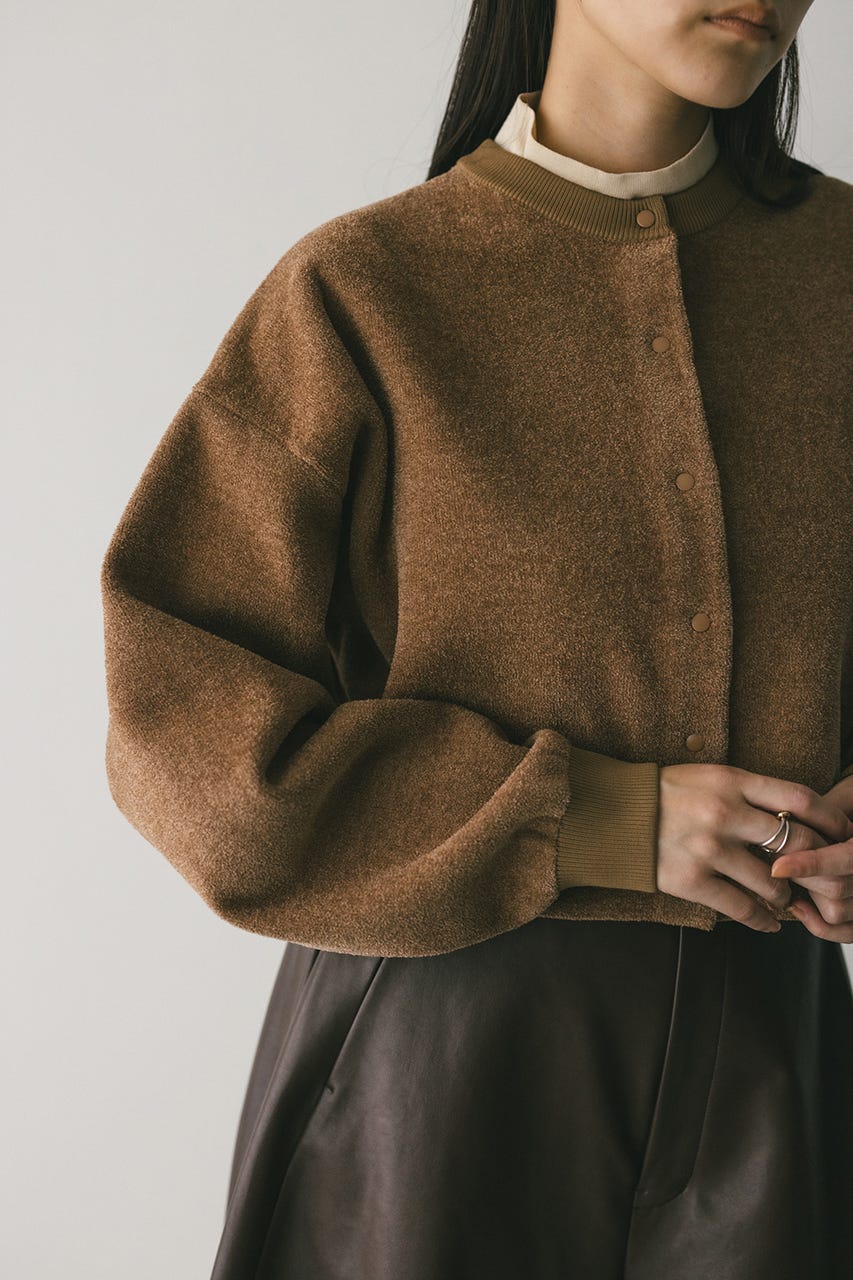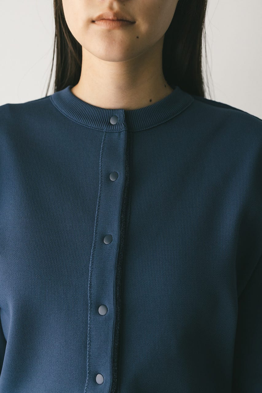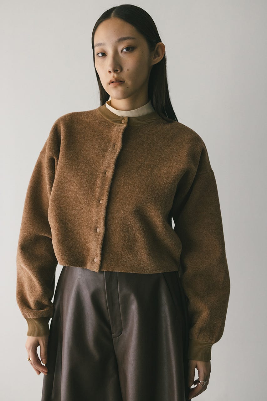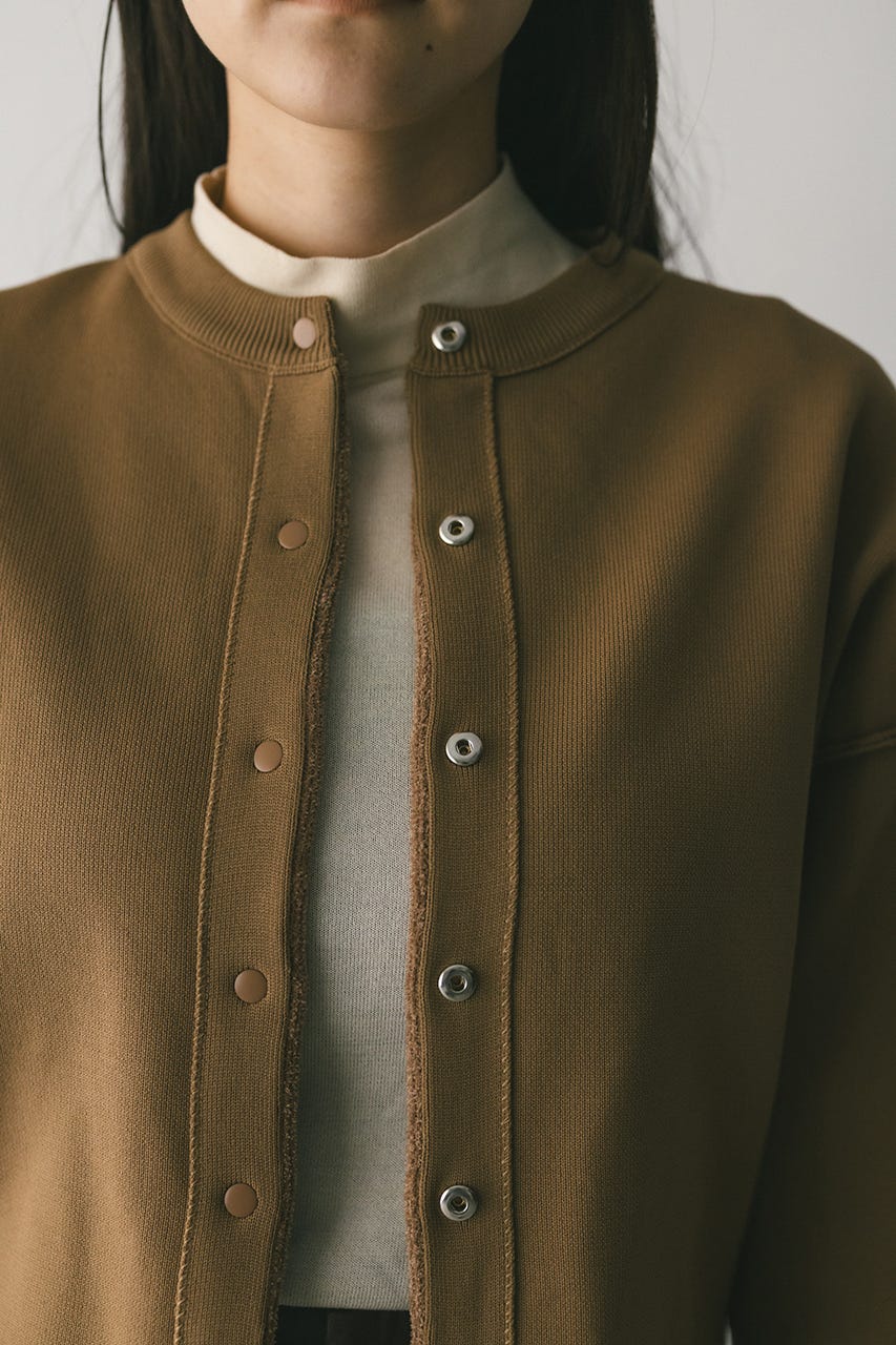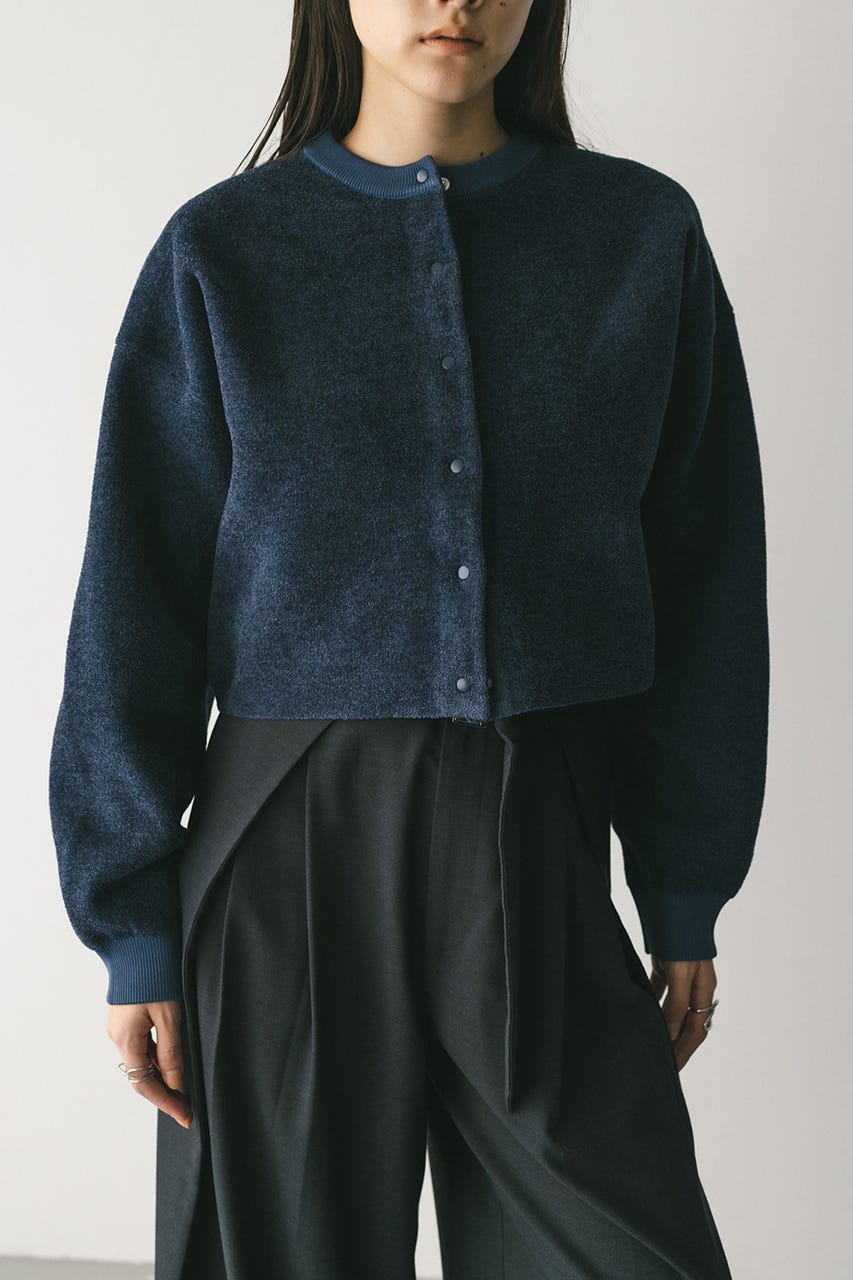 ベロアヤーンとなめらかで上品艶のポリエステル糸を編み立てたリバーシブルベロアニットカーデ。
