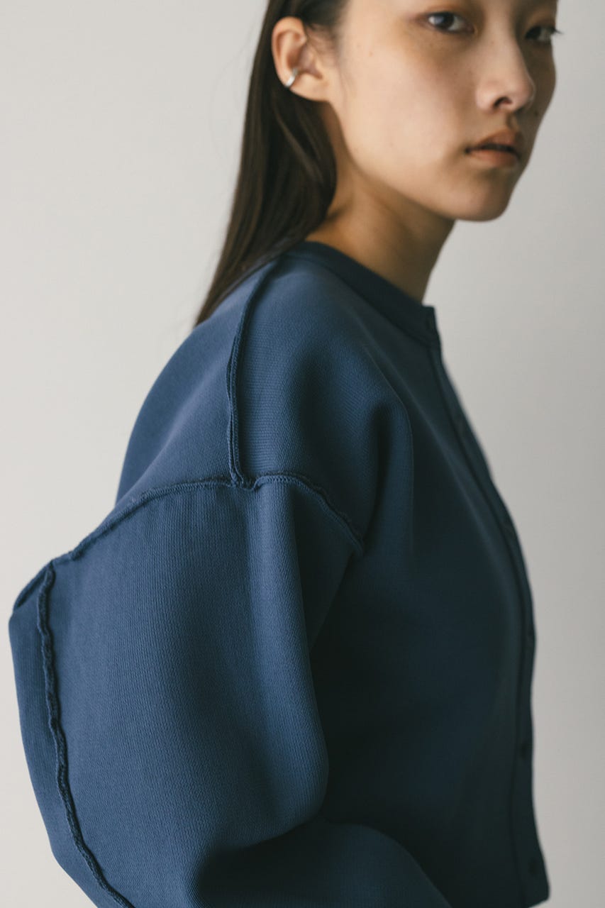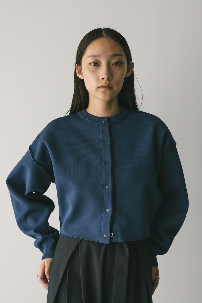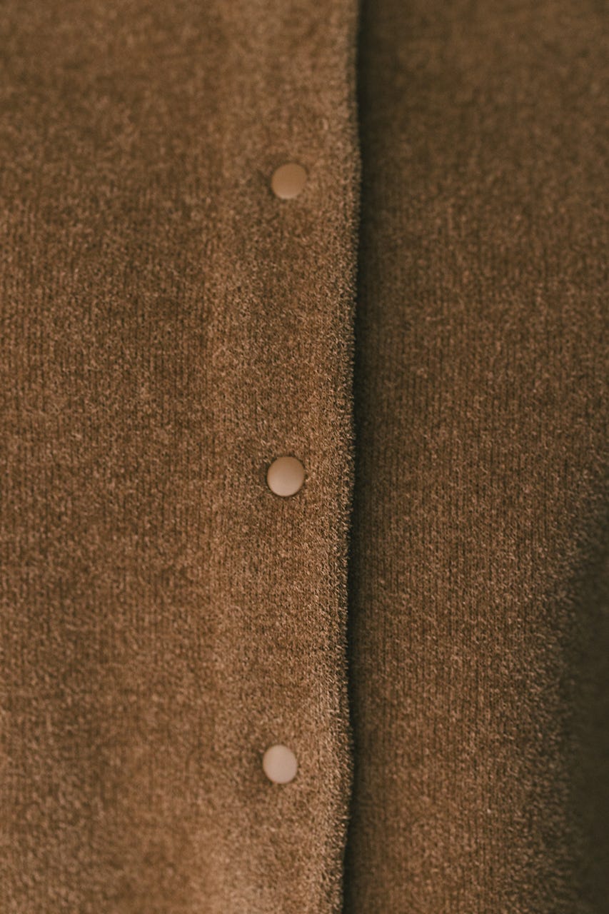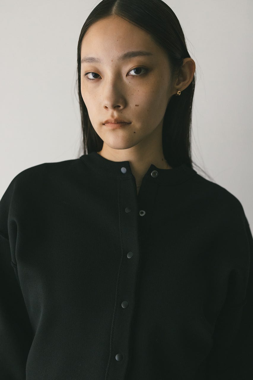 ベロアヤーンとなめらかで上品艶のポリエステル糸を編み立てたリバーシブルベロアニットカーデ。