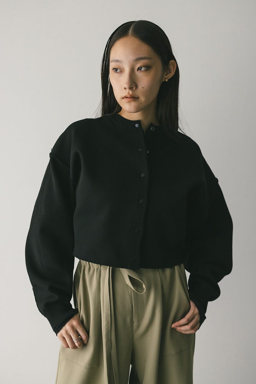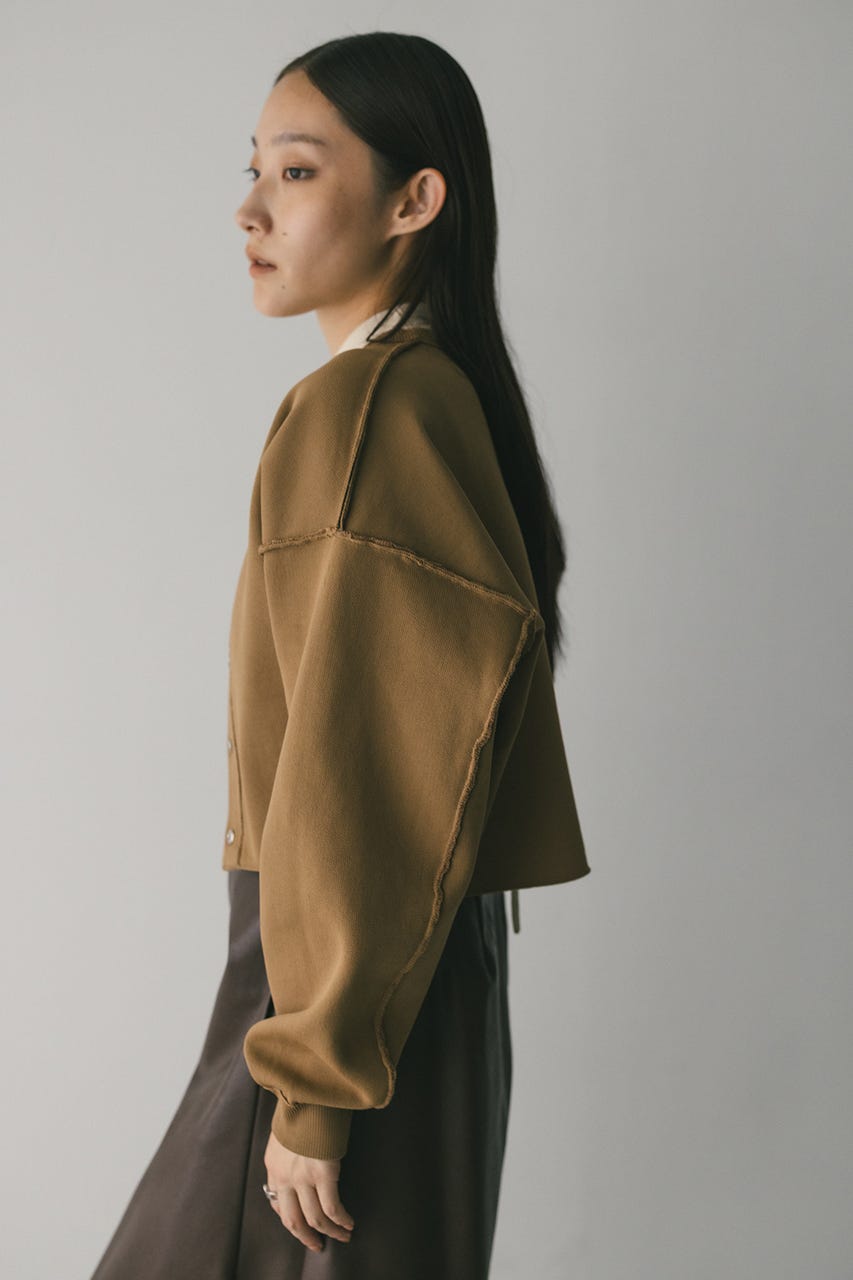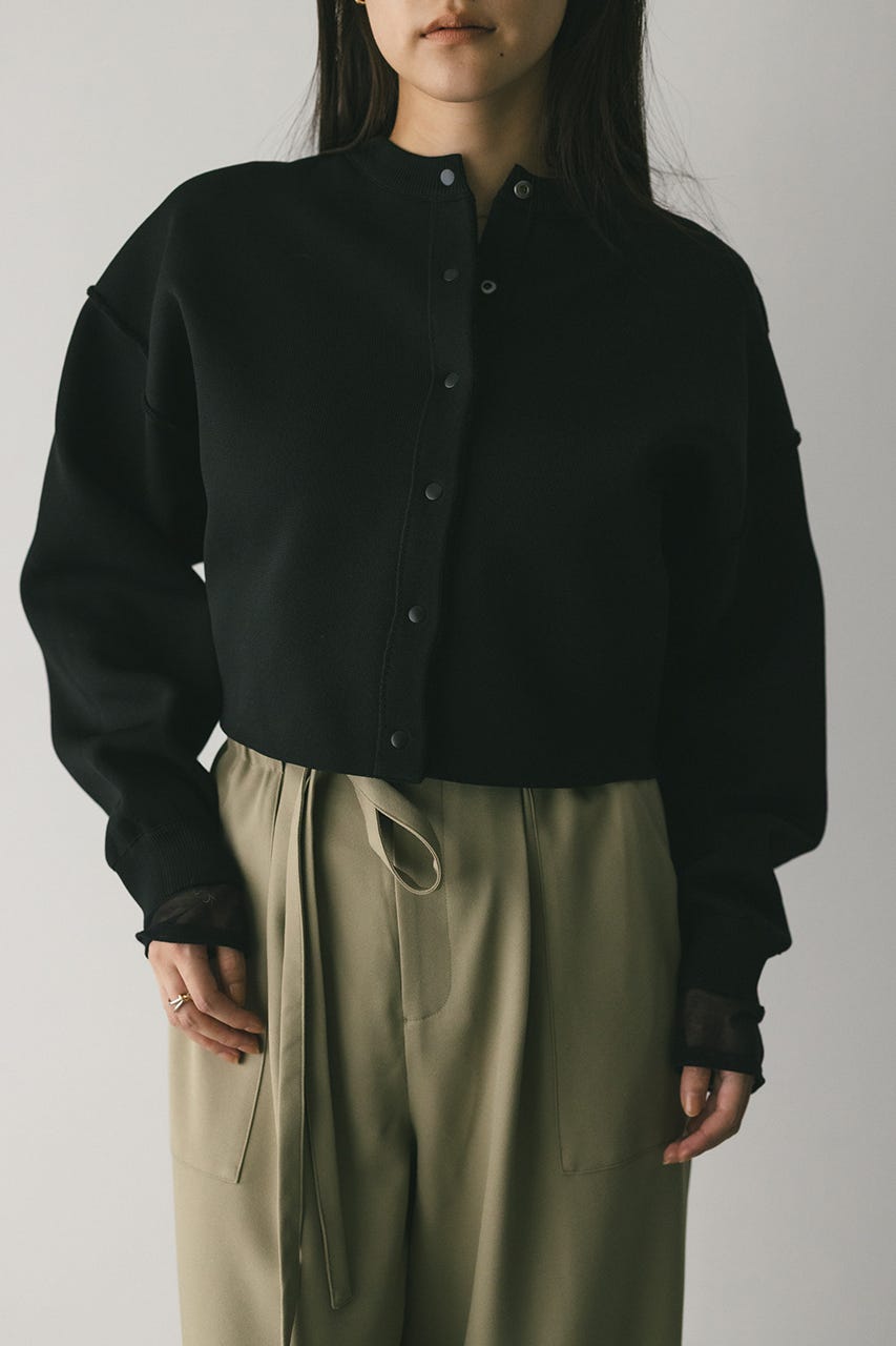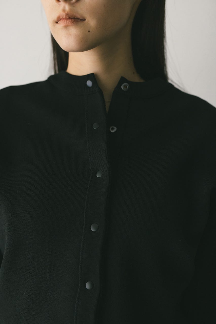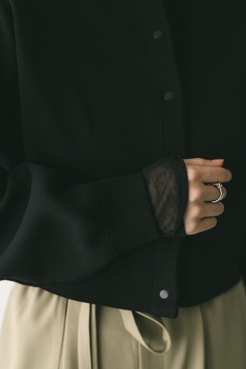 ベロアヤーンとなめらかで上品艶のポリエステル糸を編み立てたリバーシブルベロアニットカーデ。