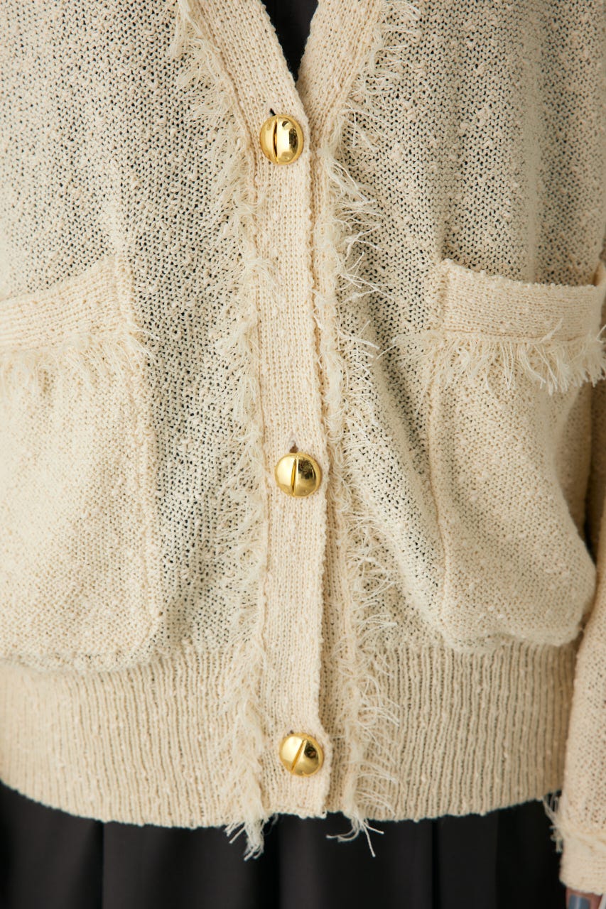 前立てや袖口、ポケット口にはフリンジをあしらって、ツイードジャケットライクに。