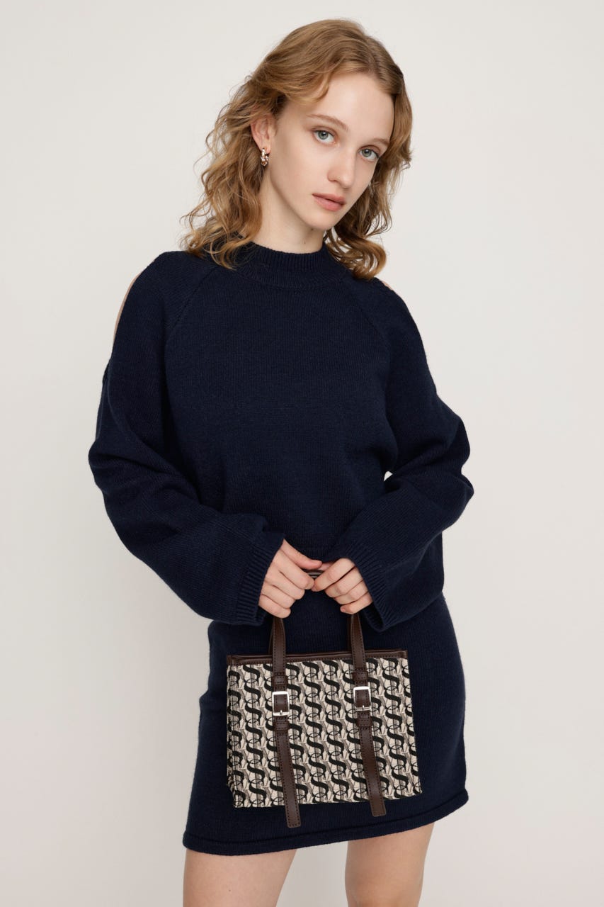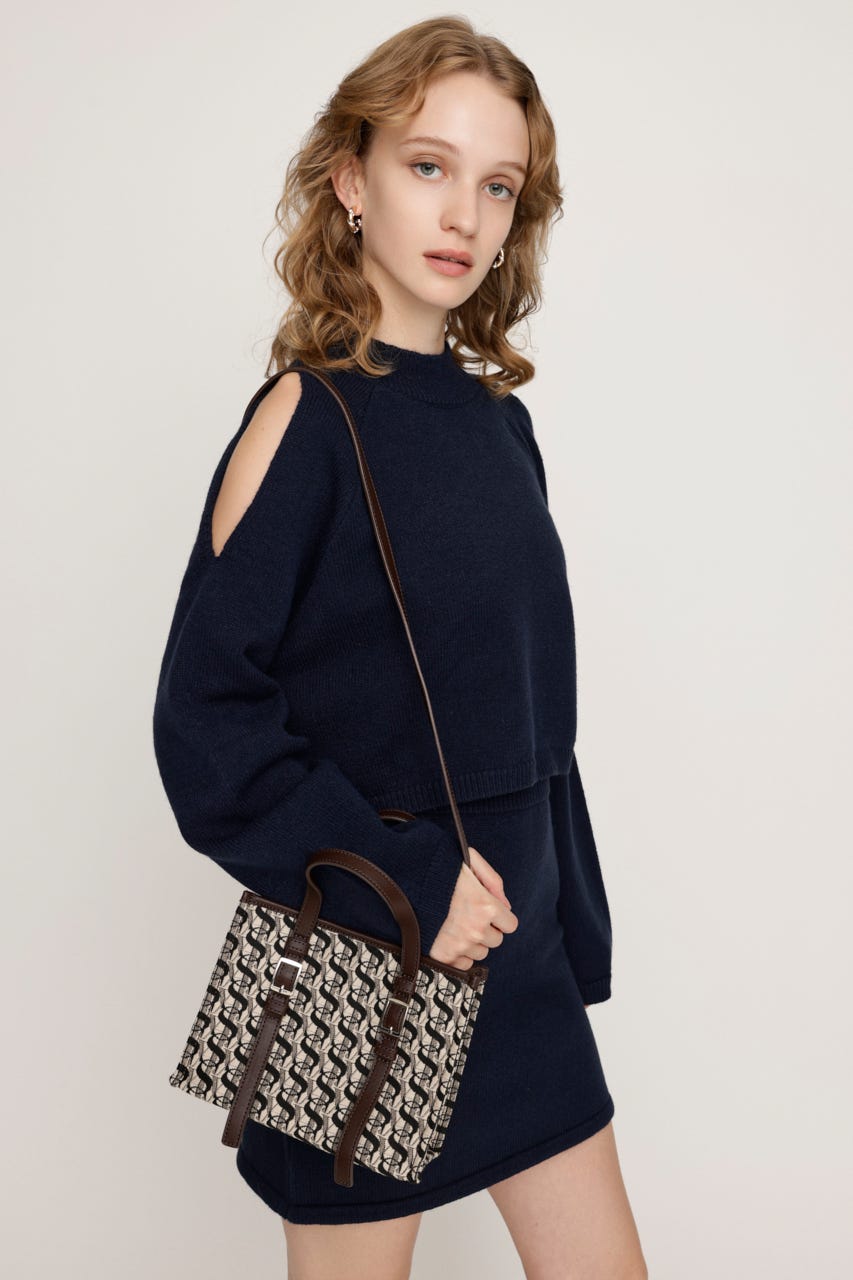 しっかりとハリのあるジャガード生地とフェイクレザーのハンドルが上品かつモードな印象のアイテムです。