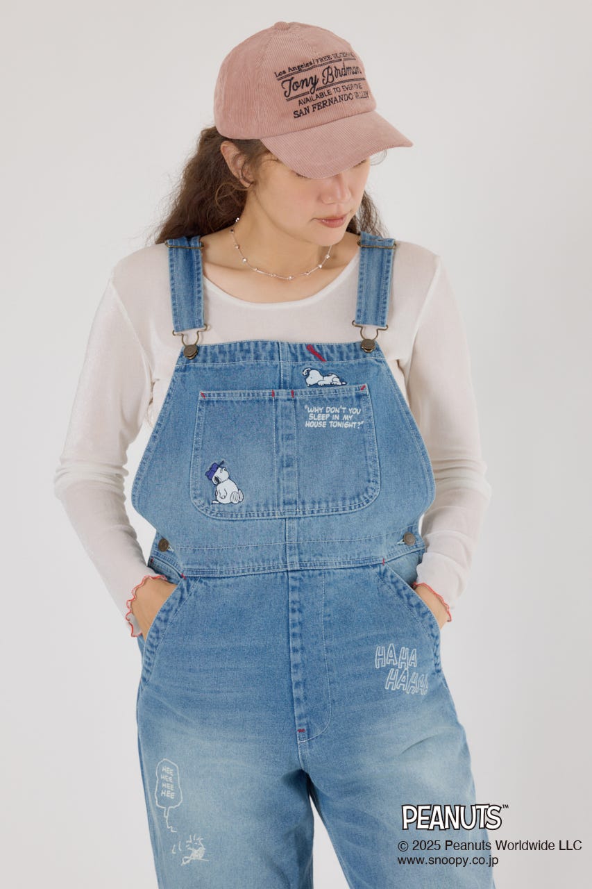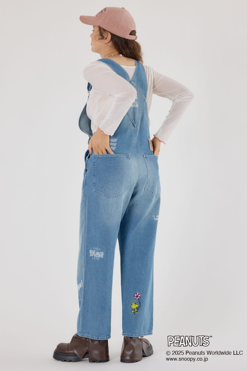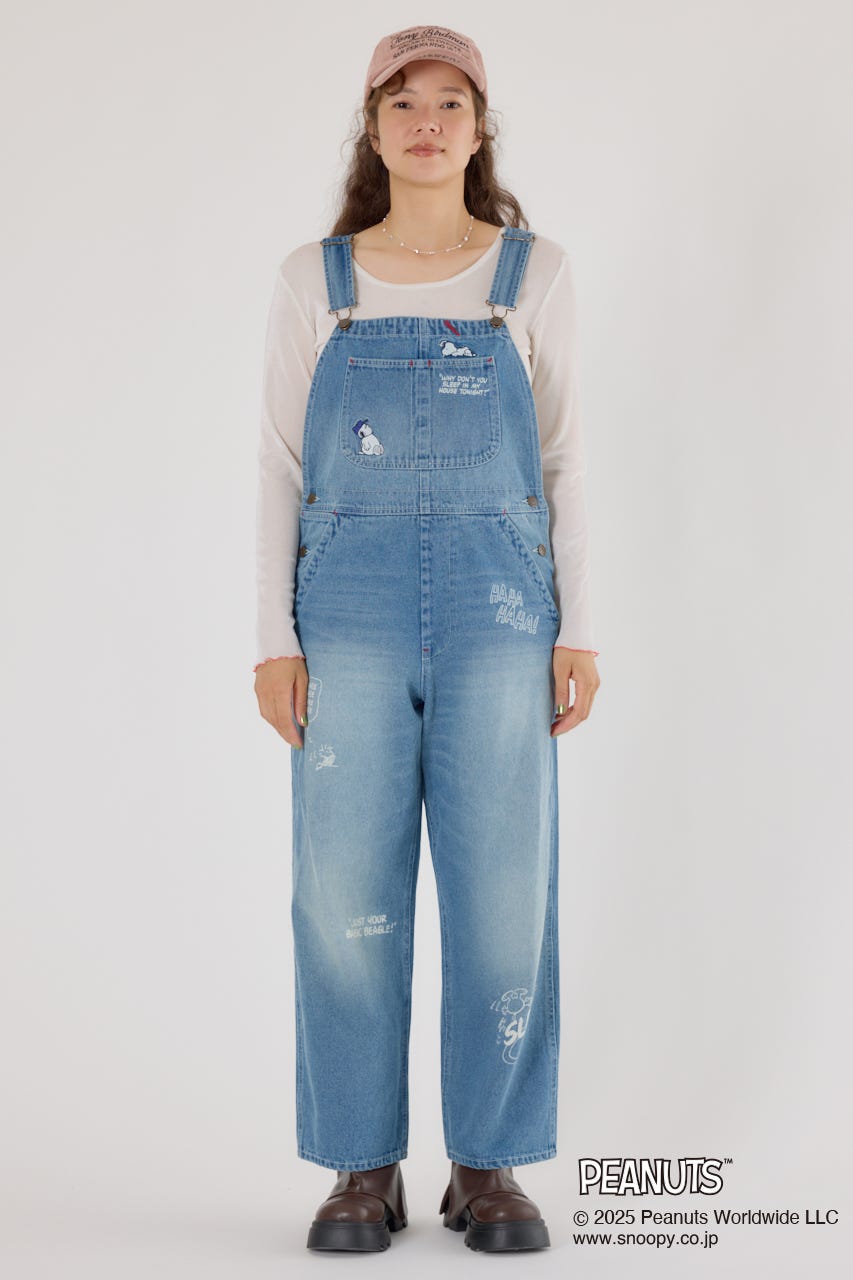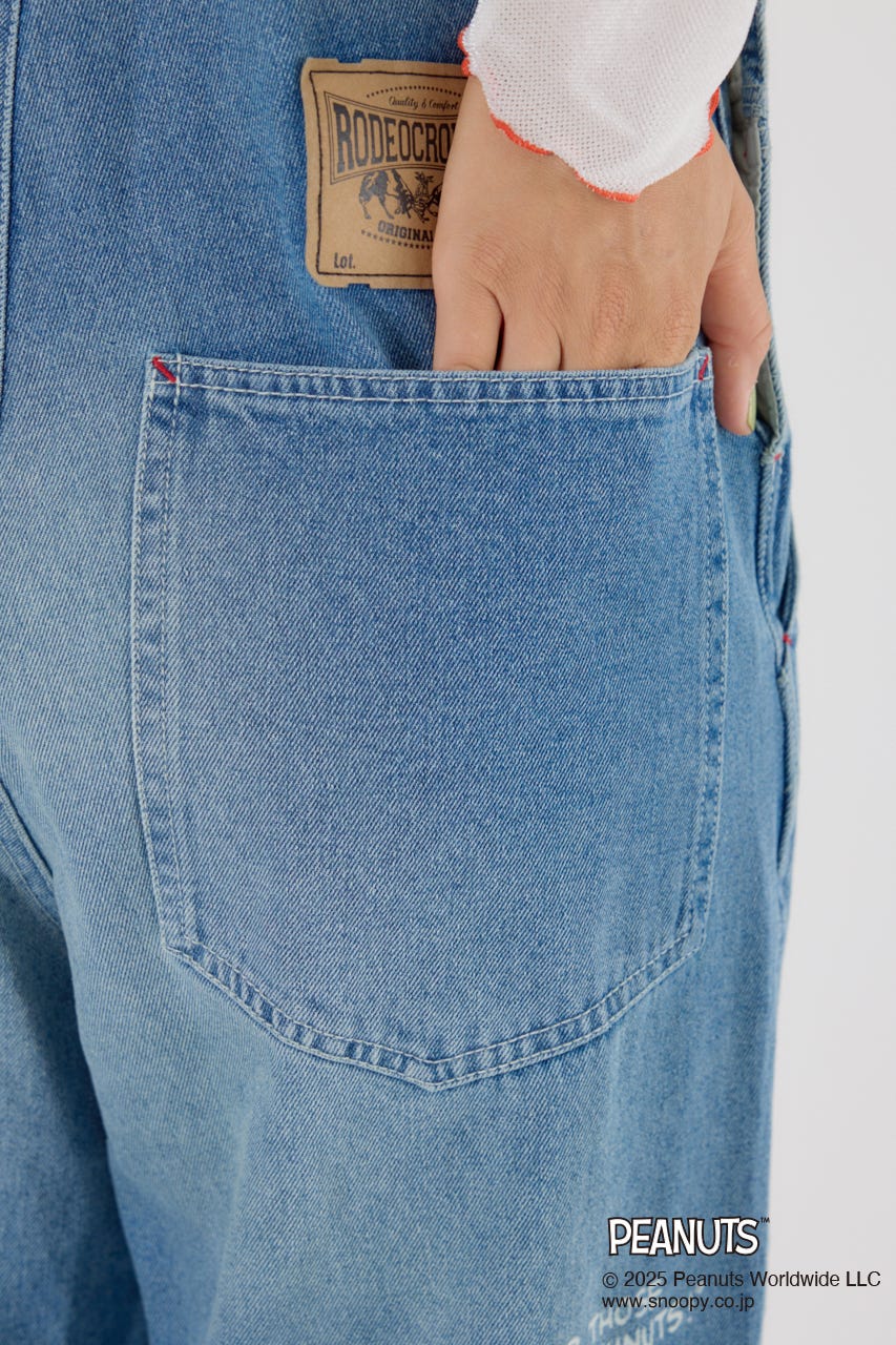 RODEOならではの着こなしやすいオーバーオールに刺繍やプリントでのったPEANUTSキャラ達がかわいいスペシャルな1枚。