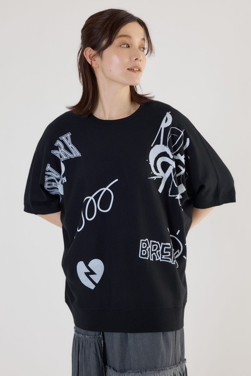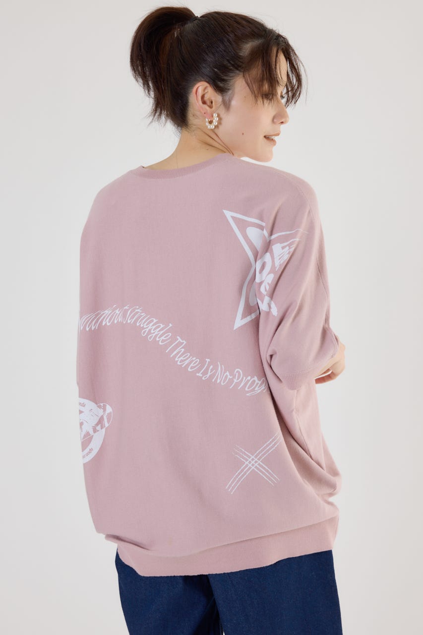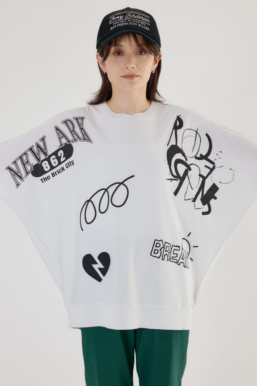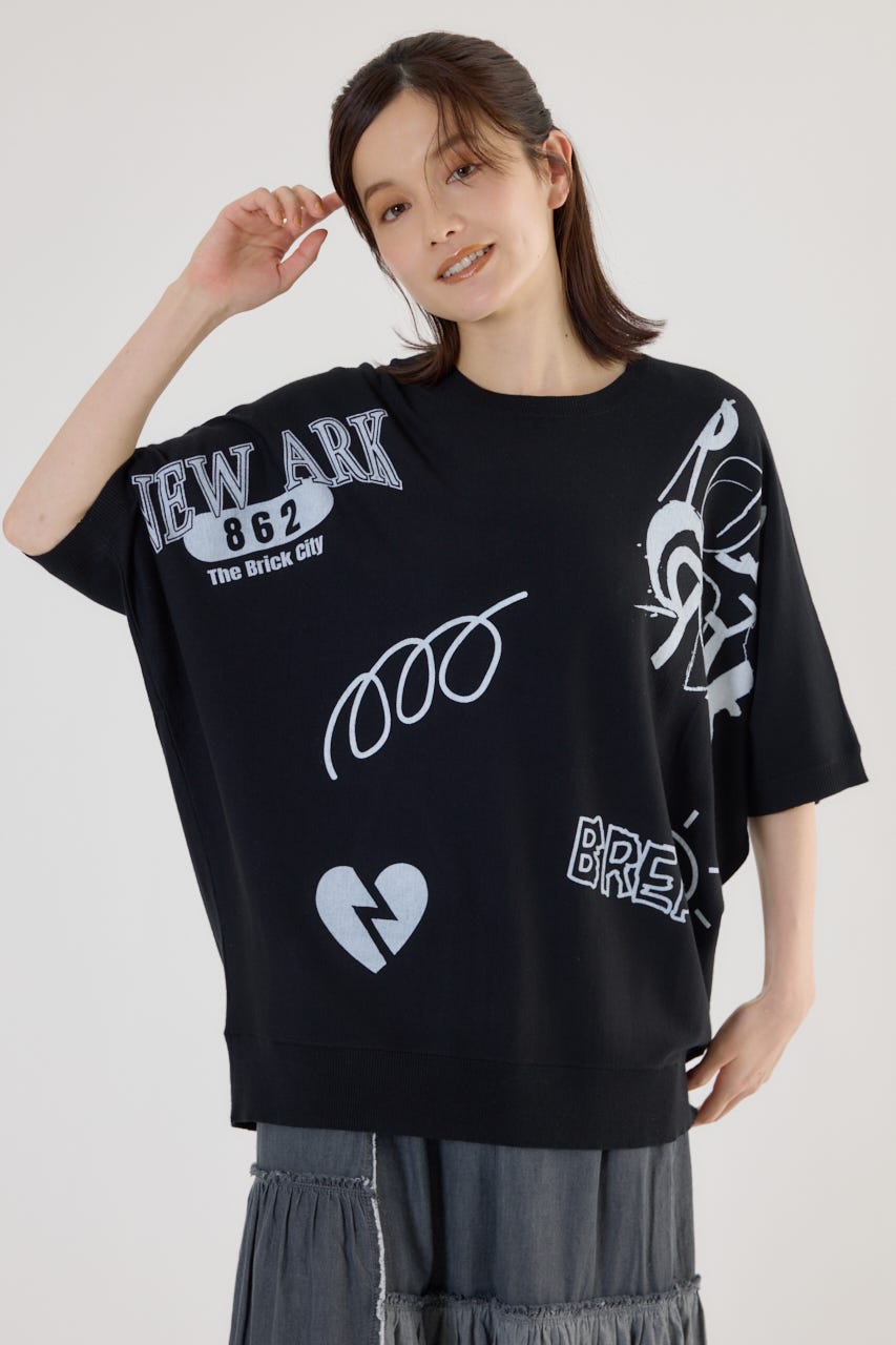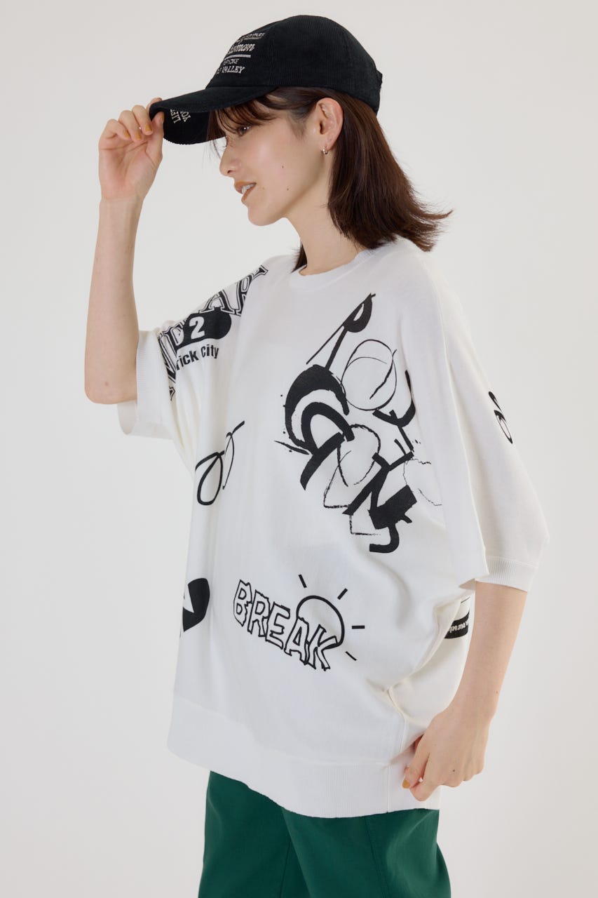 モチーフがランダムに散りばめられたドルマン型ニットトップス。