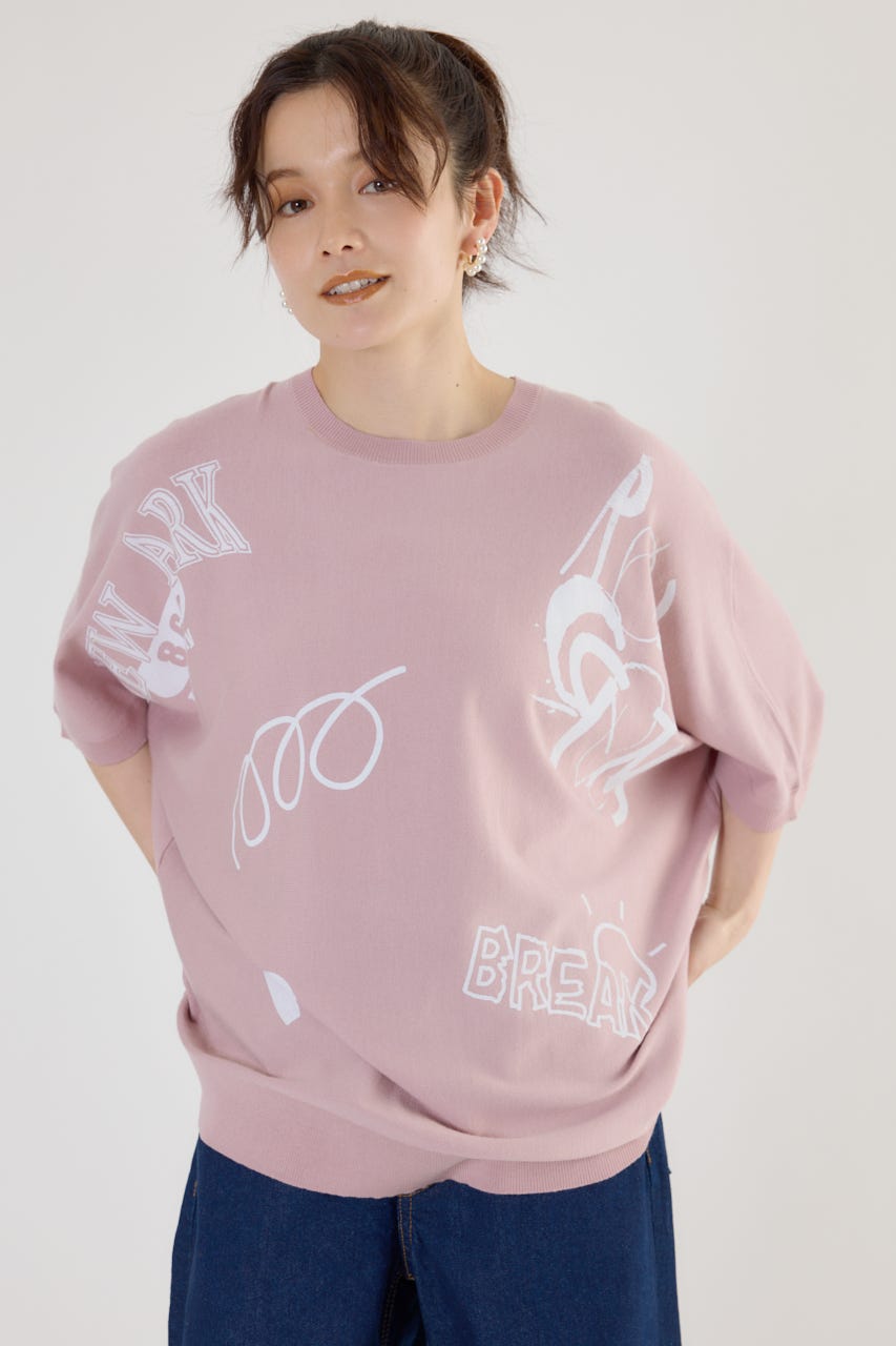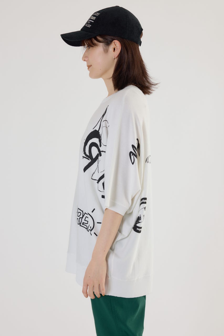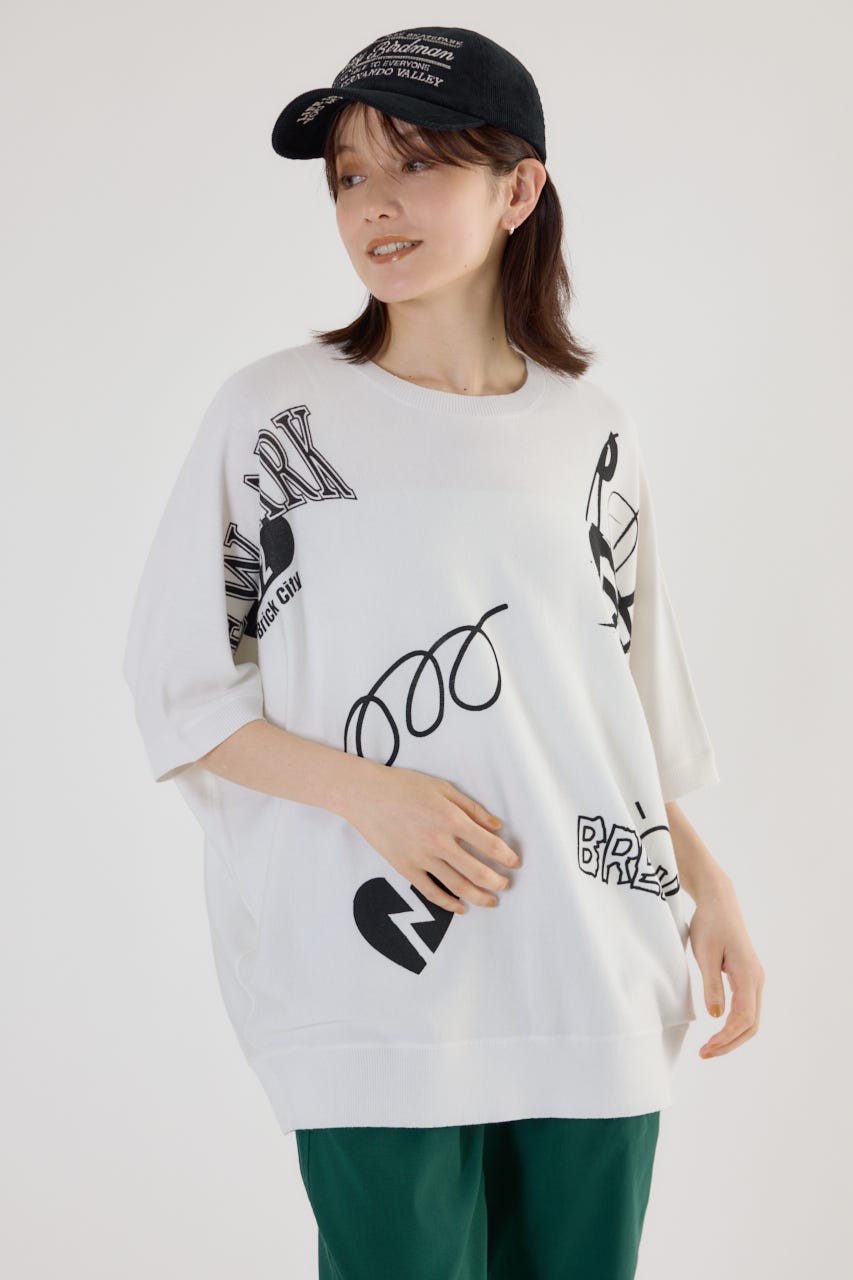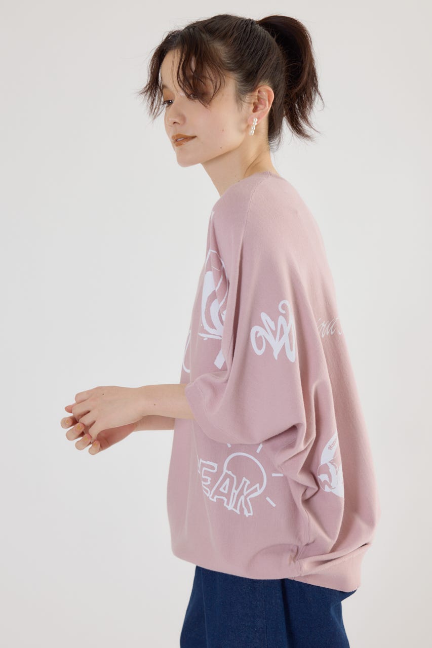 モチーフがランダムに散りばめられたドルマン型ニットトップス。