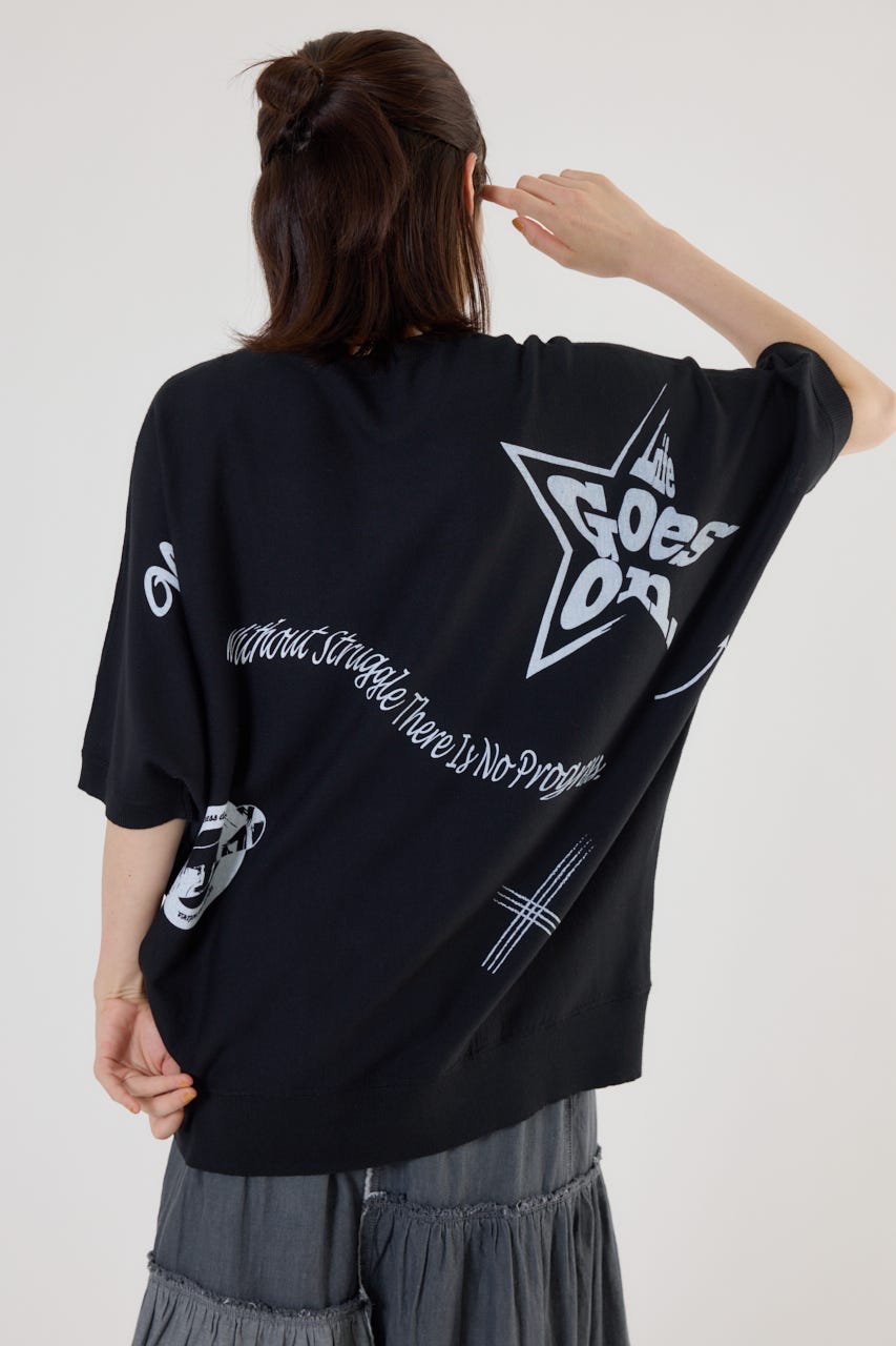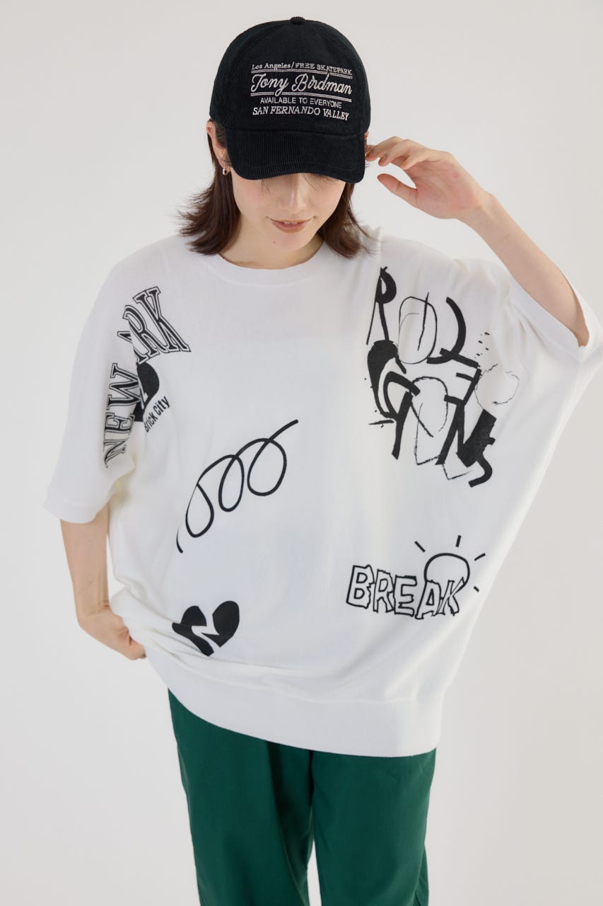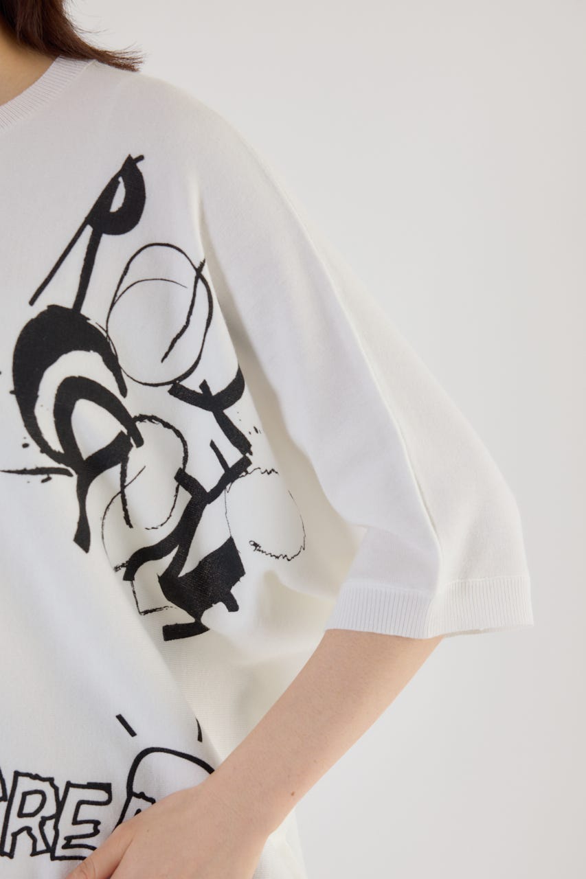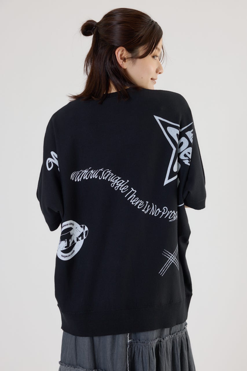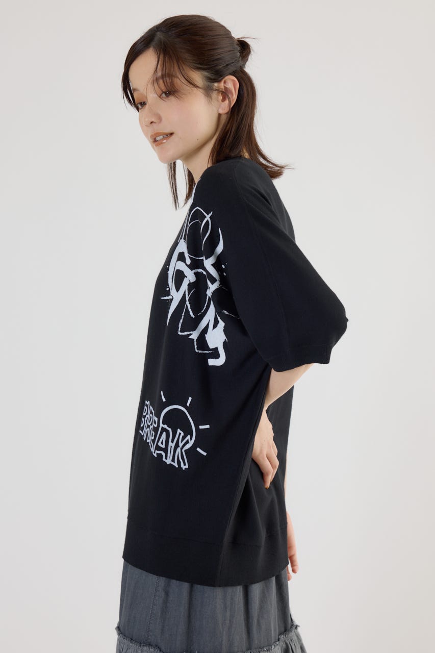 モチーフがランダムに散りばめられたドルマン型ニットトップス。