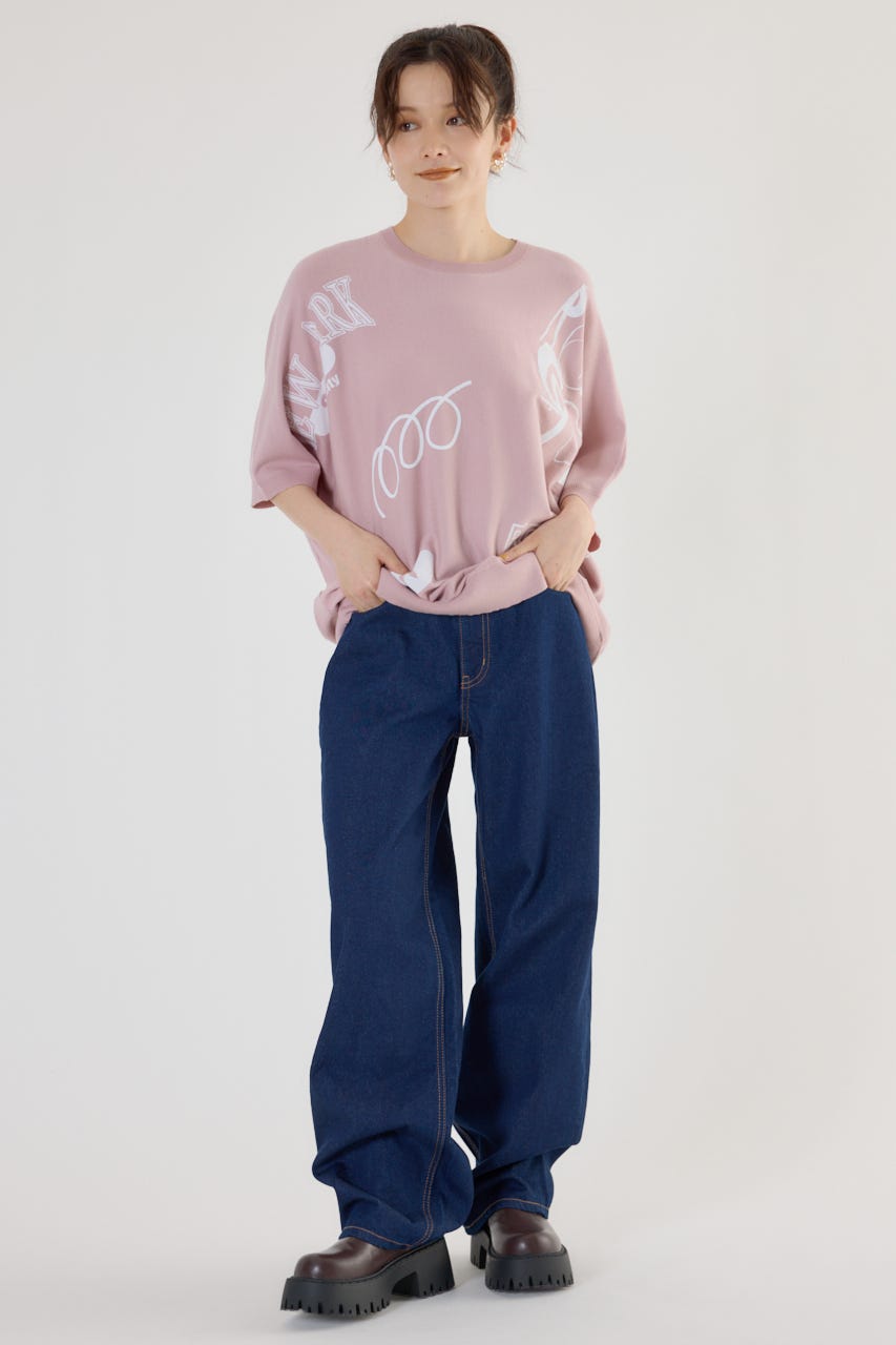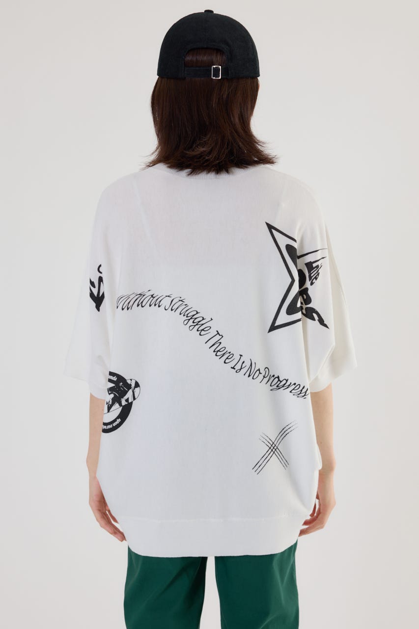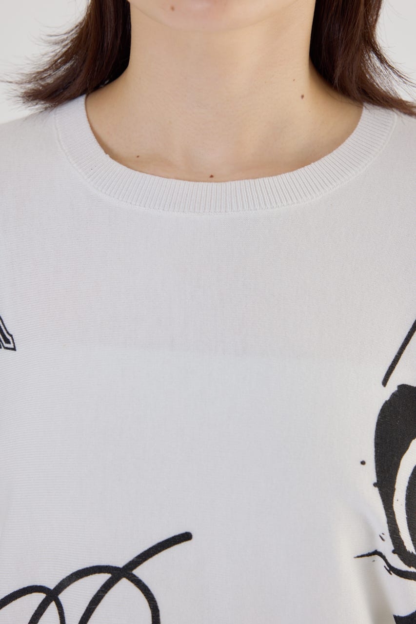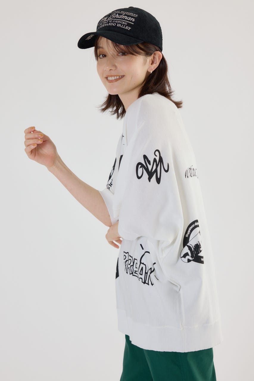 モチーフがランダムに散りばめられたドルマン型ニットトップス。